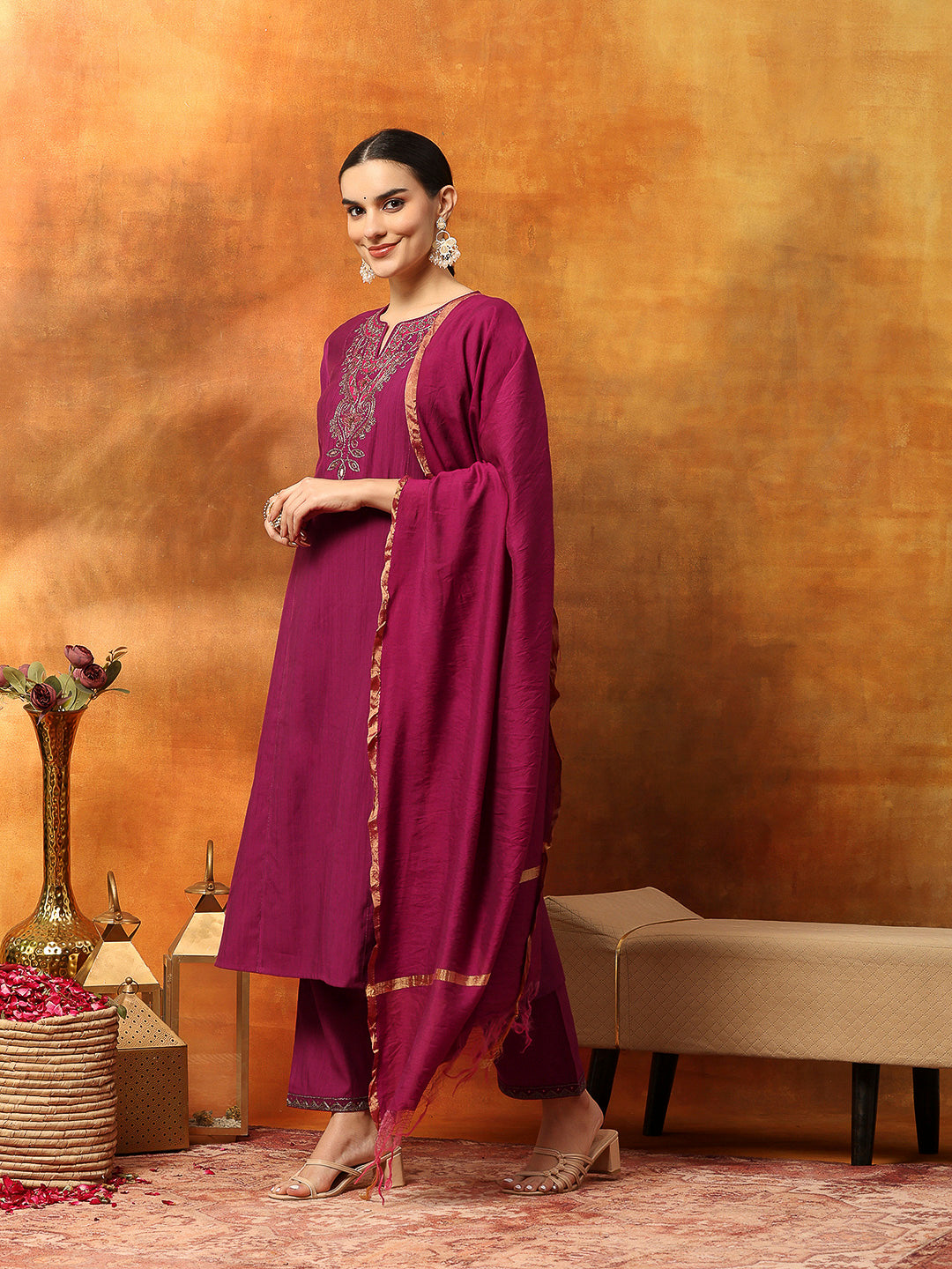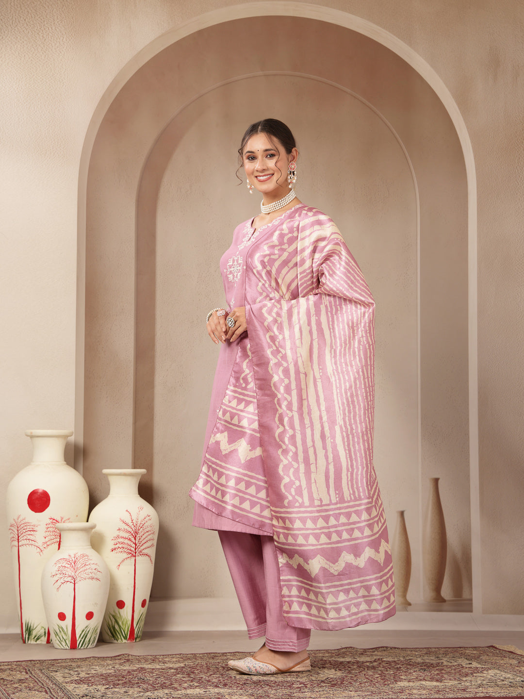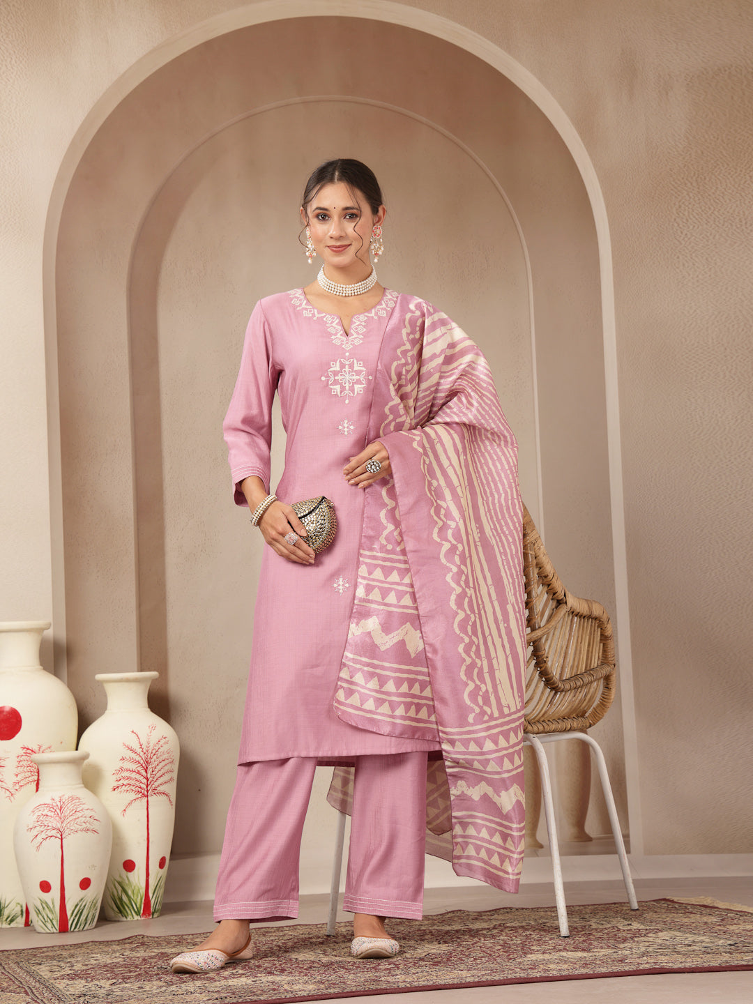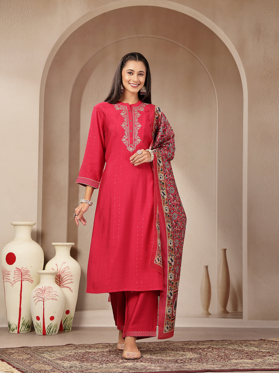 Vetican Fabric Kurta Set with Embroidered Round Neck, Palazzo & Striped Silk Dupatta