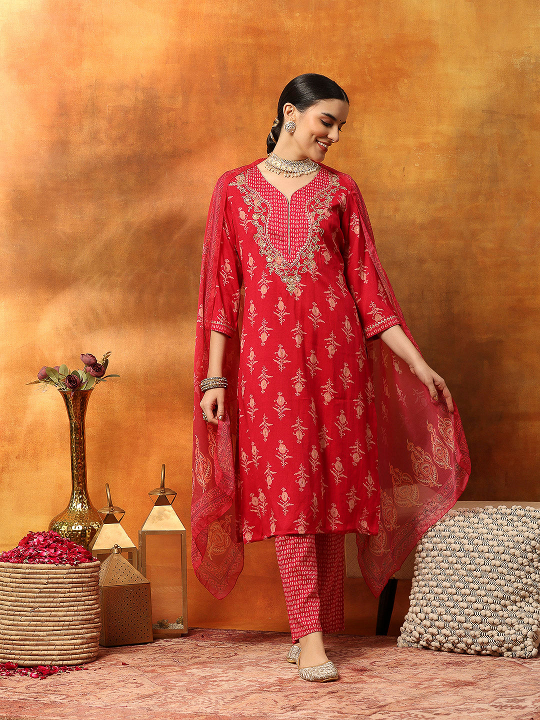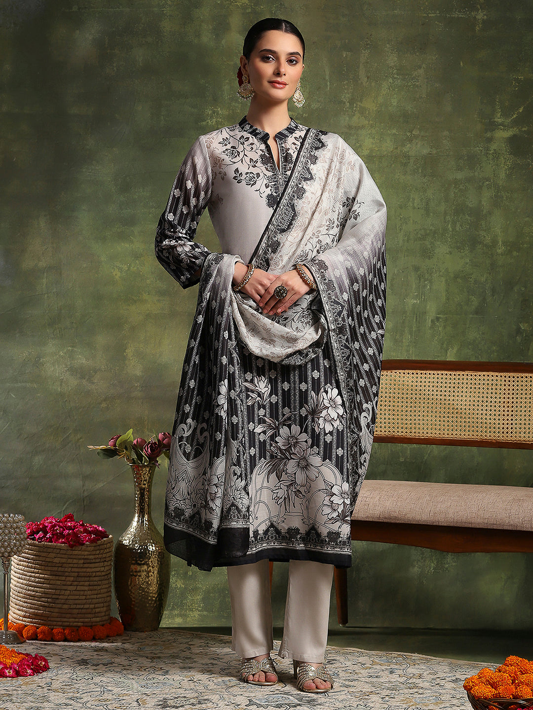 Floral Yoke Embroidered Straight Kurta Set with Printed Chiffon Dupatta