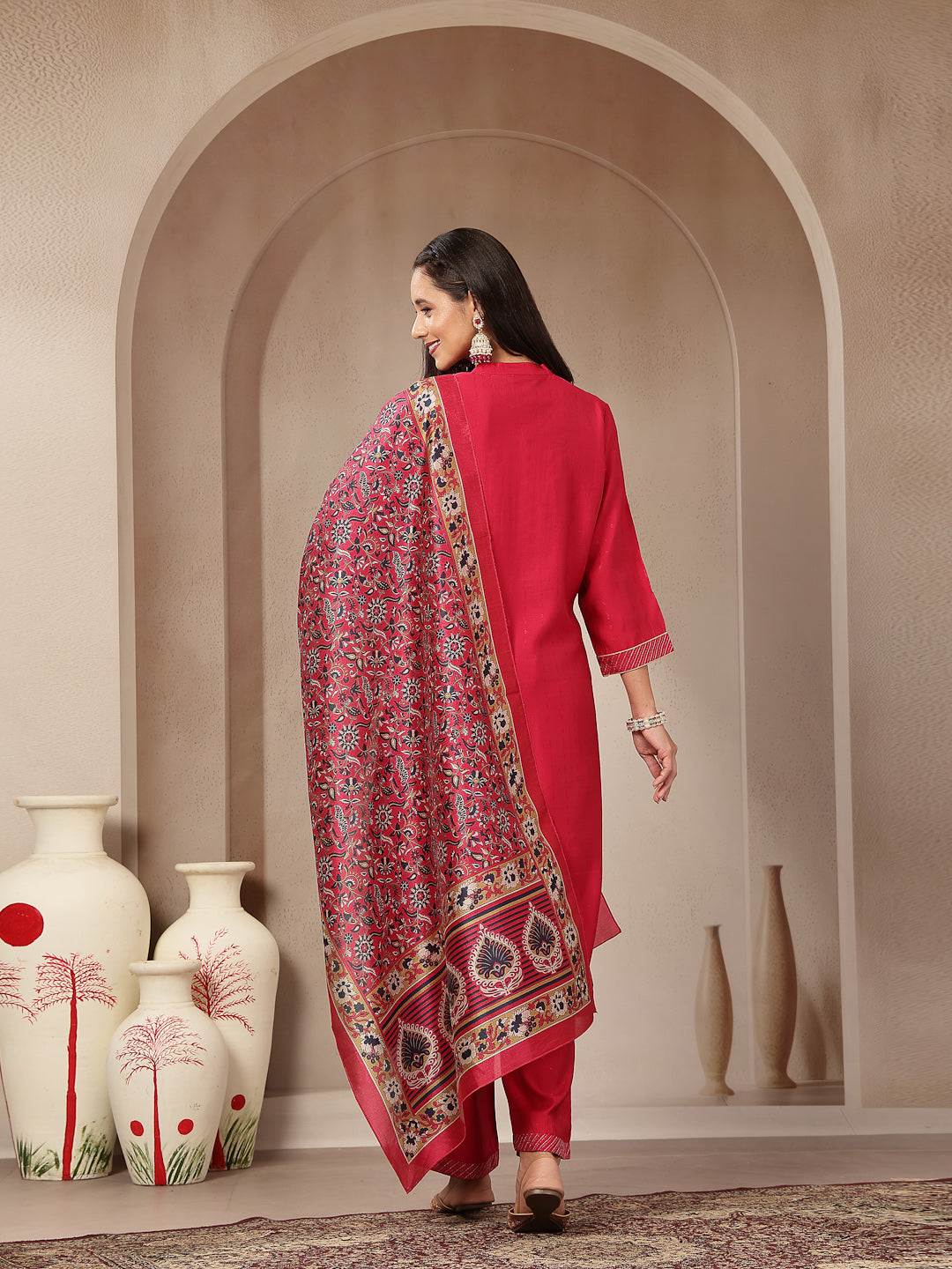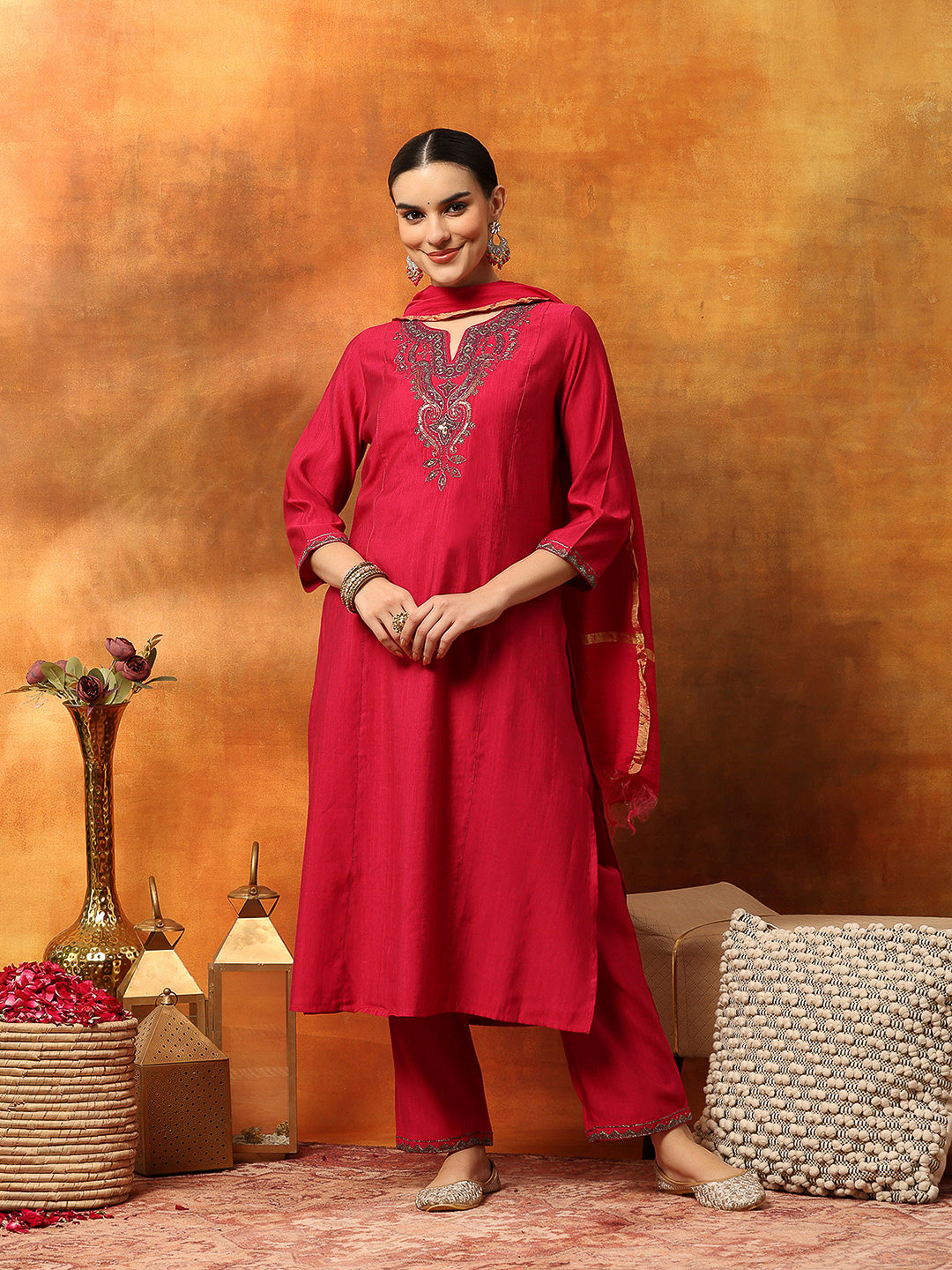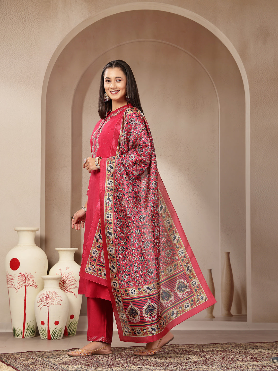 Art Silk Embroidered Kurta Set with Palazzo & Silk Dupatta