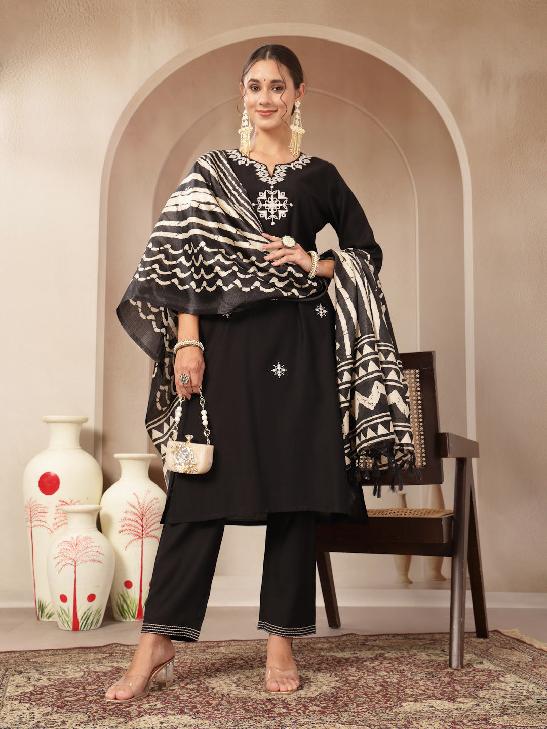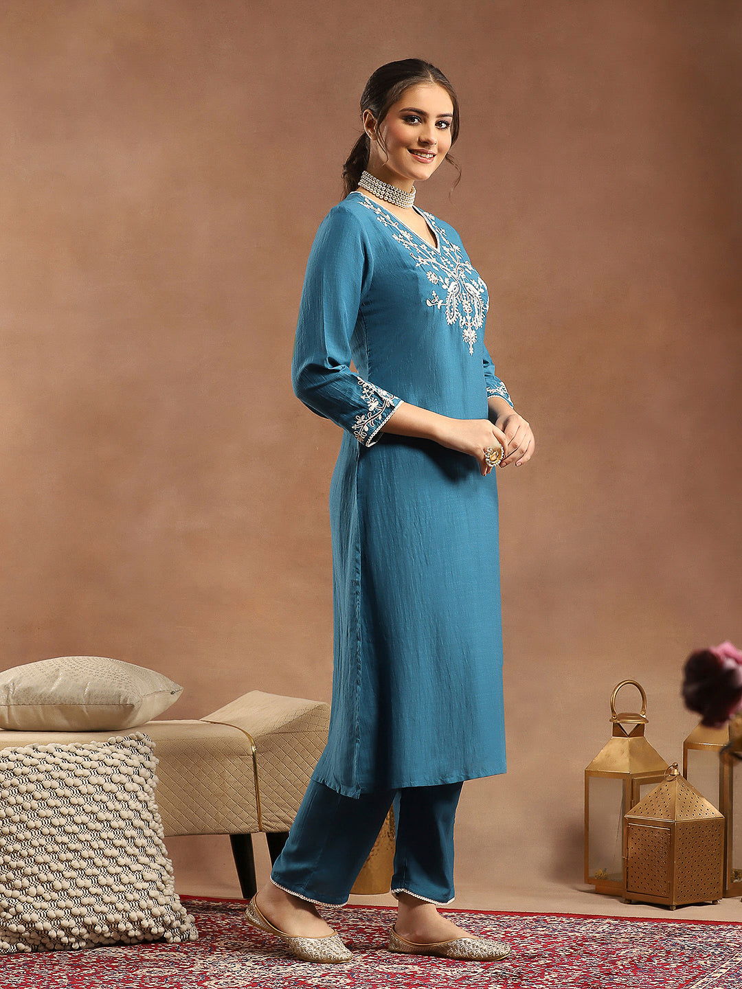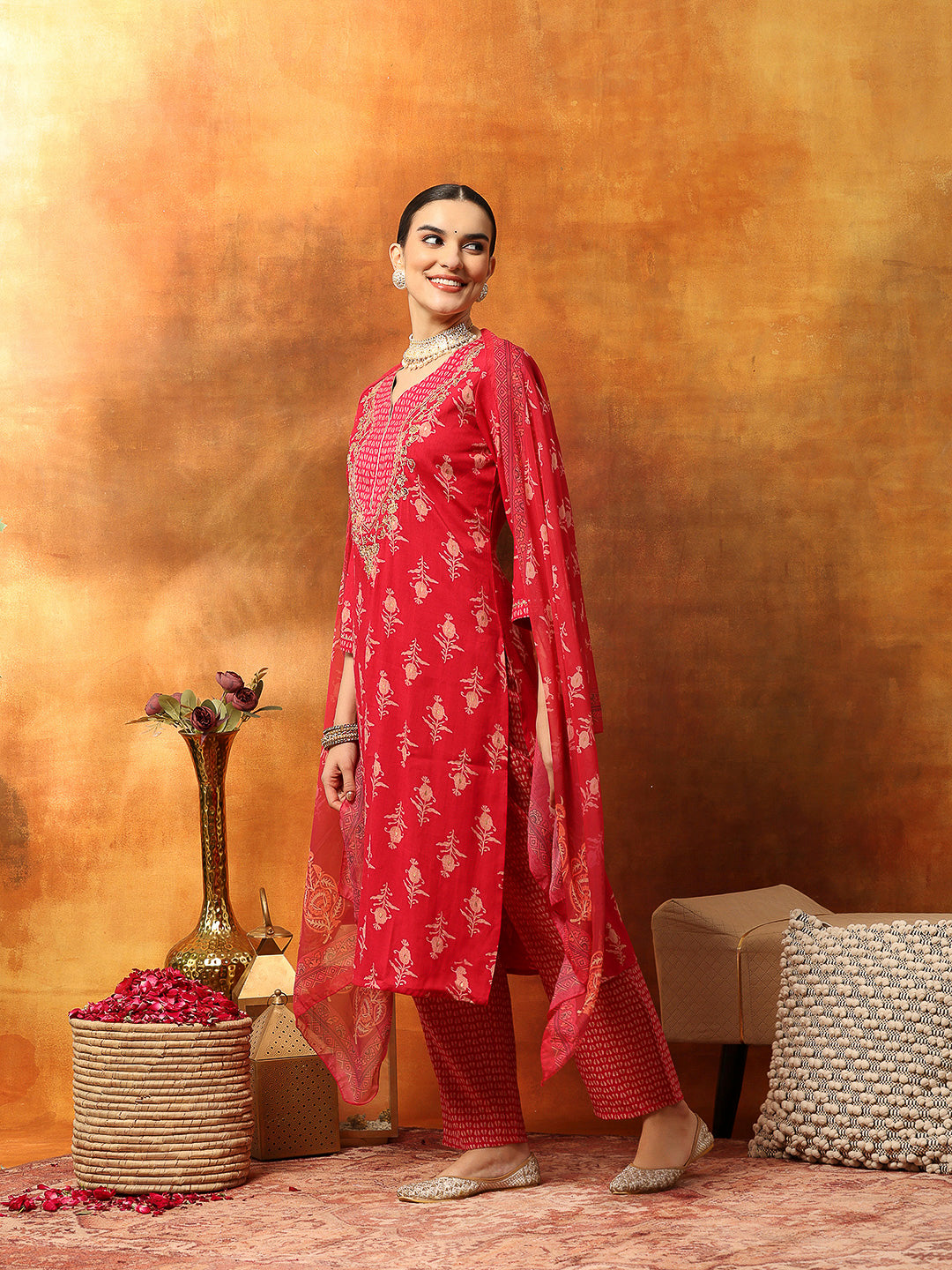 Thread Embroidered V-Neck Cotton Kurta Set with Palazzo & Solid Dupatta