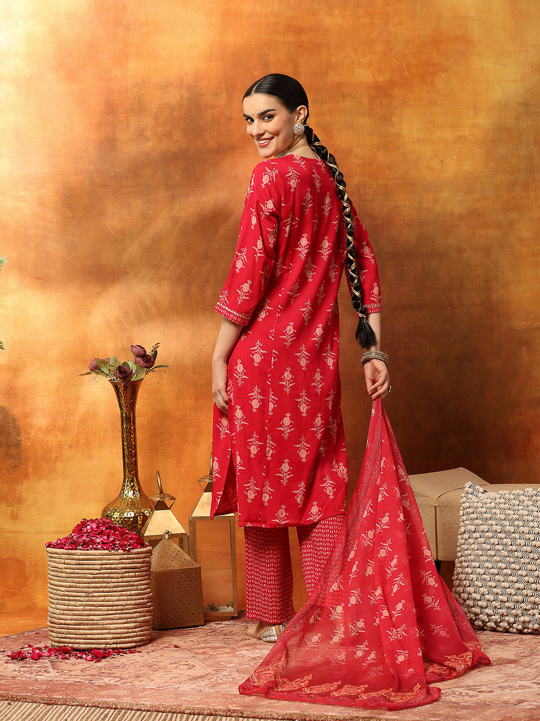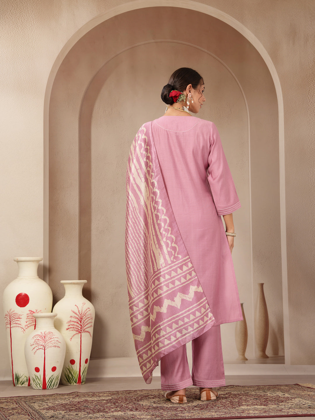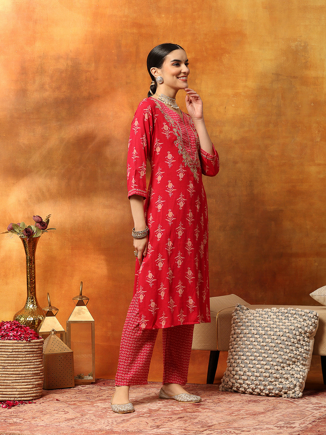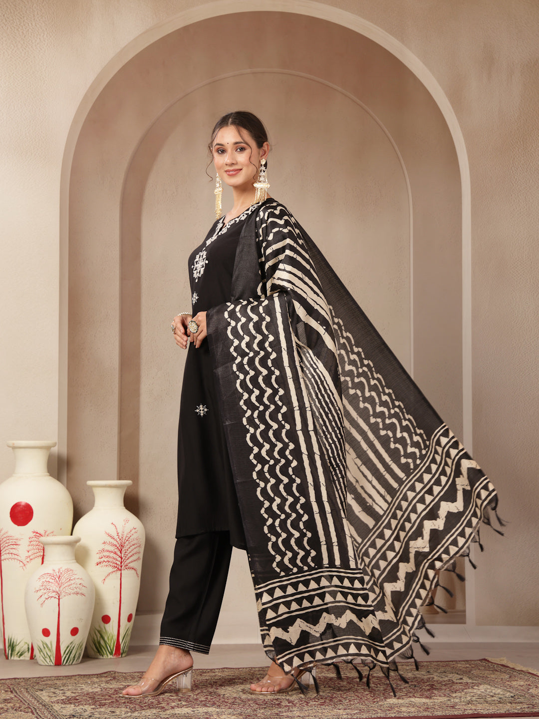 Thread Embroidered V-Neck Cotton Kurta Set with Palazzo & Solid Dupatta