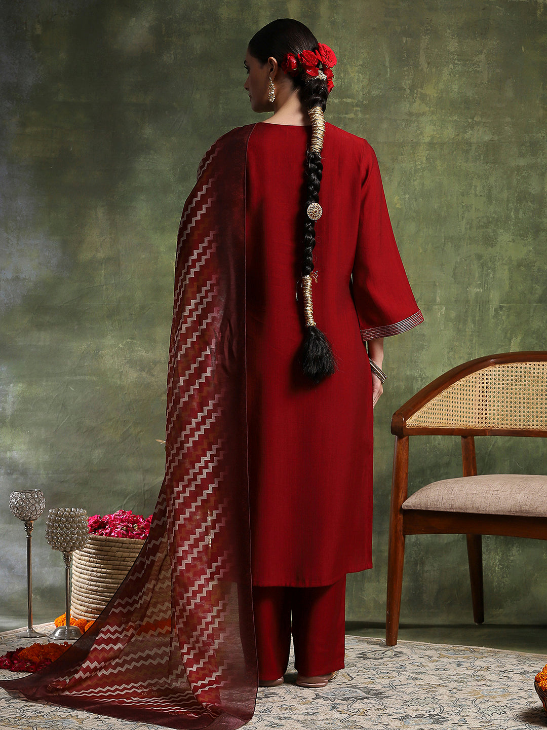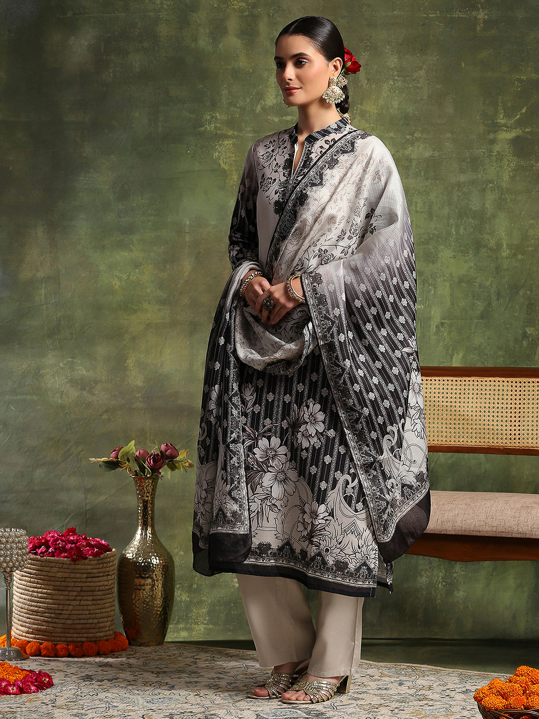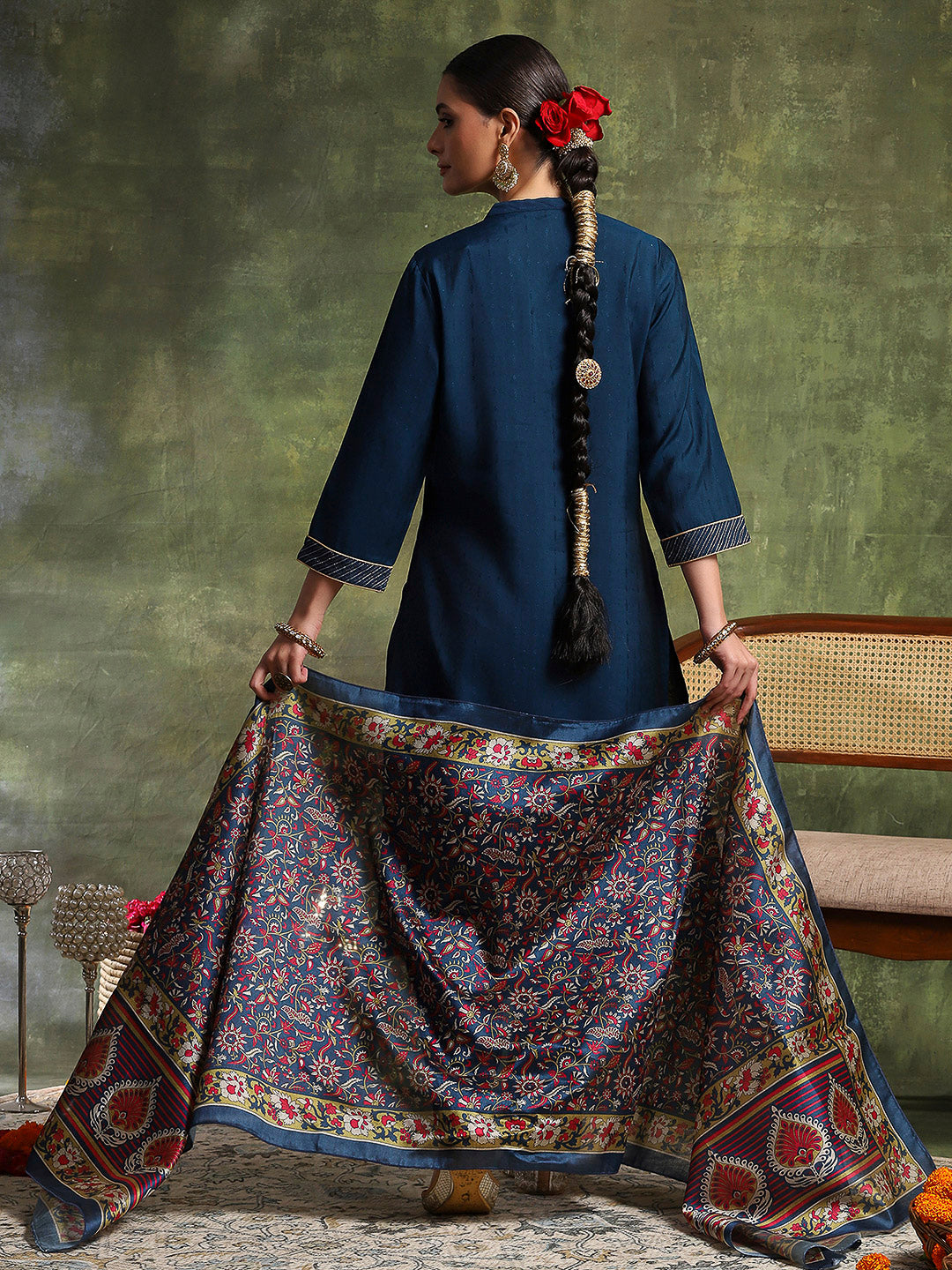 Paisley Wool Blend Kurta Set with Swarovski Detailing & Chiffon Dupatta