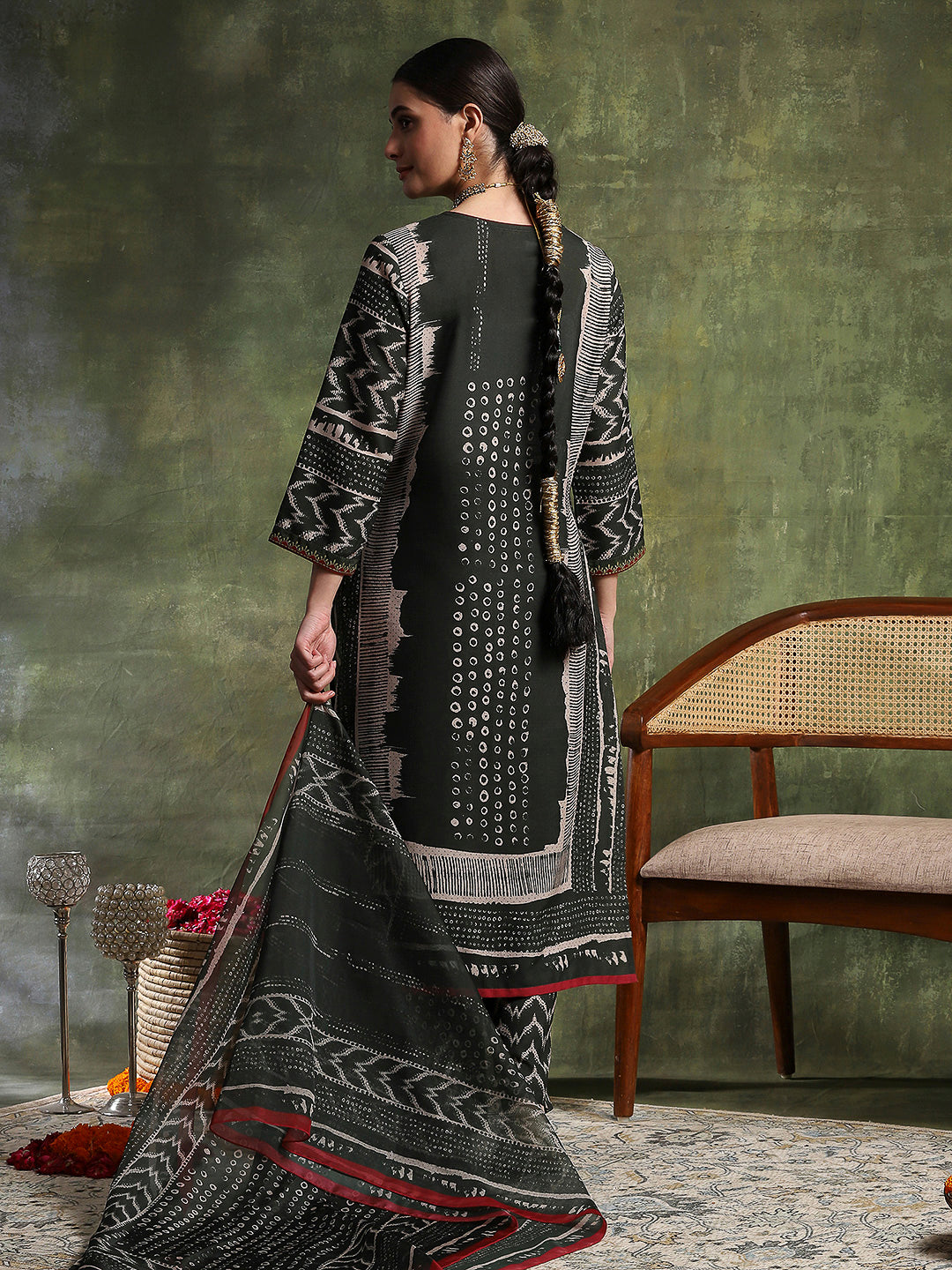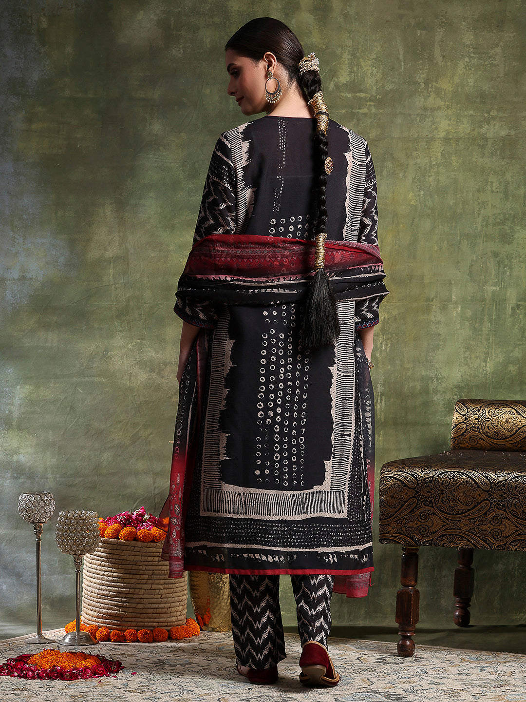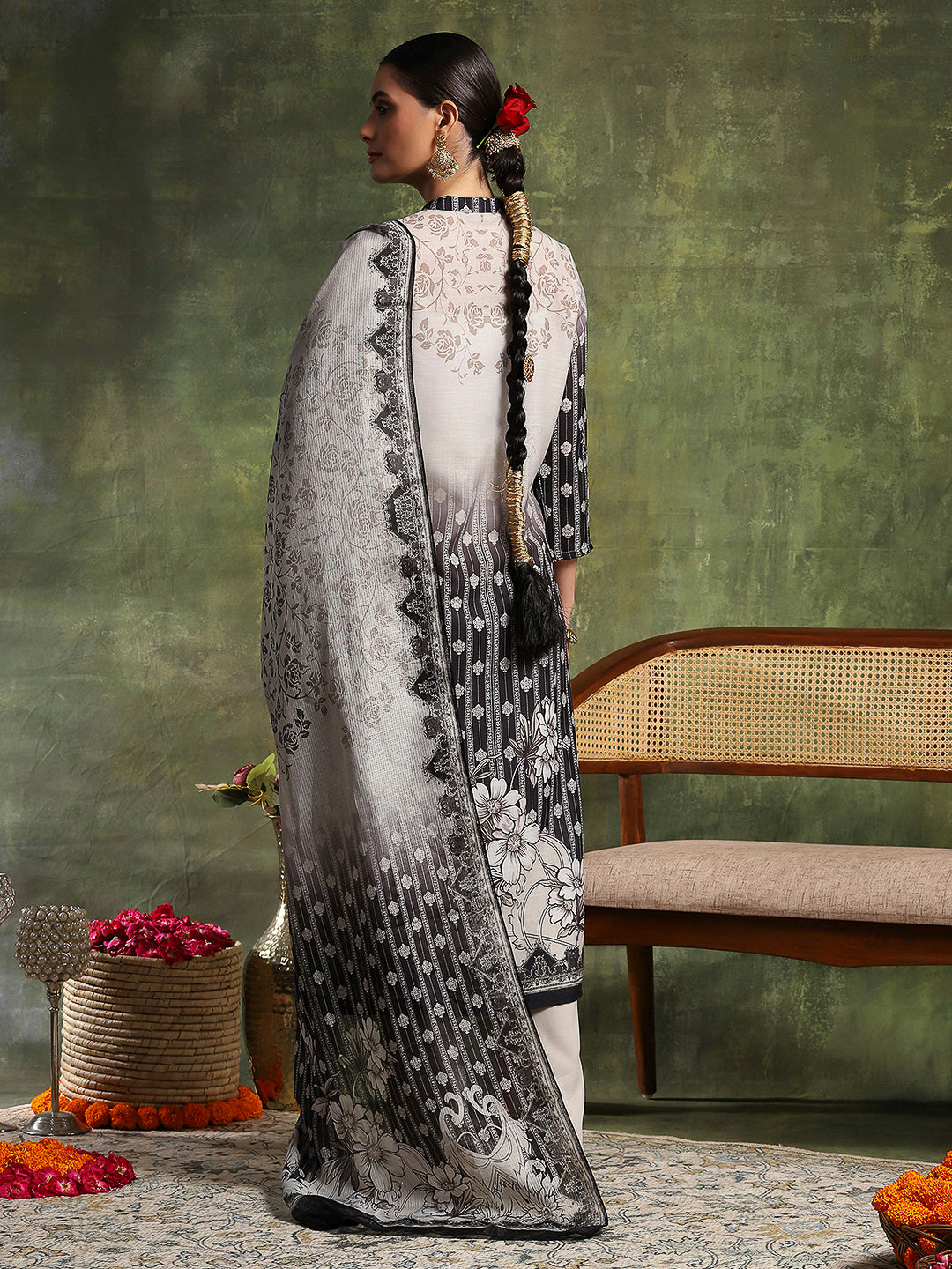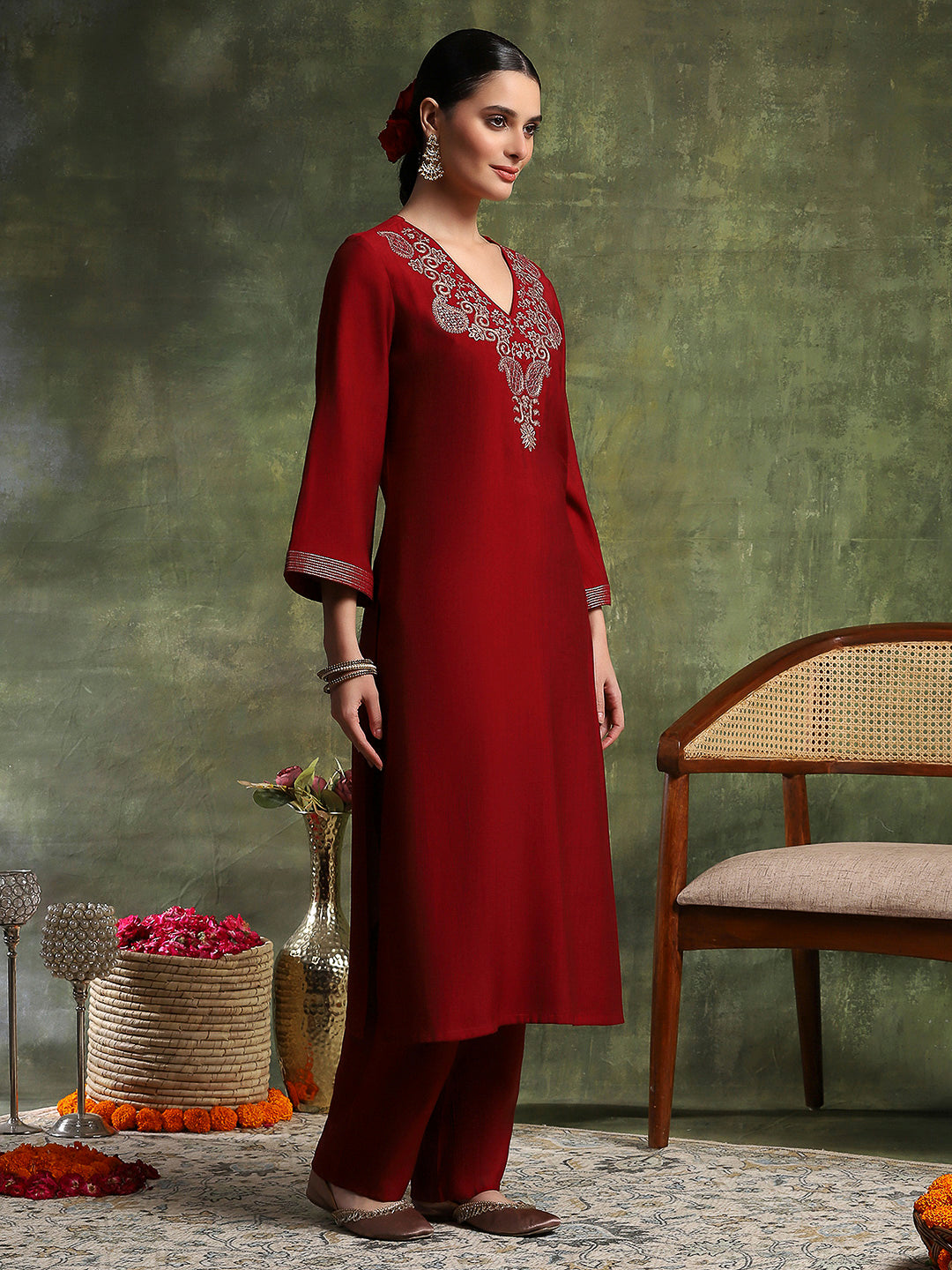 Paisley Wool Blend Kurta Set with Swarovski Detailing & Chiffon Dupatta