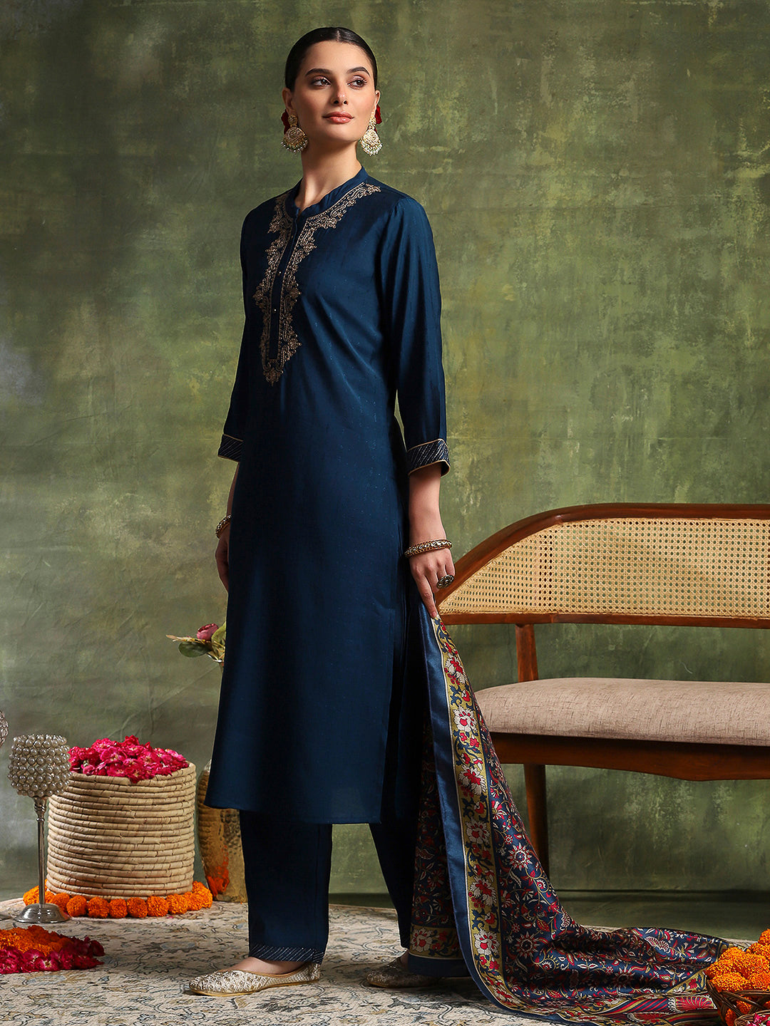 Blended Zari Embroidered Kurta Set with Palazzo & Printed Silk Dupatta