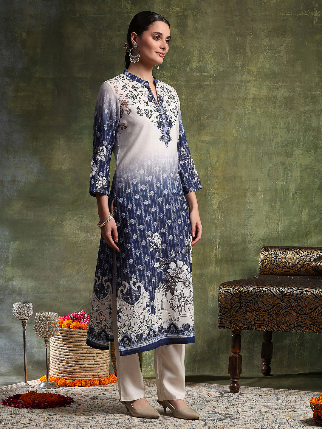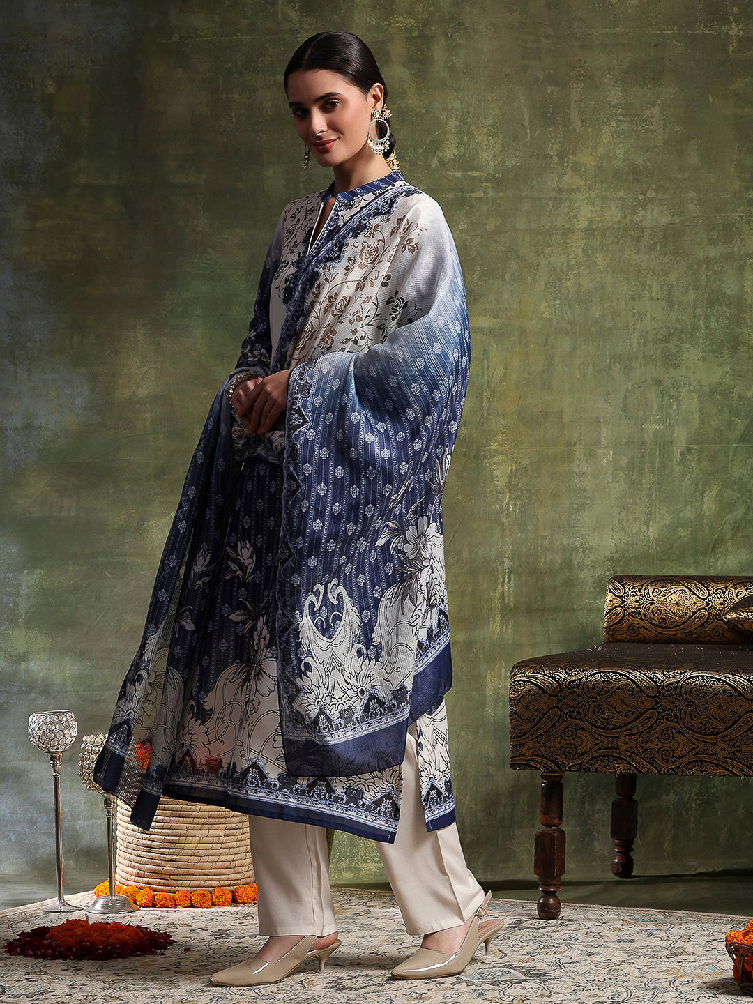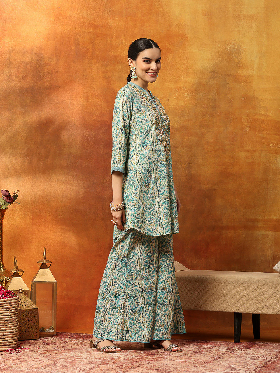 Linen Printed Kurta Set with Swarovski Detailing, Palazzo & Kotta Dupatta