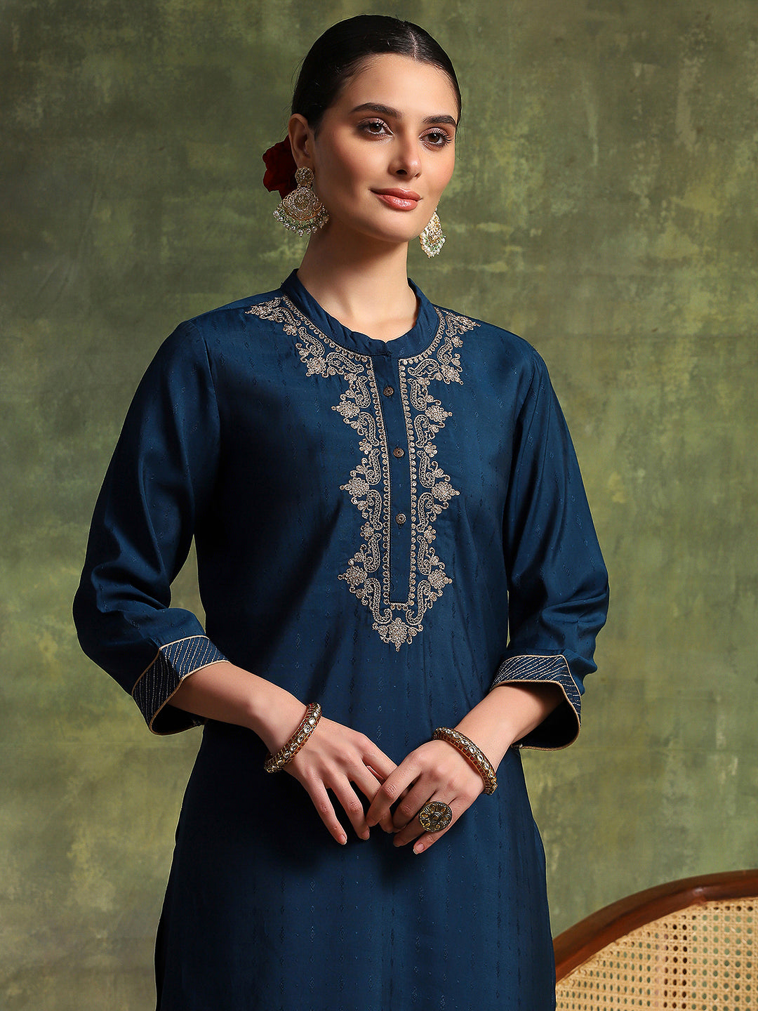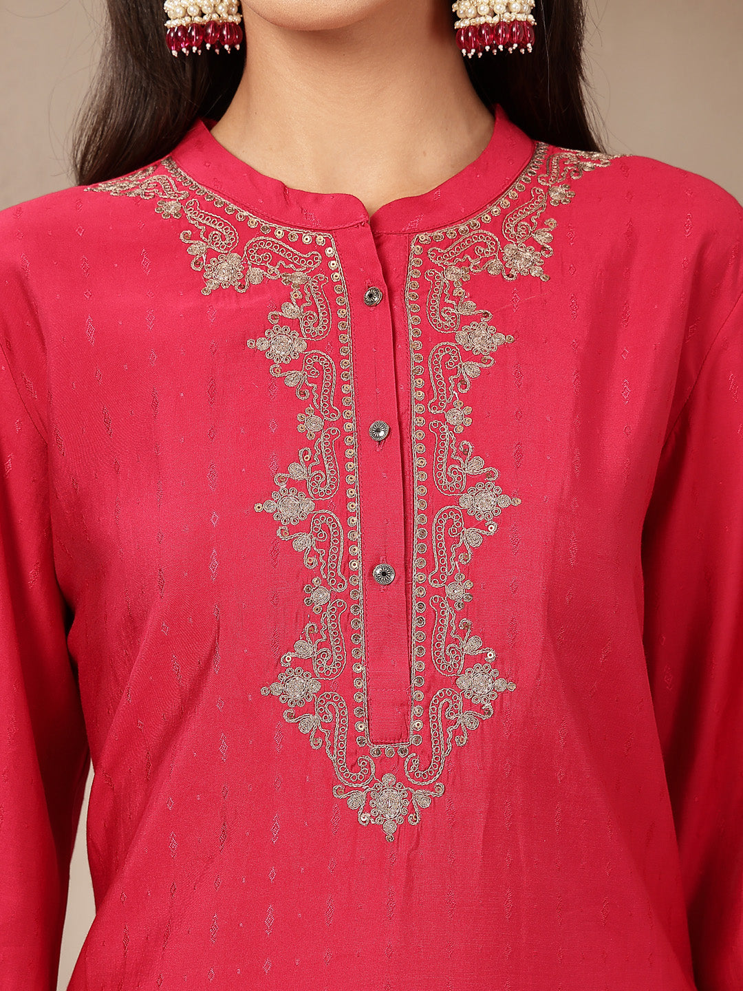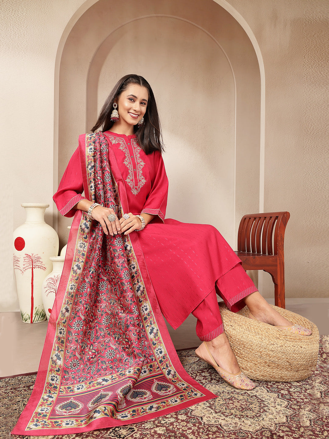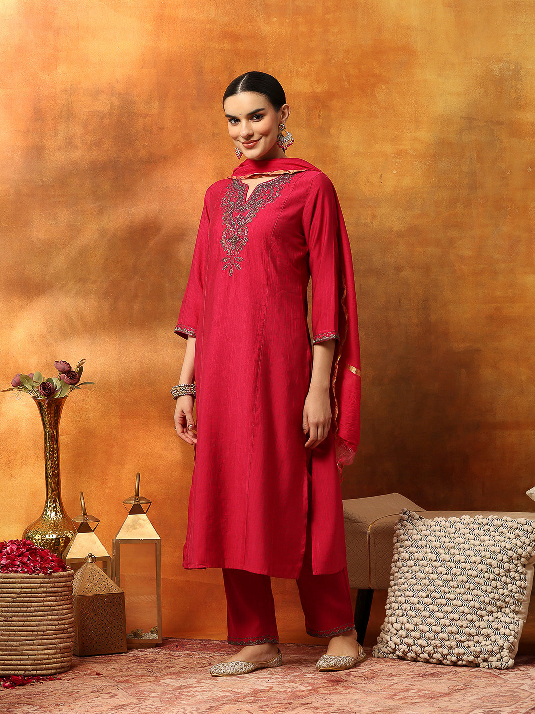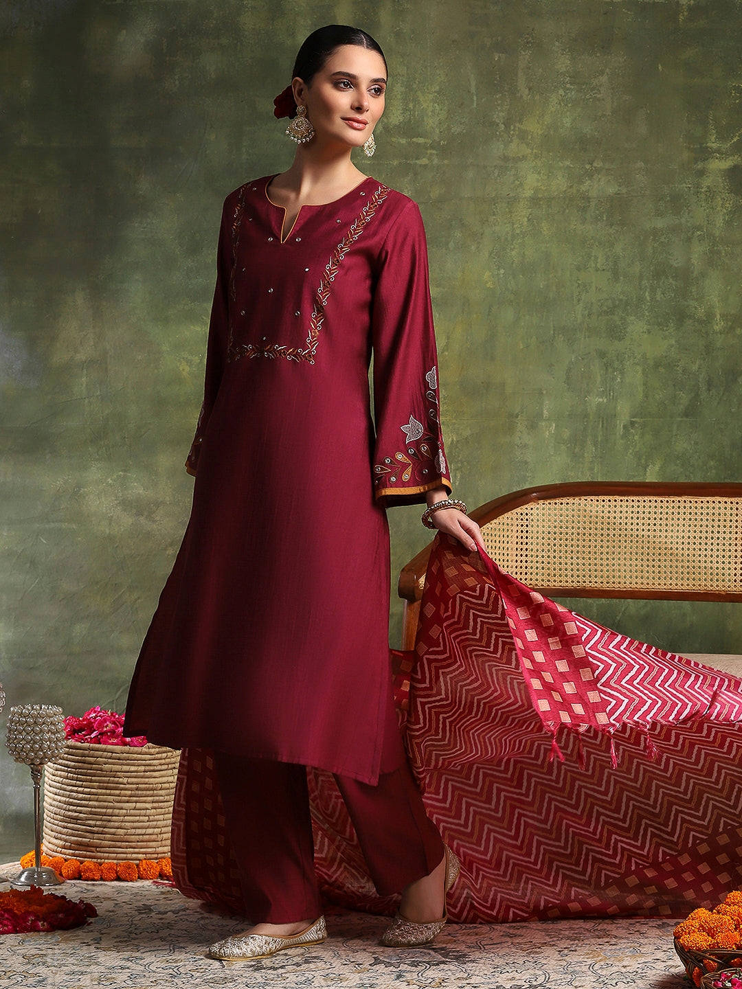 Zari-Embroidered Viscose Blend Kurta Set with Art Silk Dupatta
