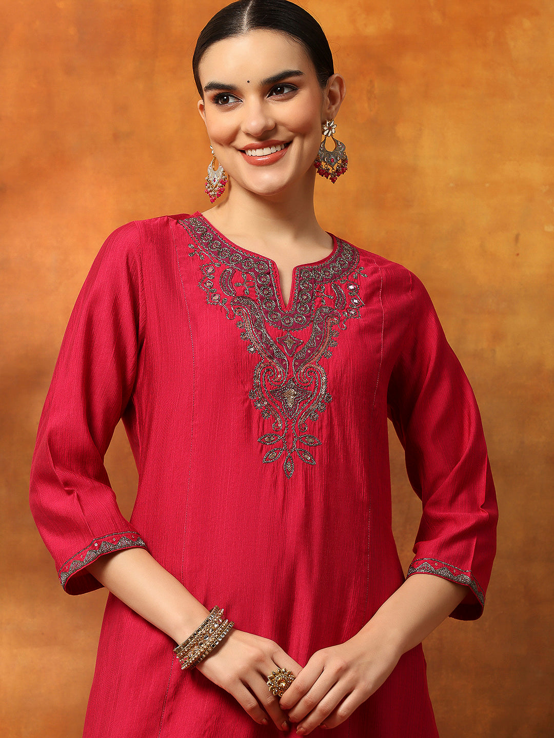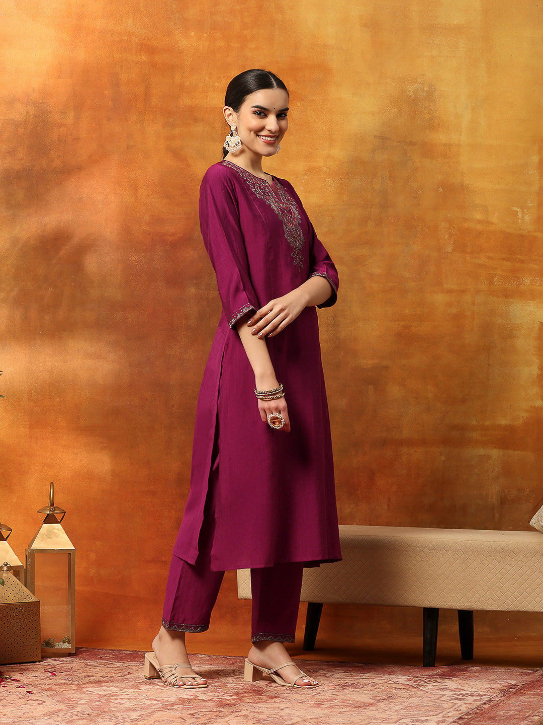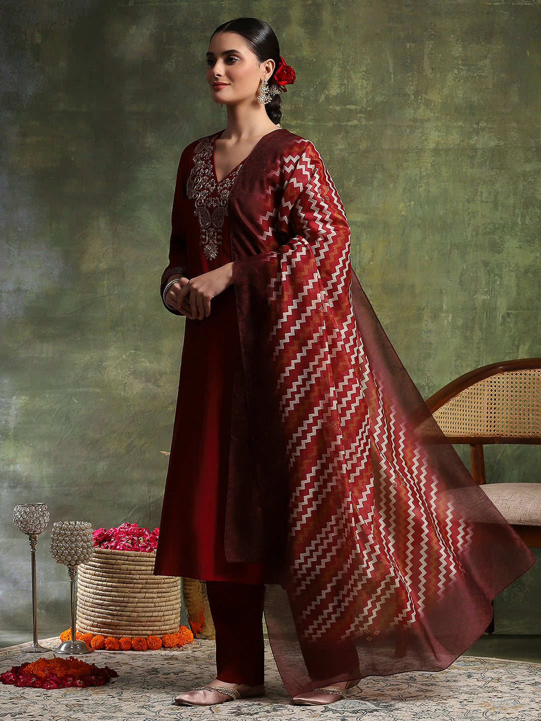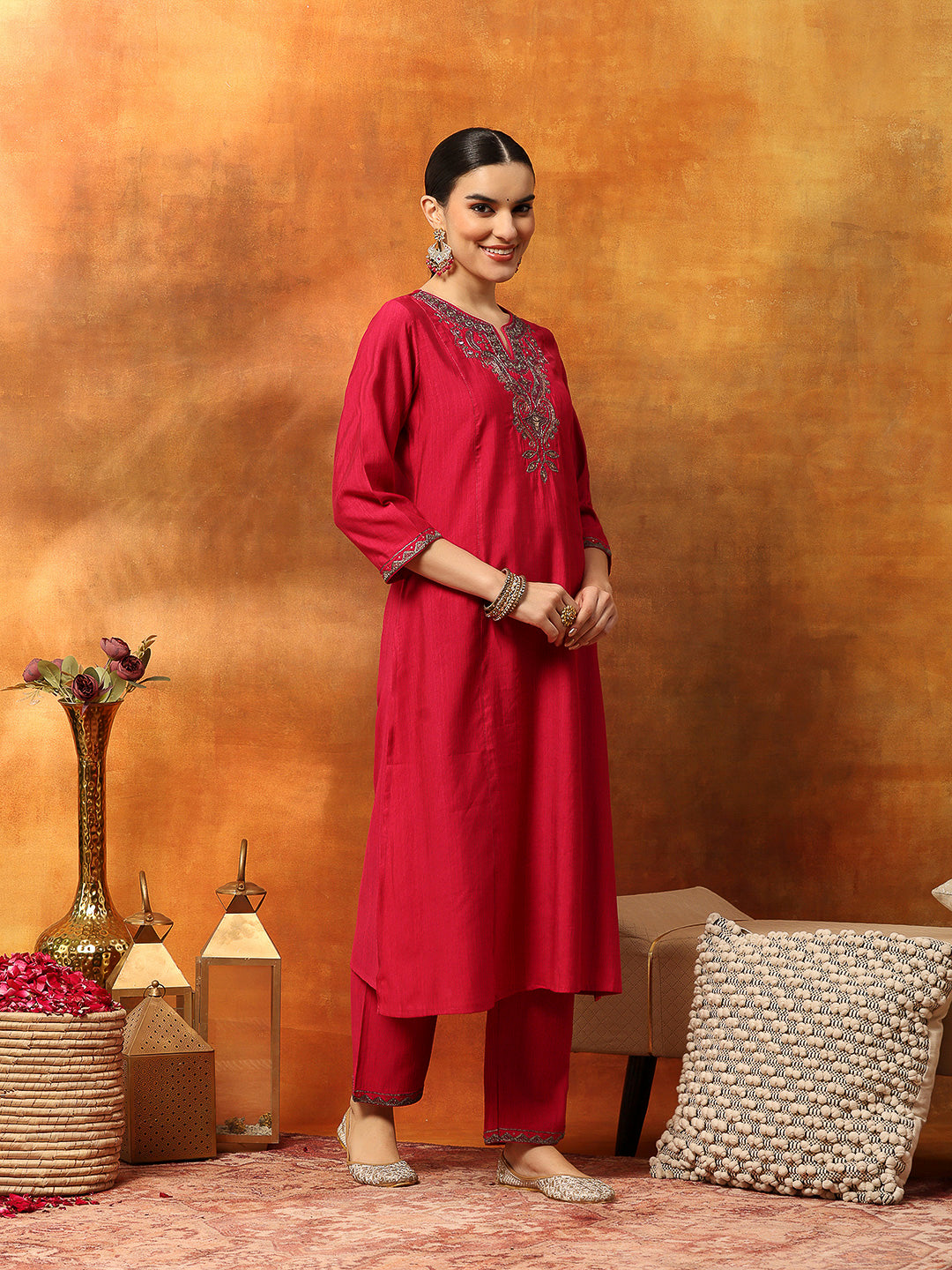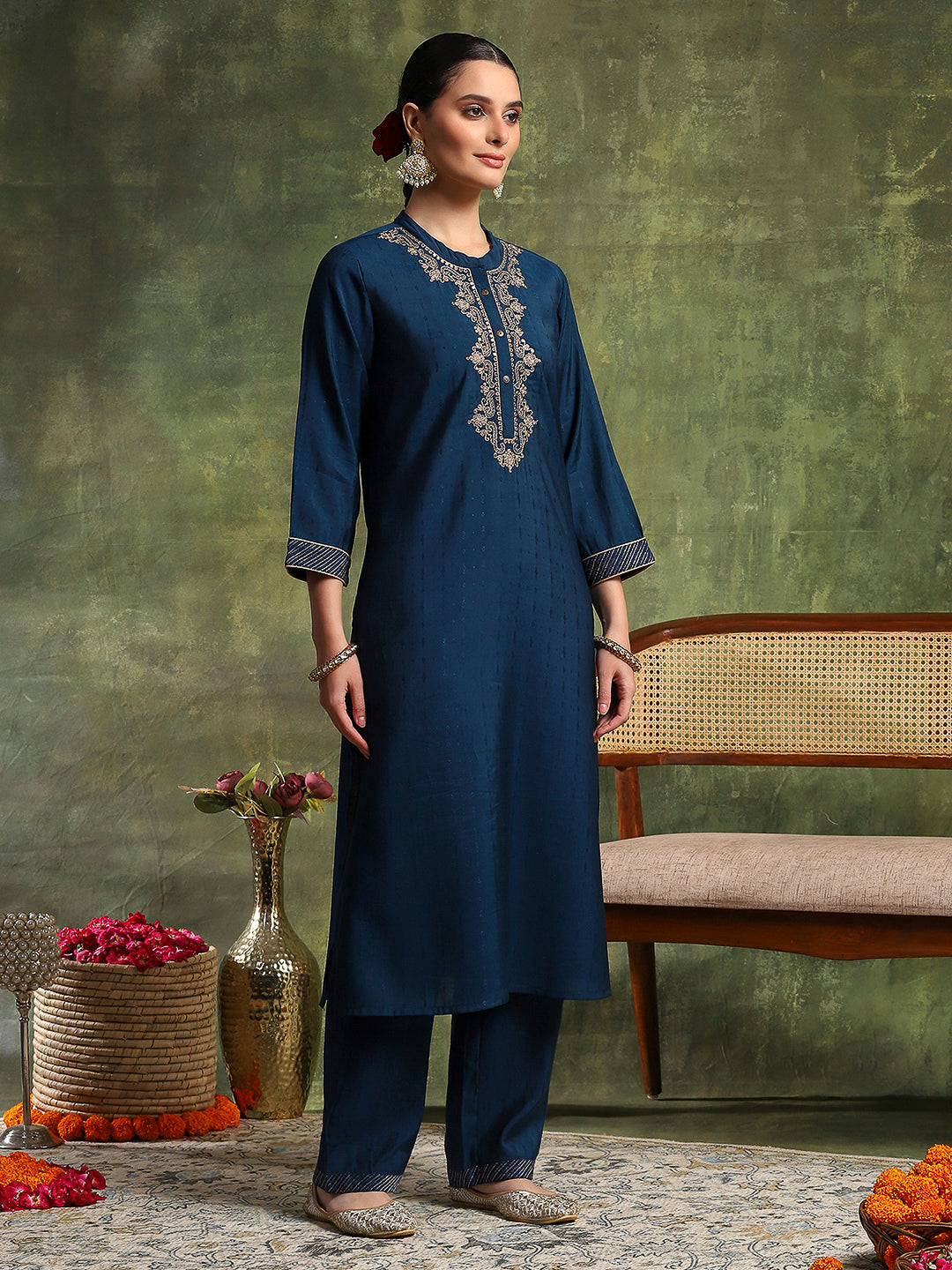 Zari-Embroidered Viscose Blend Kurta Set with Art Silk Dupatta