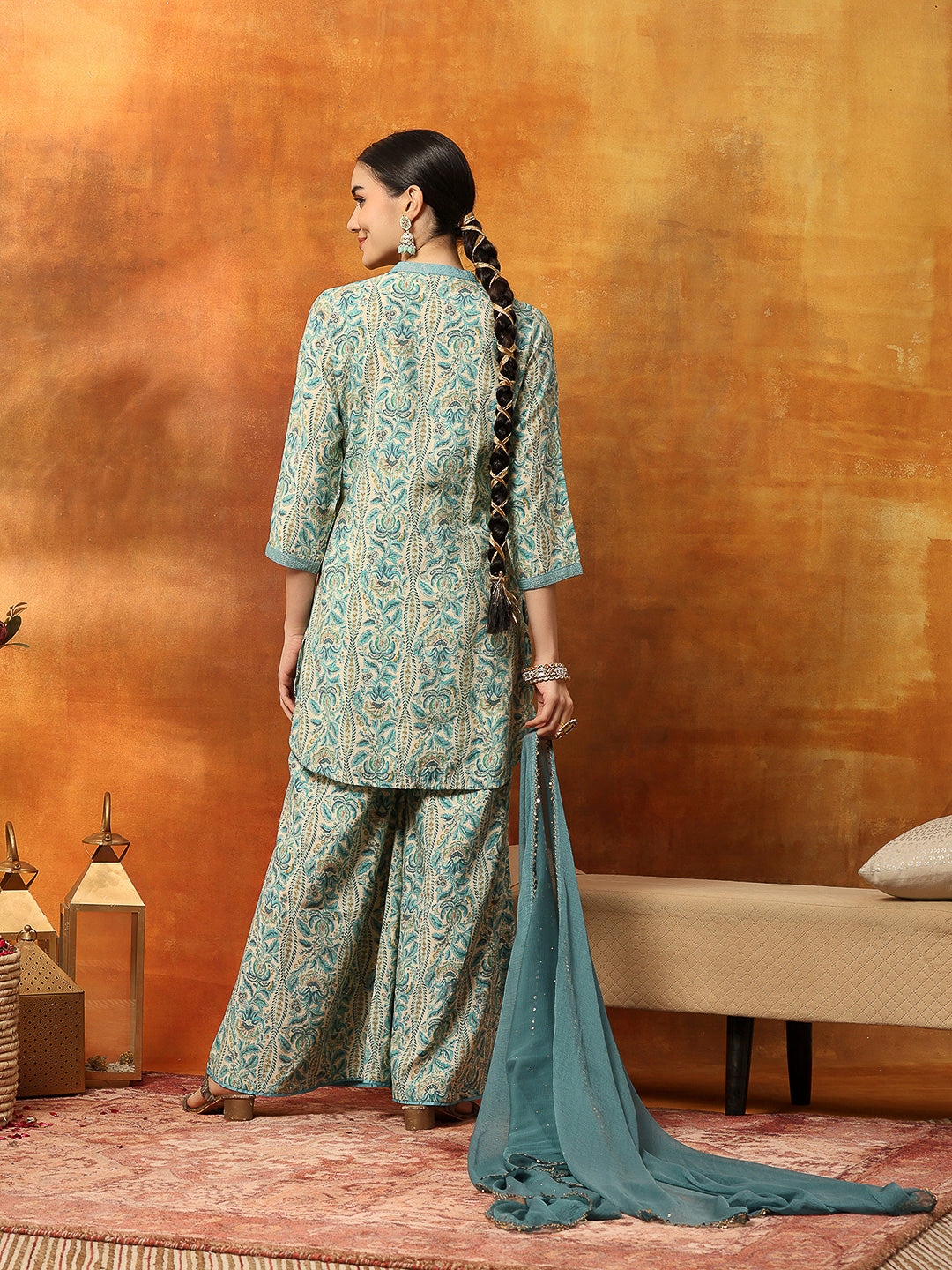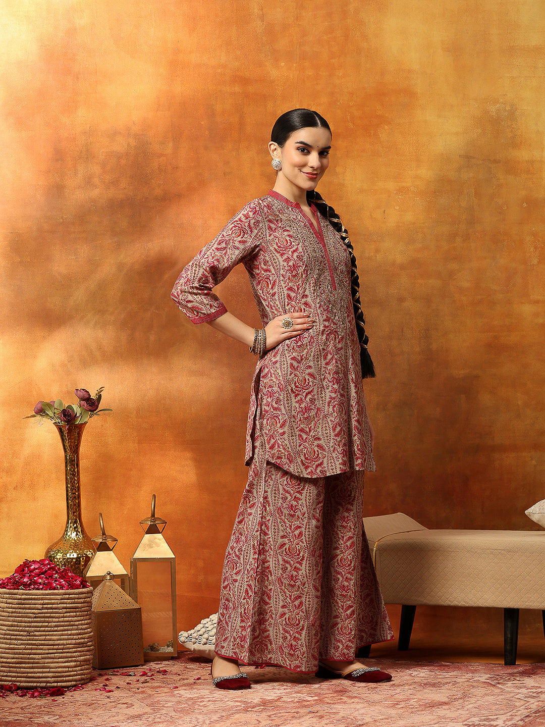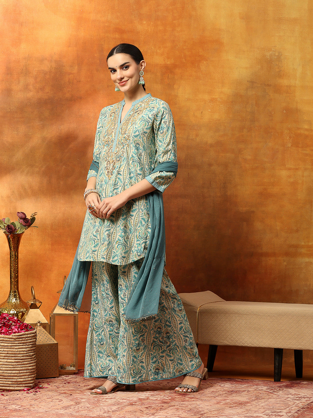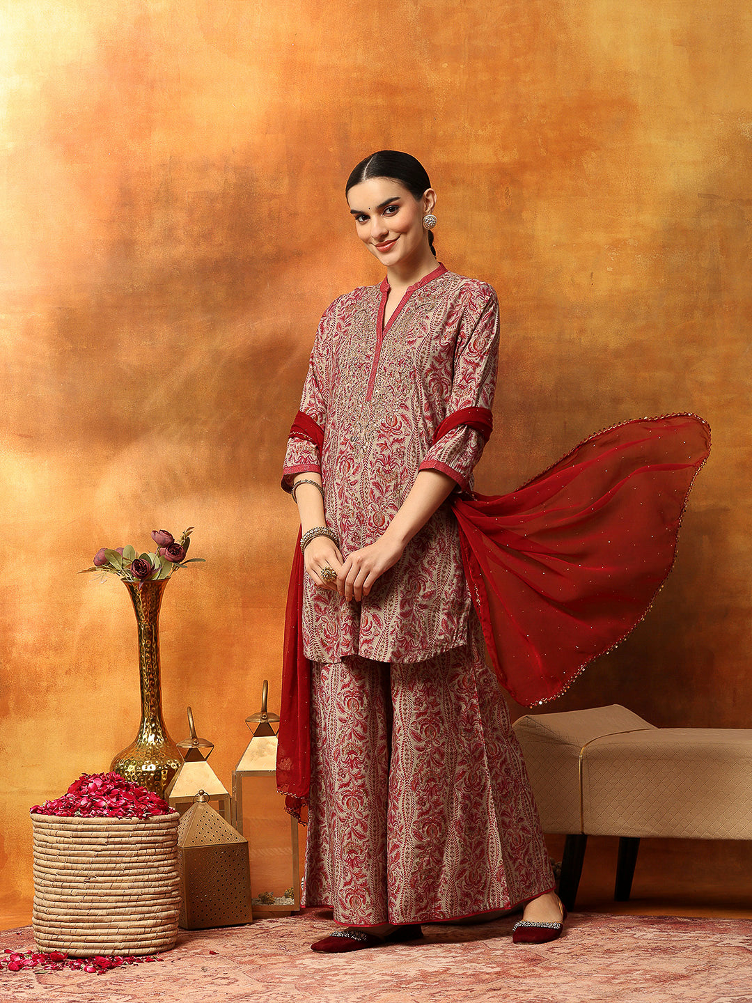 Ethnic Motif Printed Kurta with Zari Embroidery, Garara & Sequin-Laced Dupatta