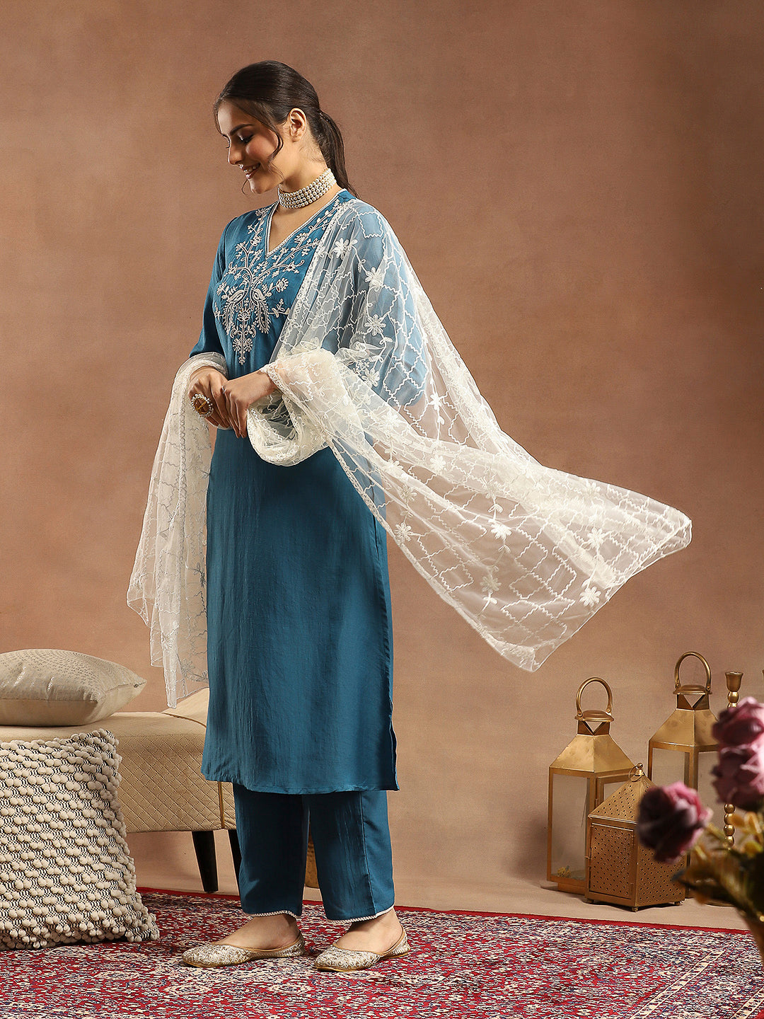 A-Line Kurta Set with Lucknavi Embroidery, Palazzo & Embroidered Supernet Dupatta
