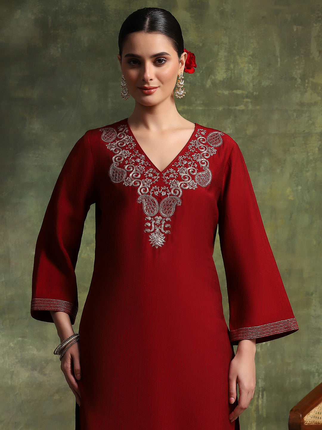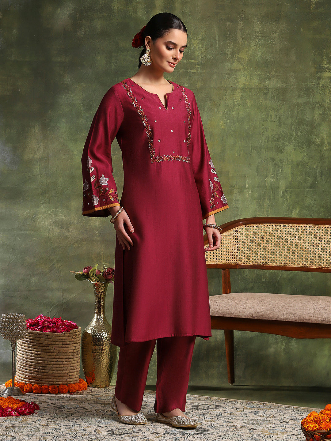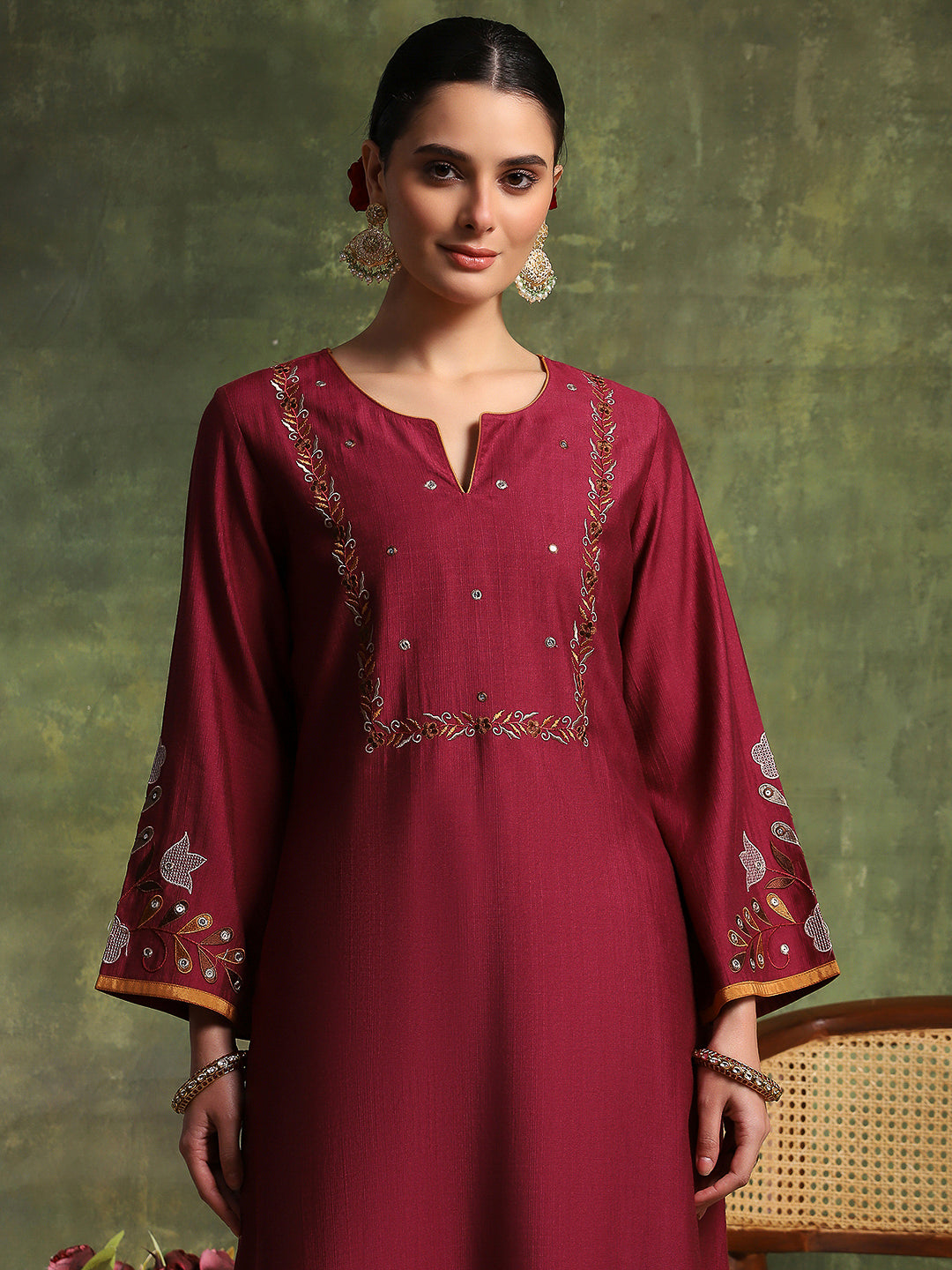 Vetican Embroidered Kurta Set with Bell Sleeves & Khadi Silk Dupatta