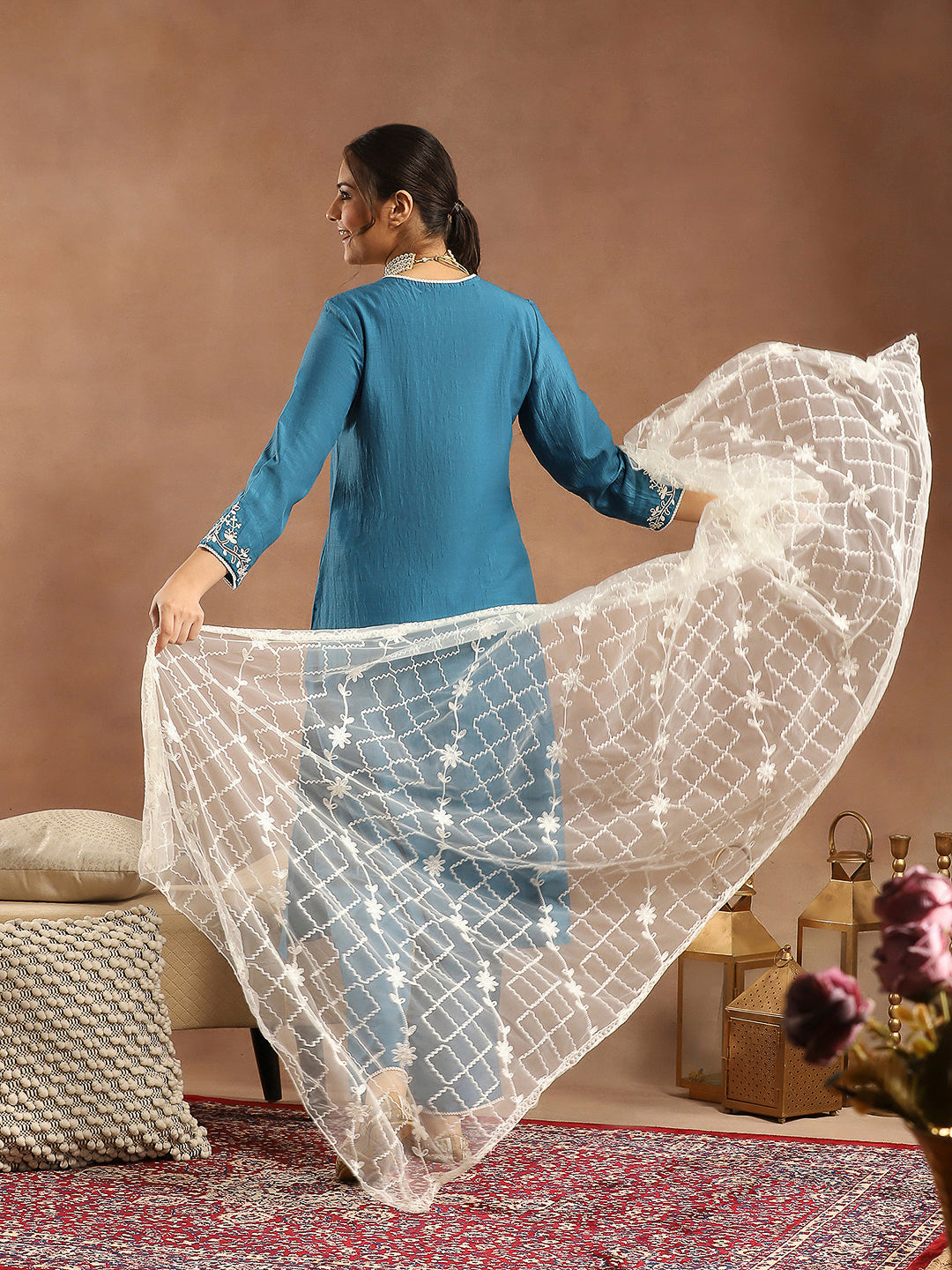 Kurta Set with Intricate Dori Embroidery, Lace Hem Palazzo & Embroidered Supernet Dupatta