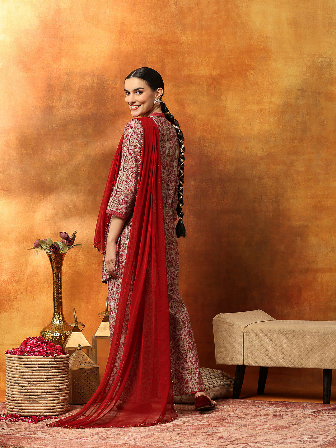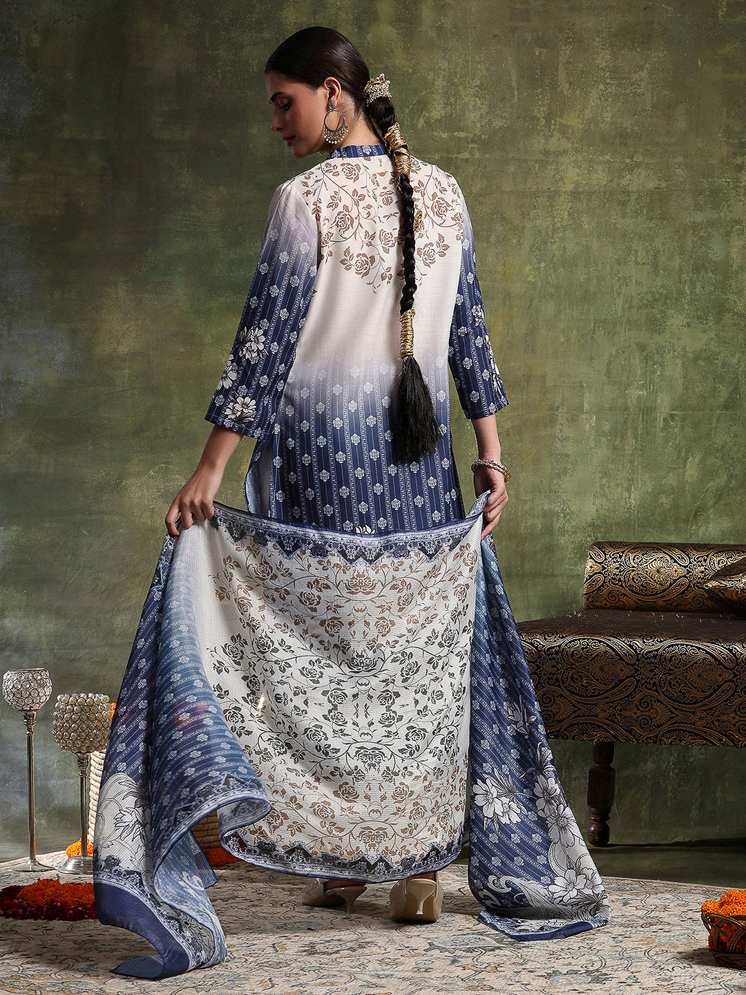 Printed Linen Kurta Set with Mirror Embroidery & Striped Dupatta