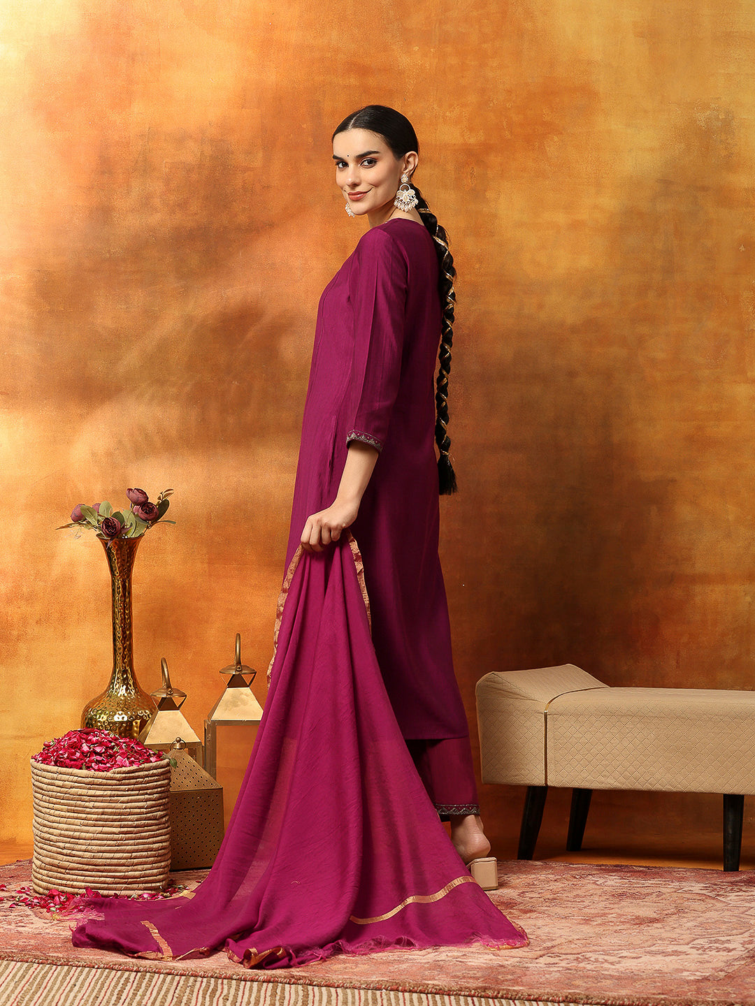Solid Straight Kurta Set with Embroidery & Mirror Work Dupatta