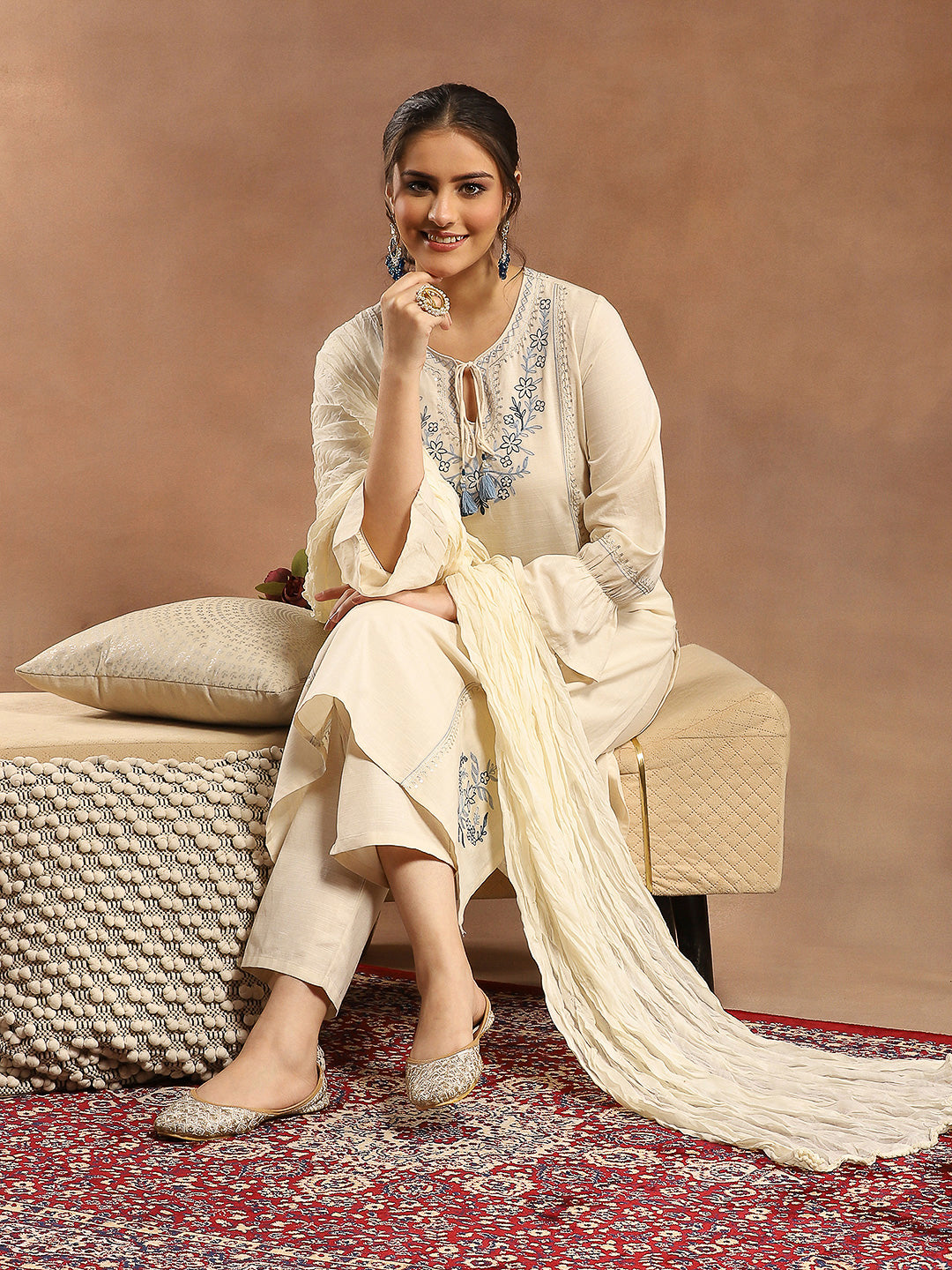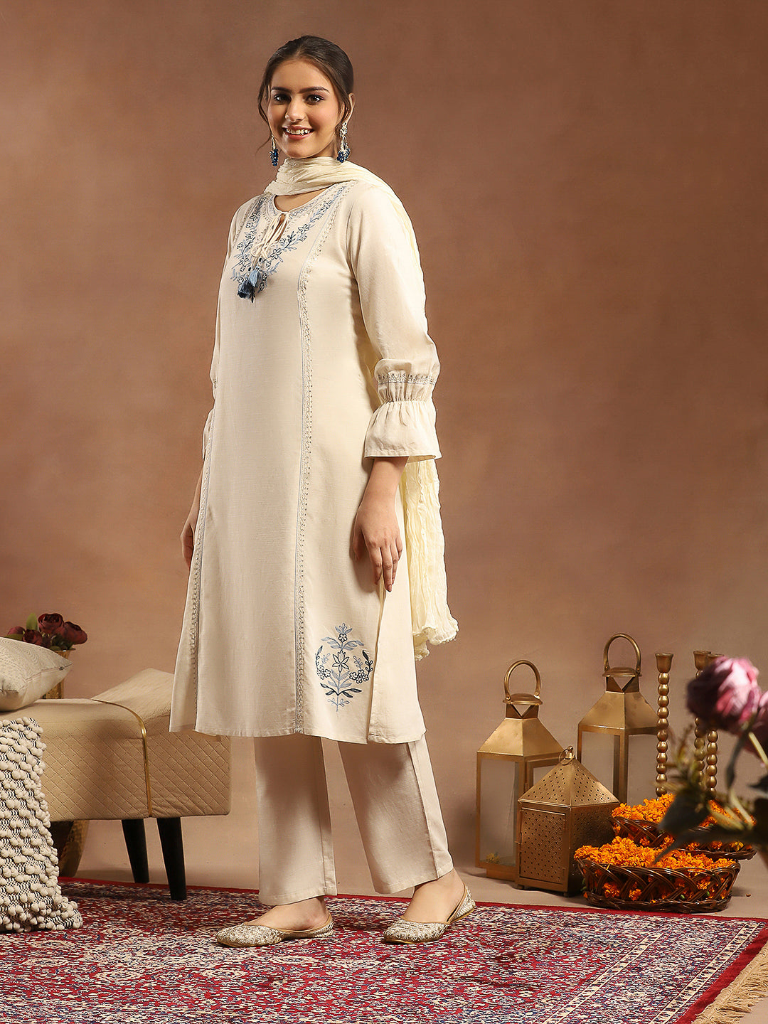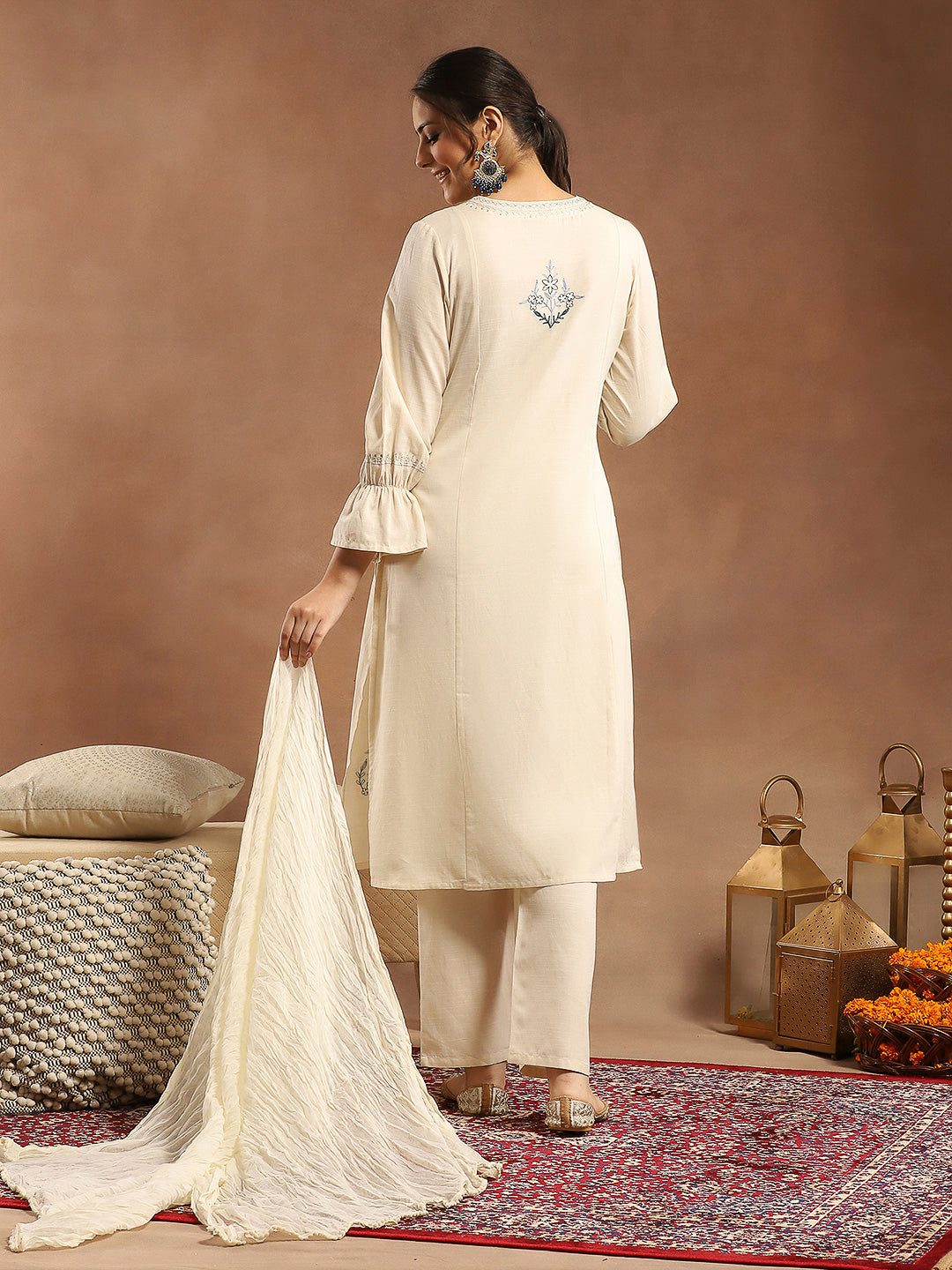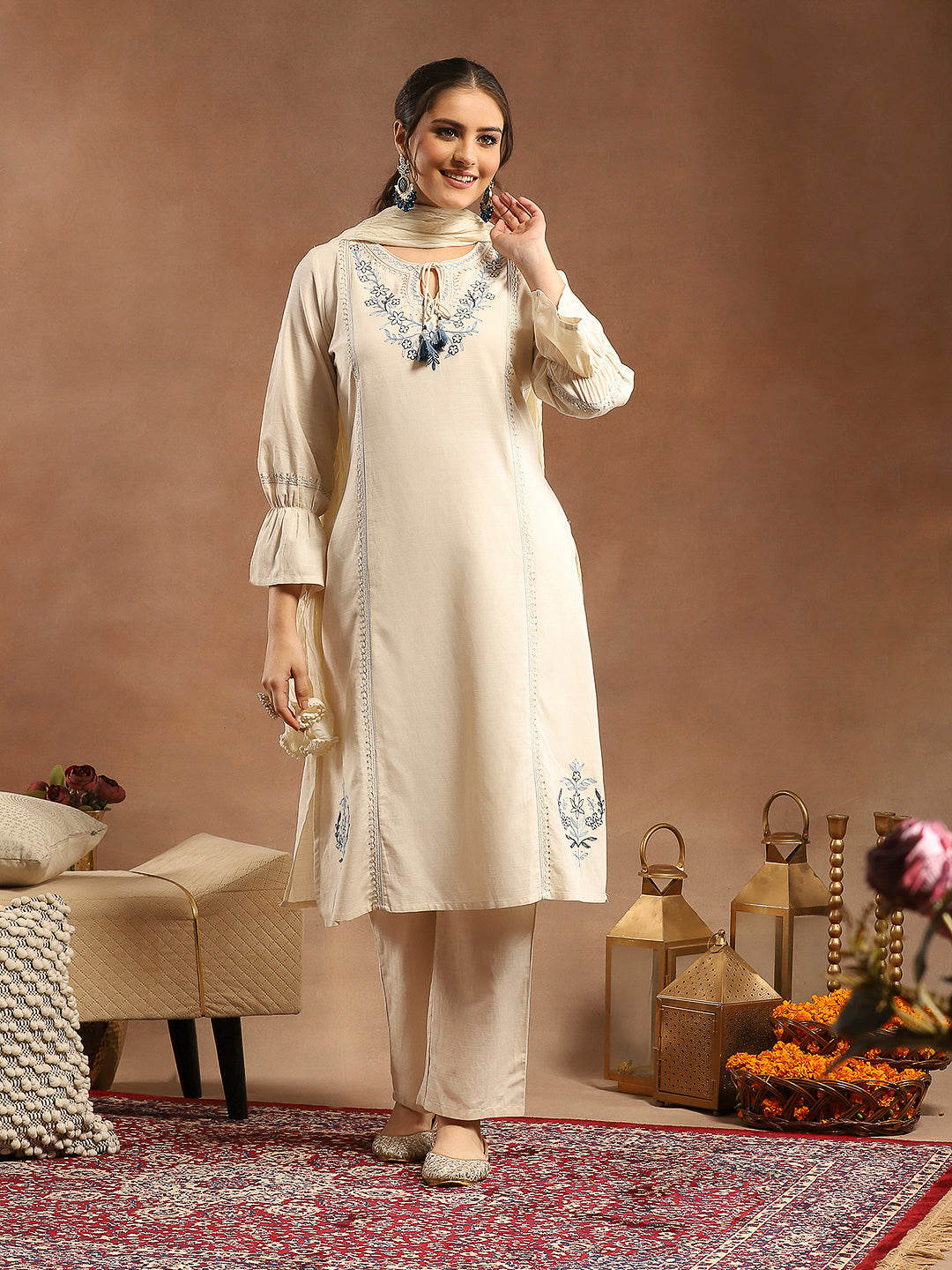 Solid Viscose Kurta Set with Ethnic Embroidery and Dupatta