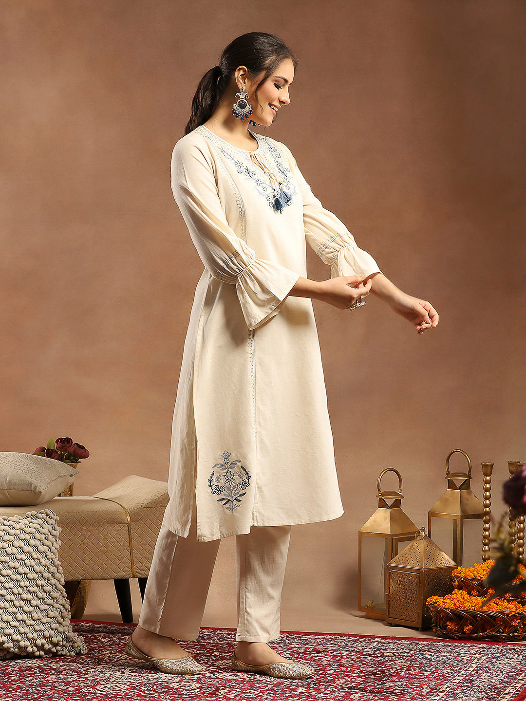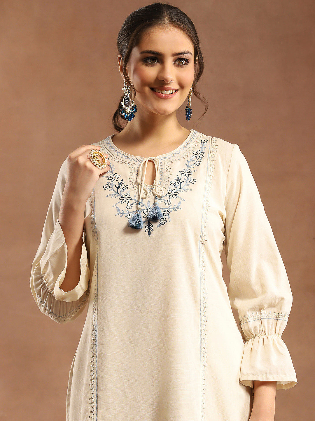 Solid A-Line Cotton Linen Kurta Set with Embroidered Details