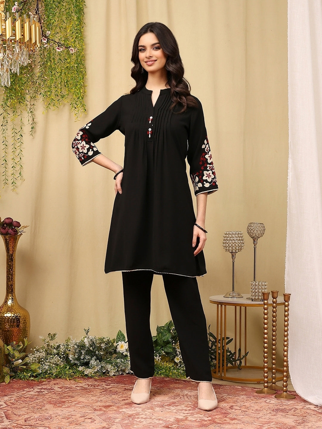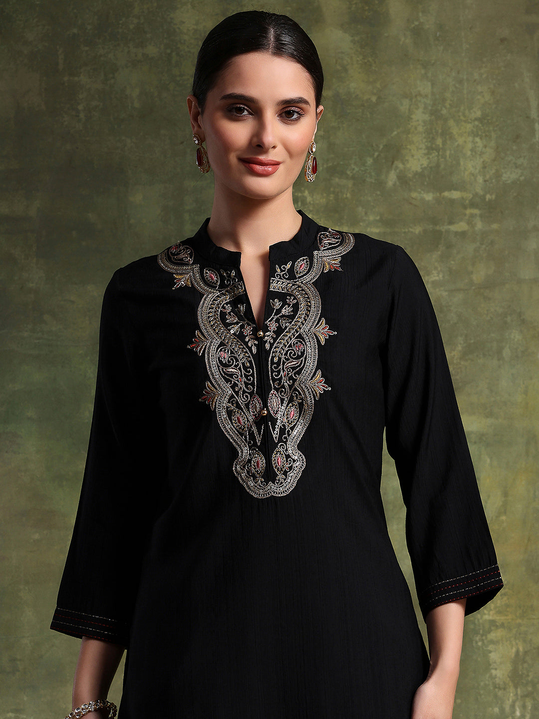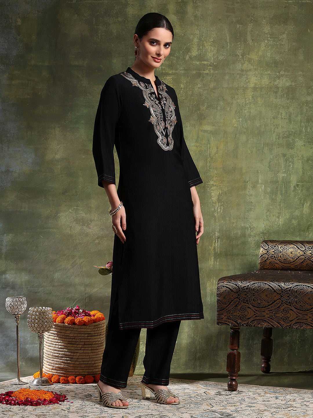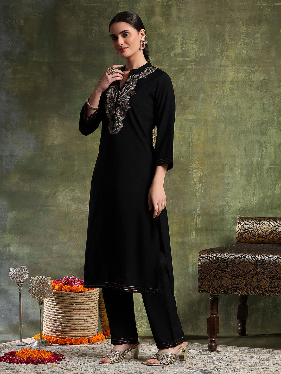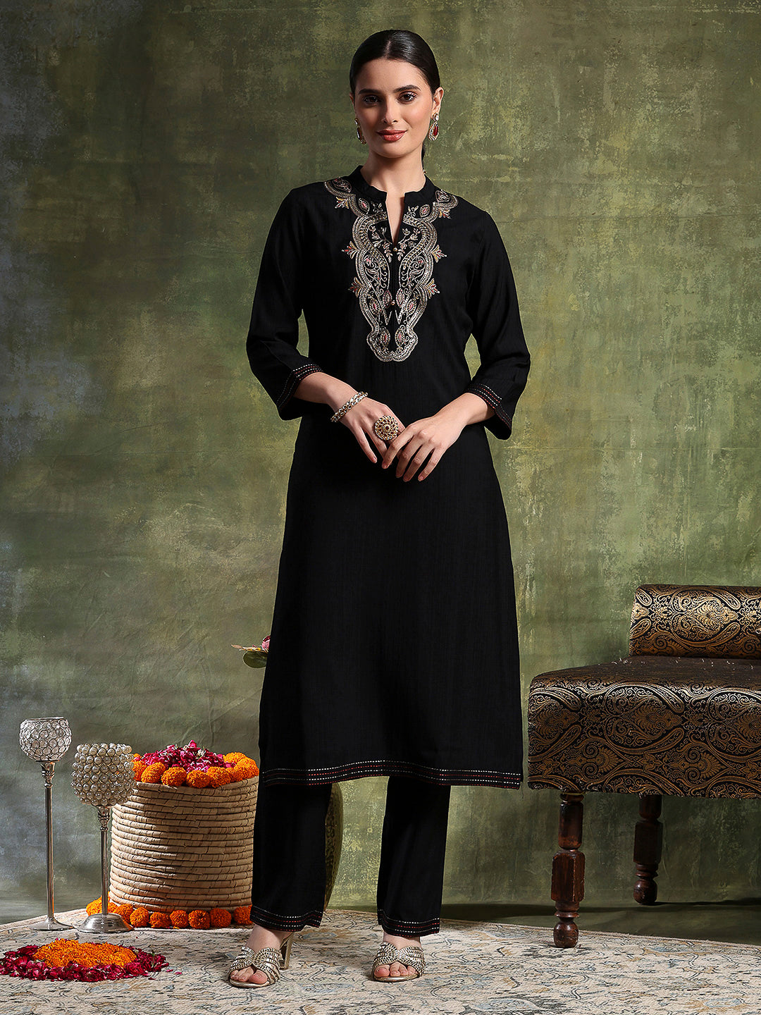 Poly Viscose Kurta Set with Zari Embroidery & Glass Neckline
