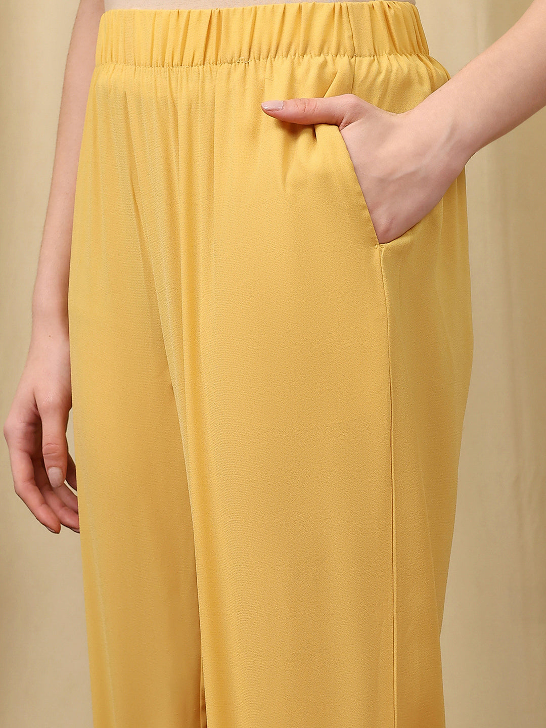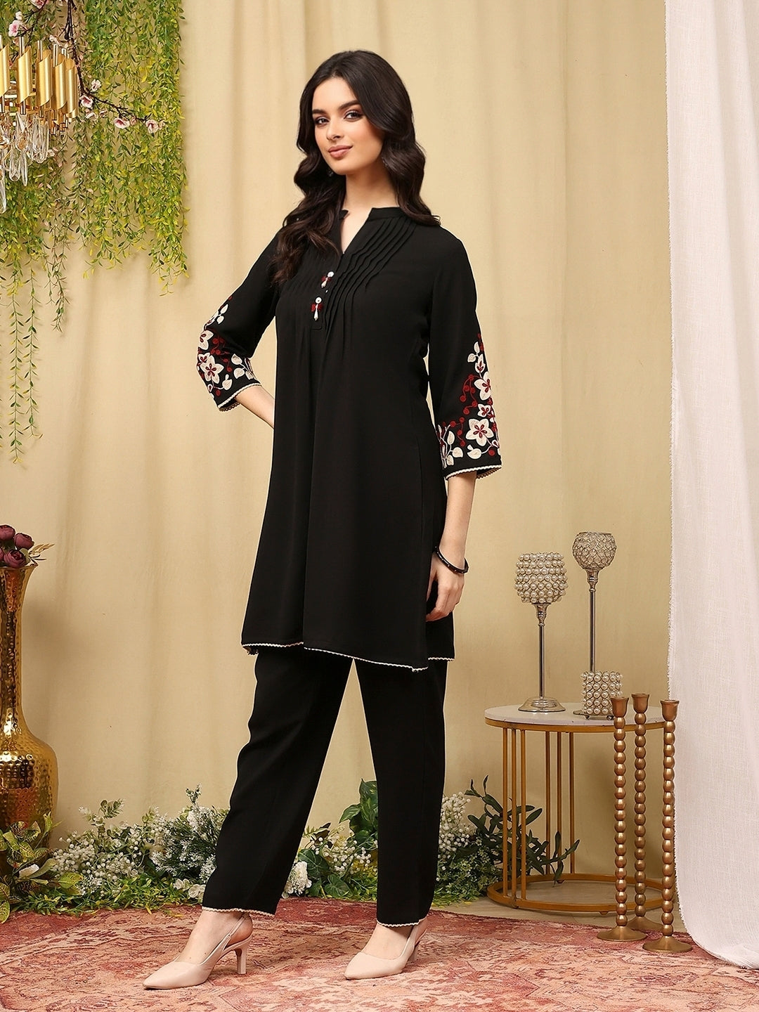 Pleated Crepe Kurta Set with Floral Embroidery & Lace-Hem Palazzo