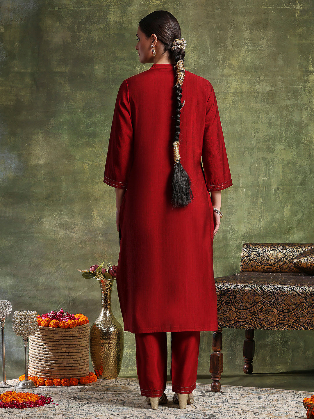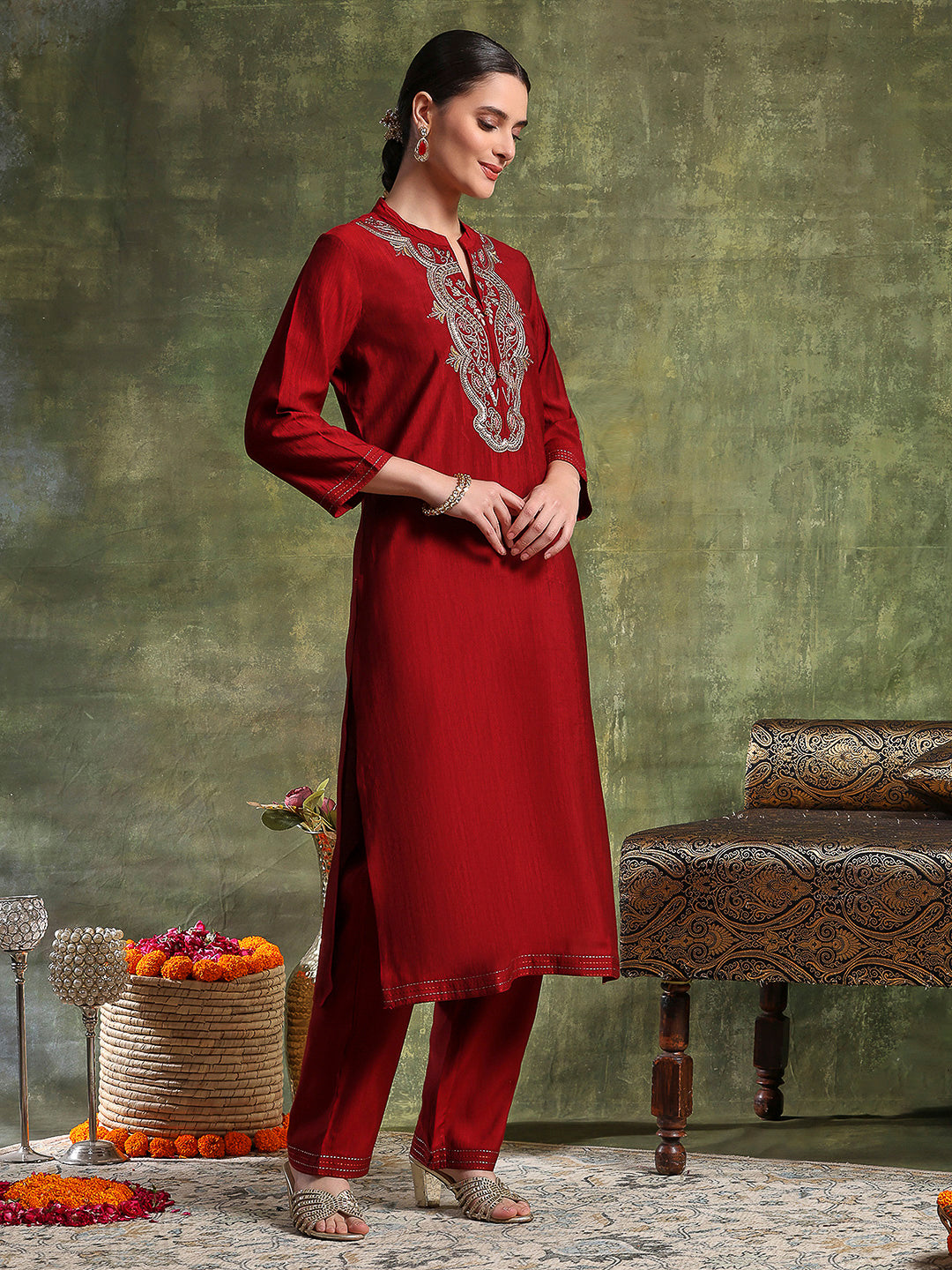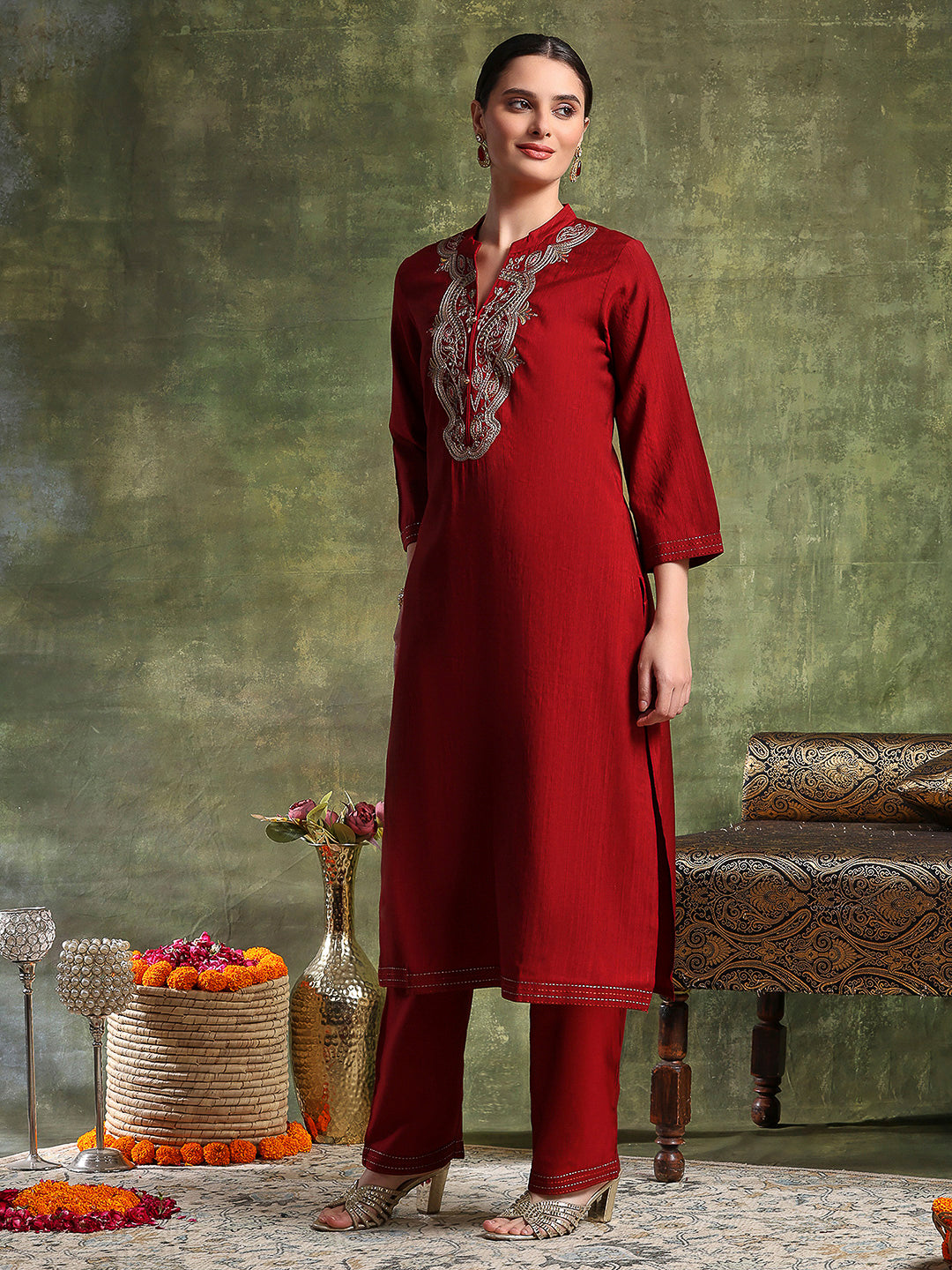 Poly Viscose Kurta Set with Zari-Embroidered Mandarin Collar