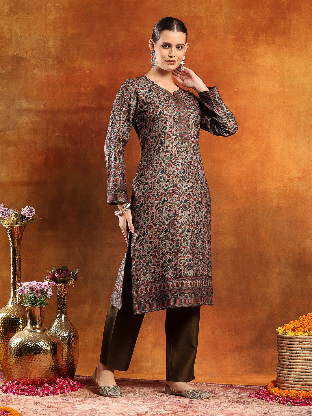 Placement Printed Straight Crepe Kurta with Sewroskie Work
