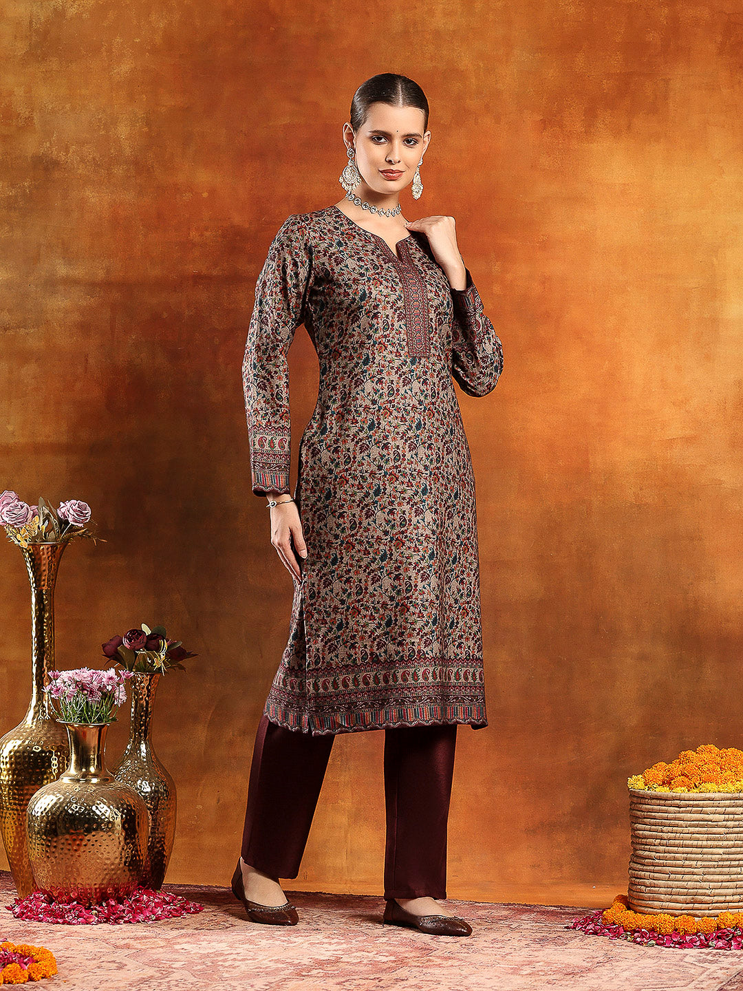 Paisley Wool Blend Kurta Set with Swarovski Detailing & Chiffon Dupatta