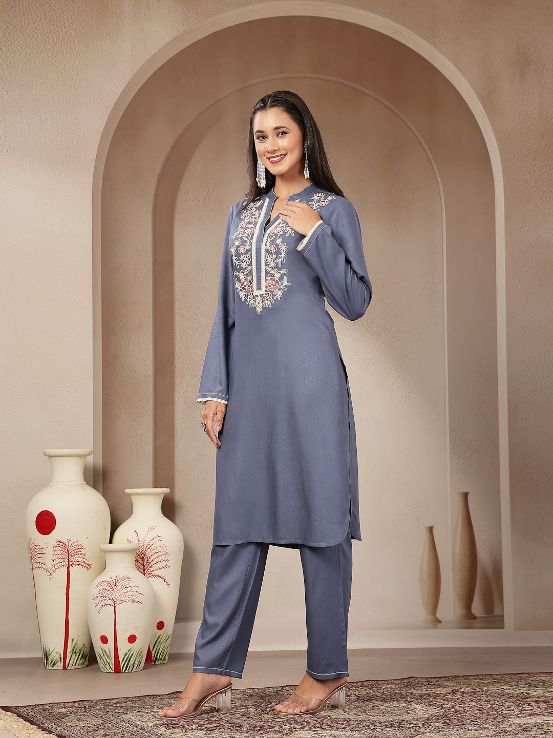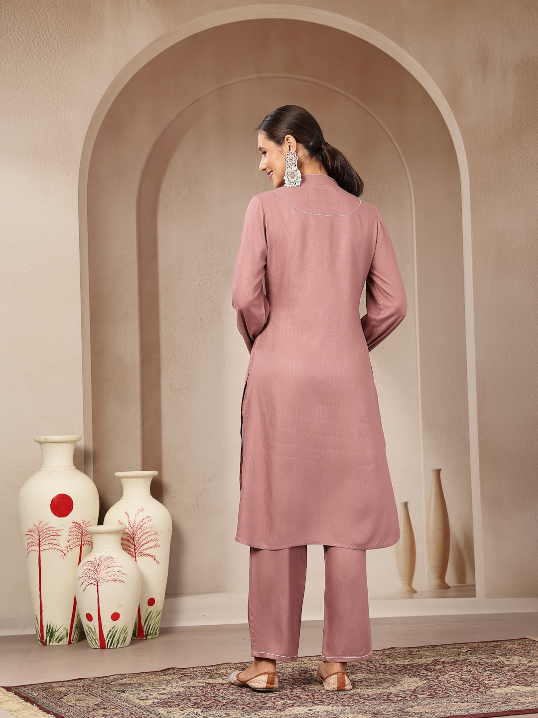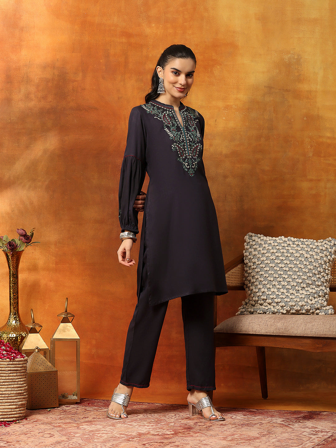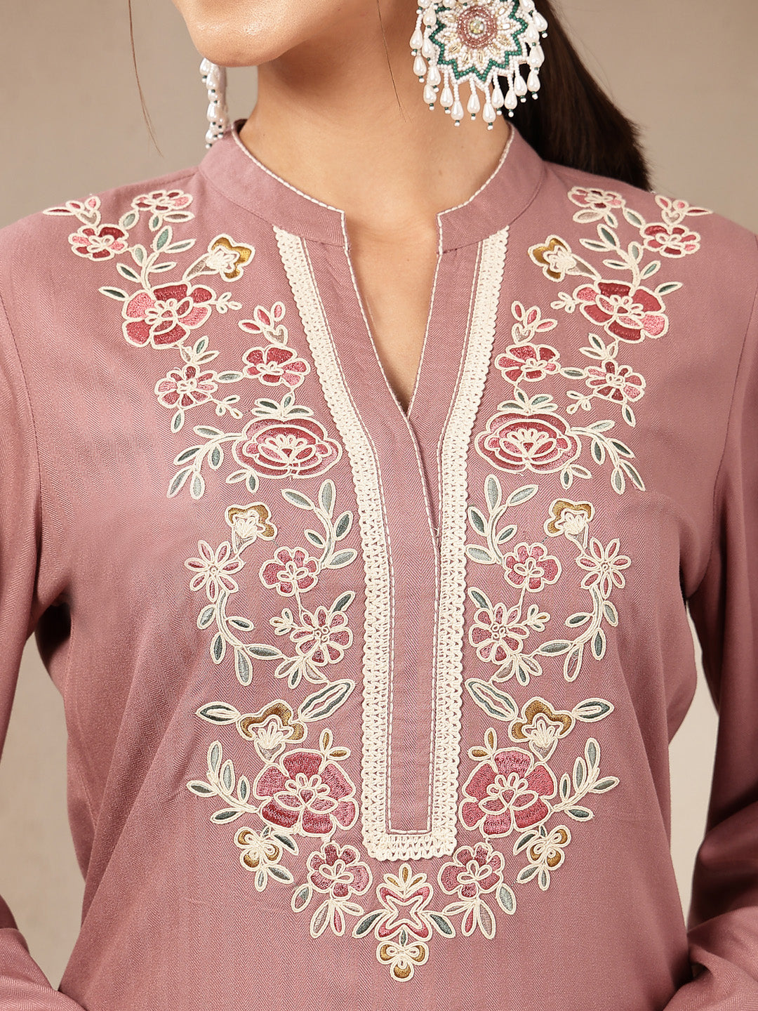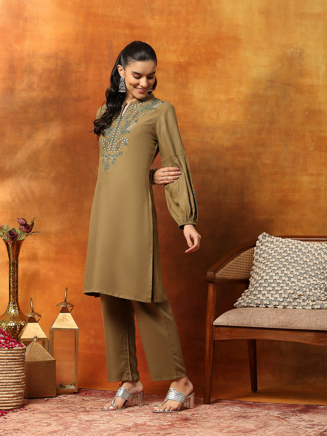 Rayon Kurta Set with Embroidered Mandarin Collar, Full Sleeves & Stitched-Hem Palazzo