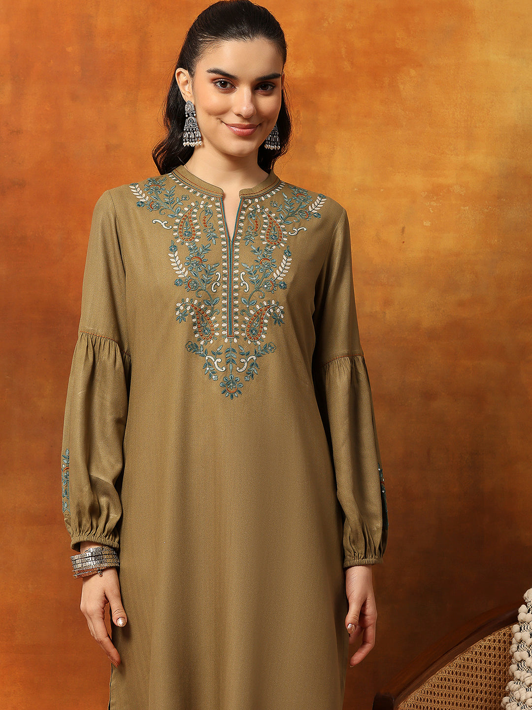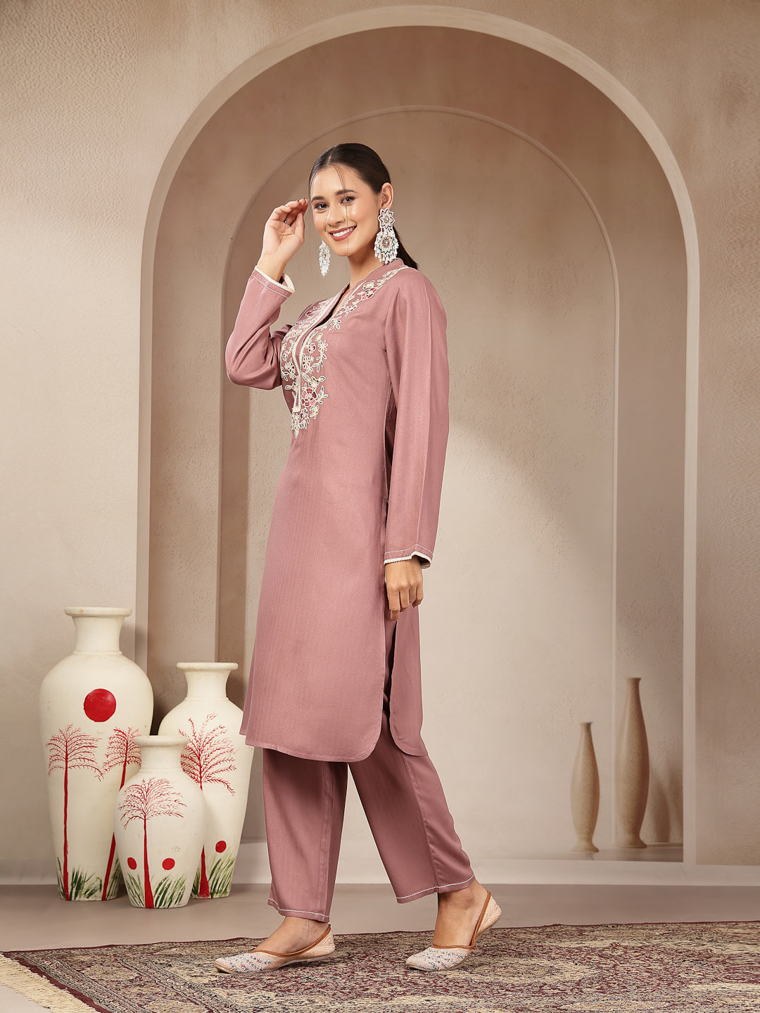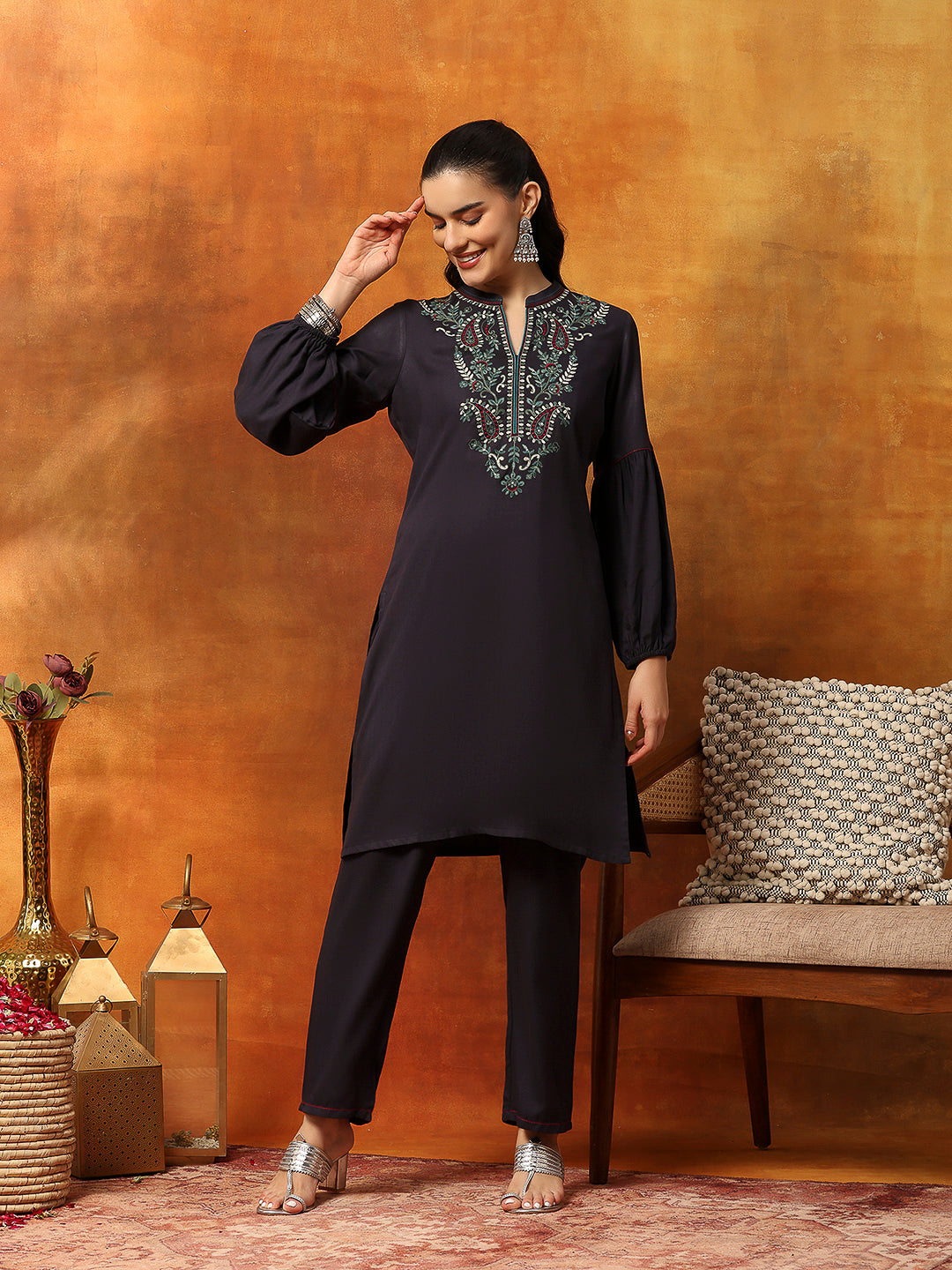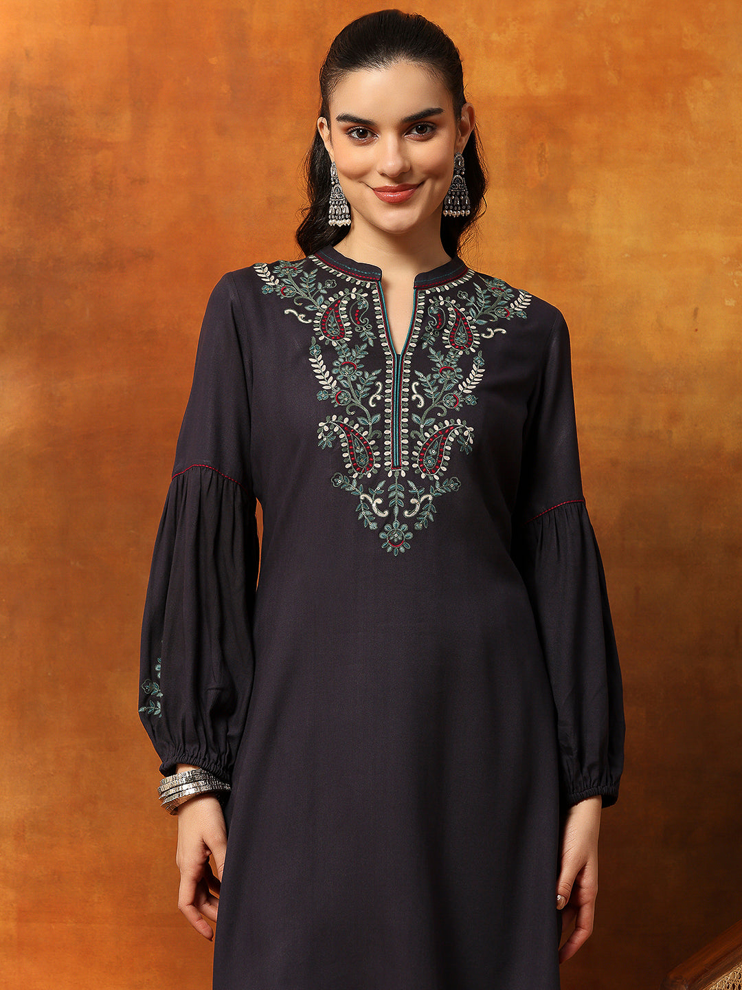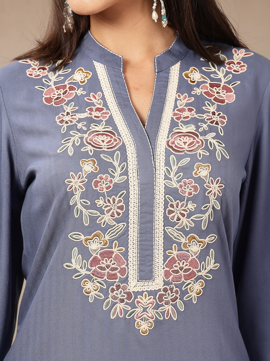 Rayon Kurta Set with Embroidered Mandarin Collar, Full Sleeves & Stitched-Hem Palazzo