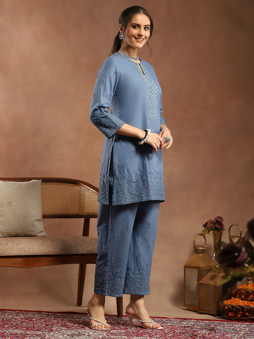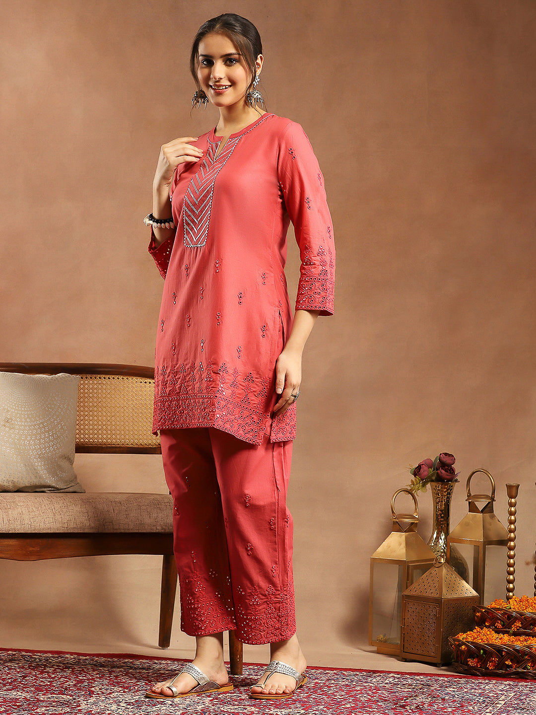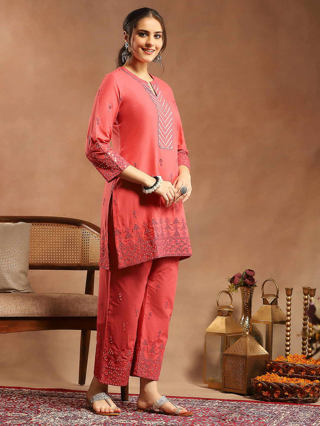 Pure Cotton Straight Kurta Set with Mirror-Embroidered Palazzo