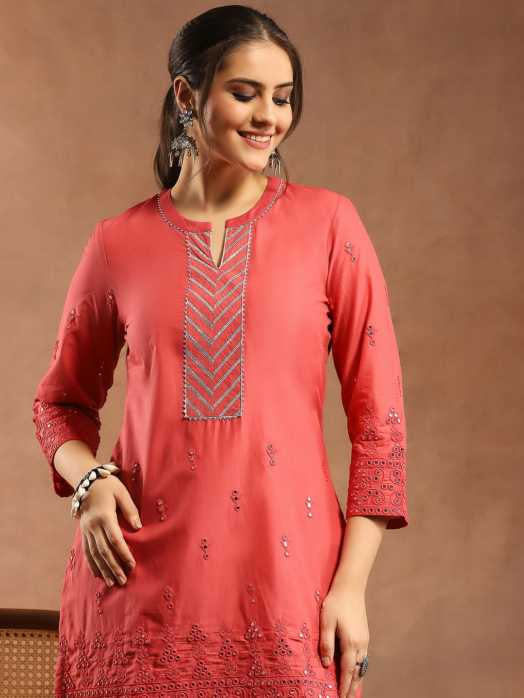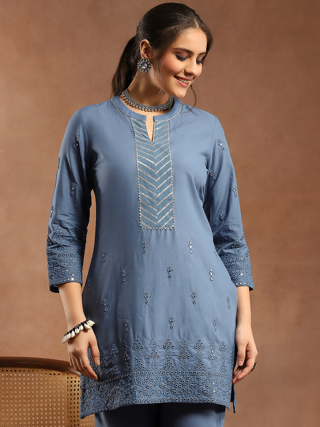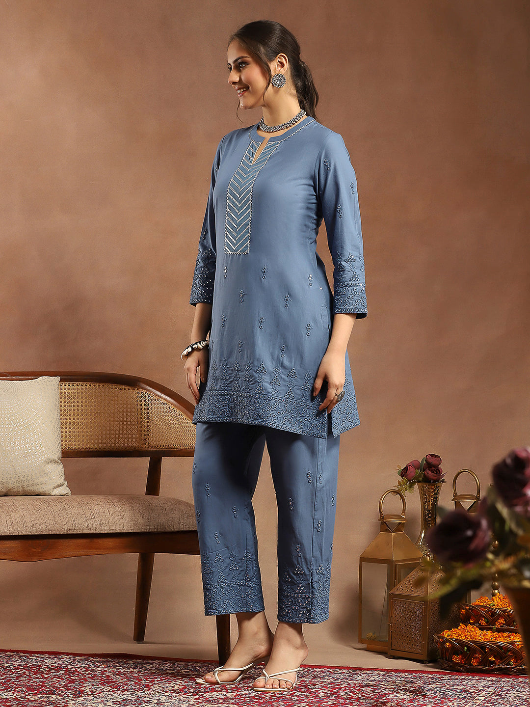 Pure Cotton Straight Kurta Set with Mirror-Embroidered Palazzo