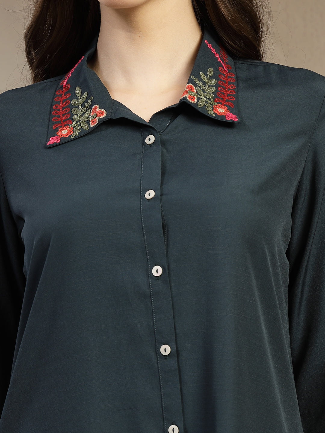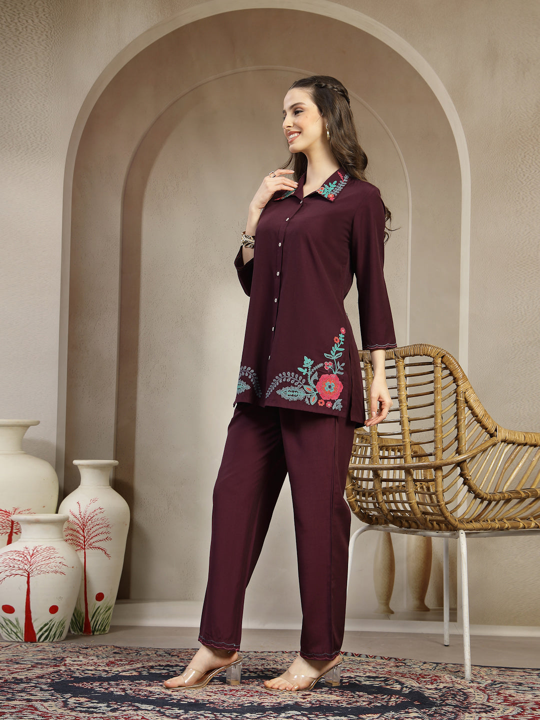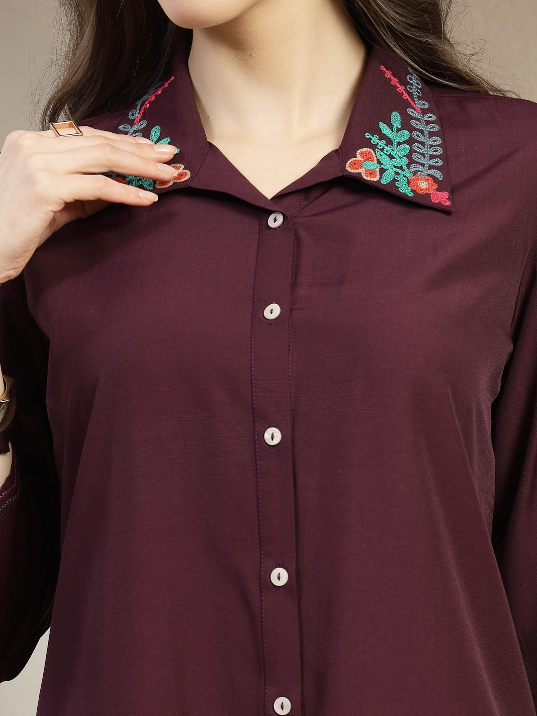 Solid Viscose Rayon Co-ord Set with Embroidered Shirt Collar