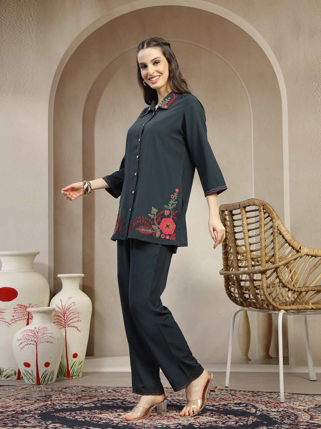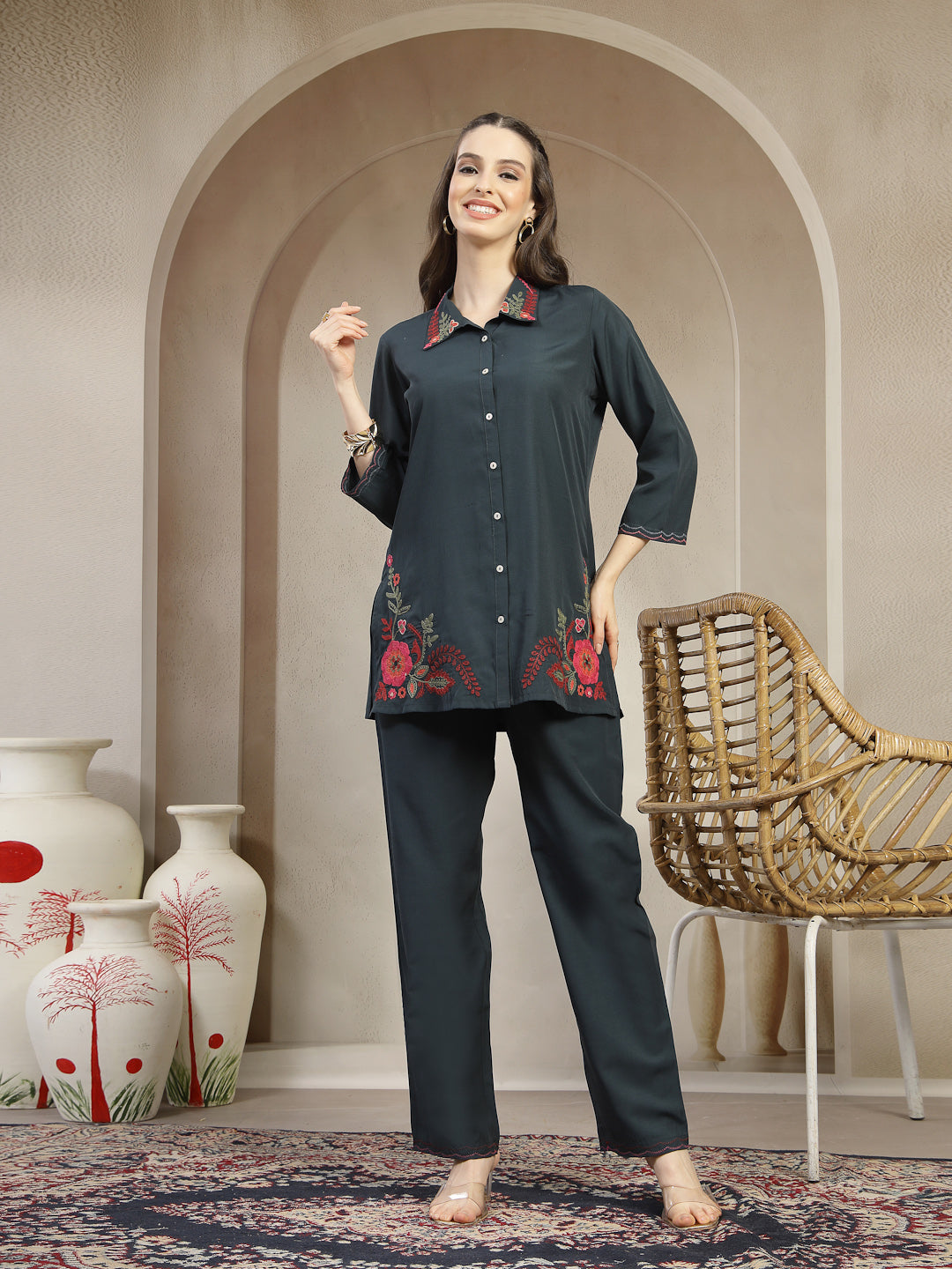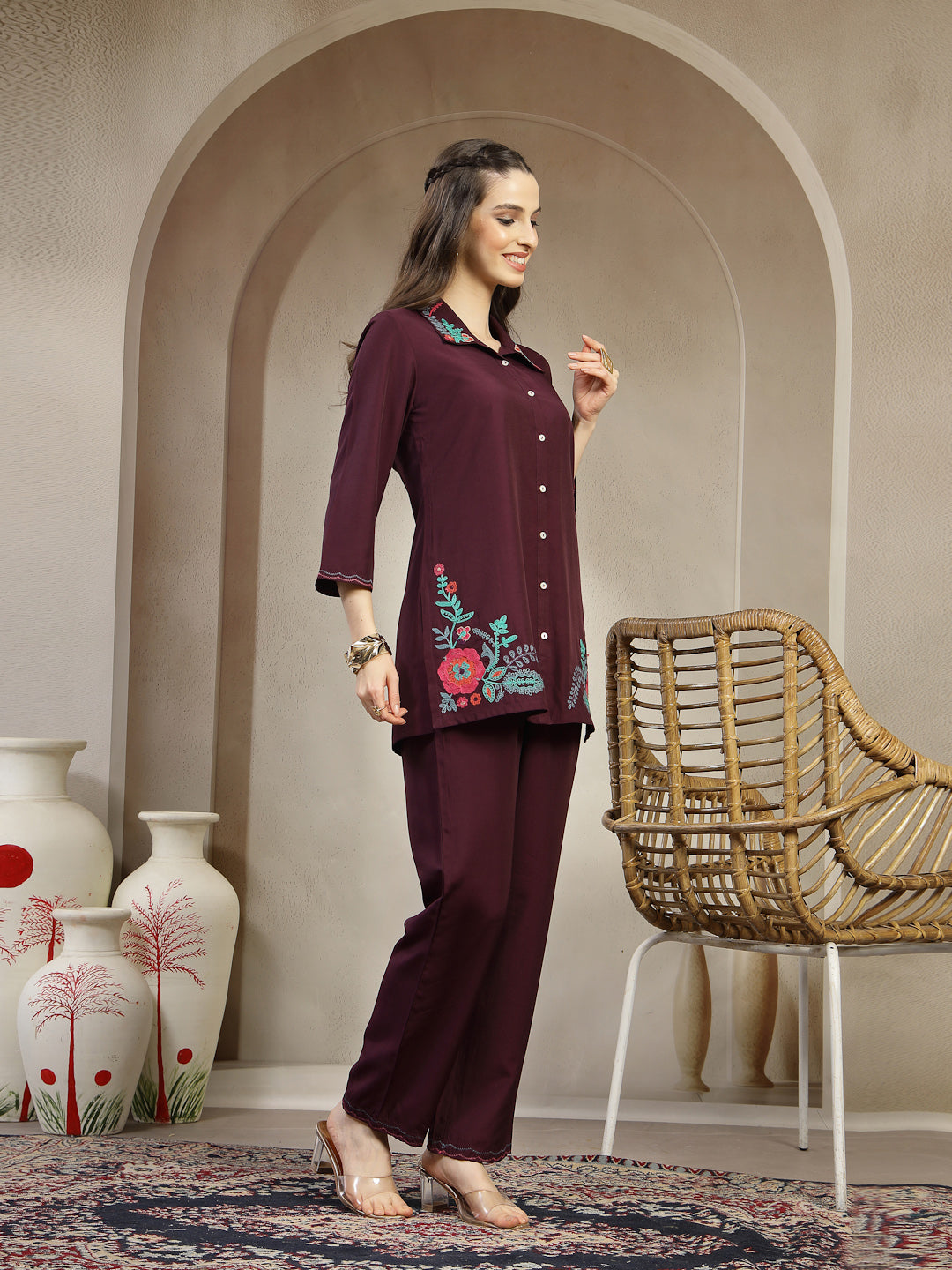 Solid Viscose Rayon Co-ord Set with Embroidered Shirt Collar