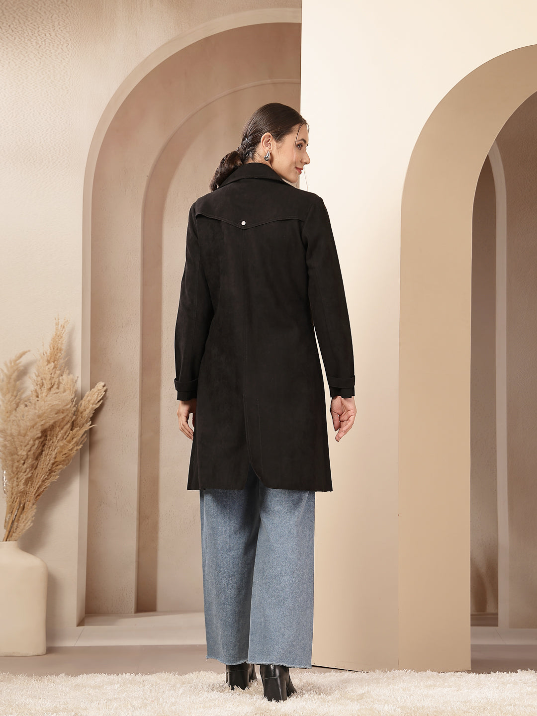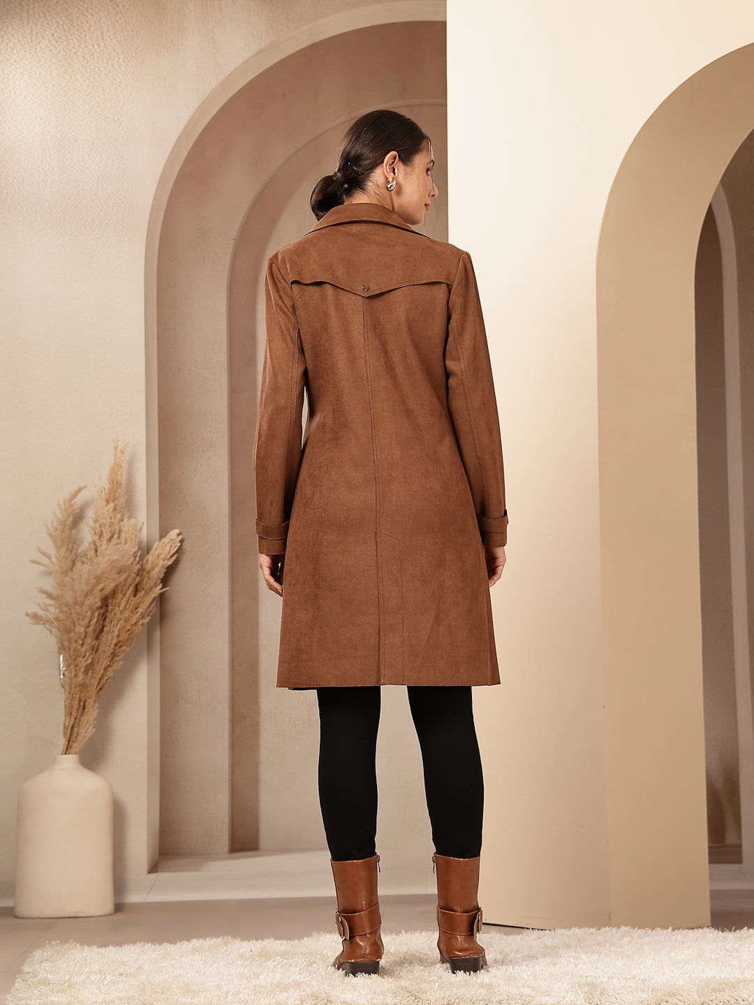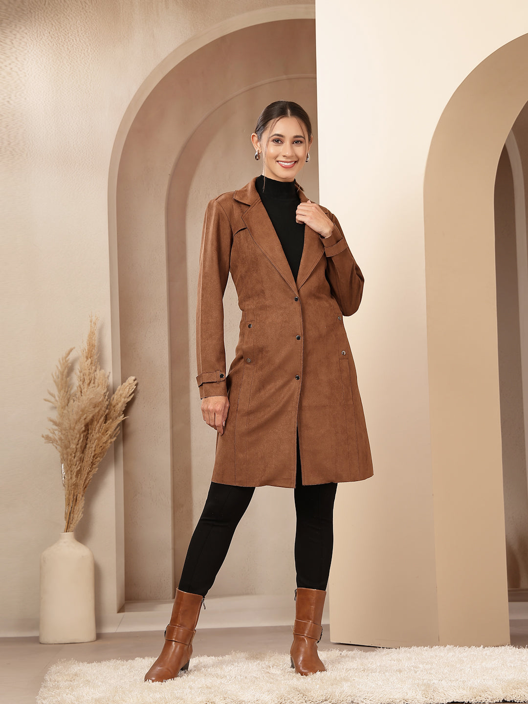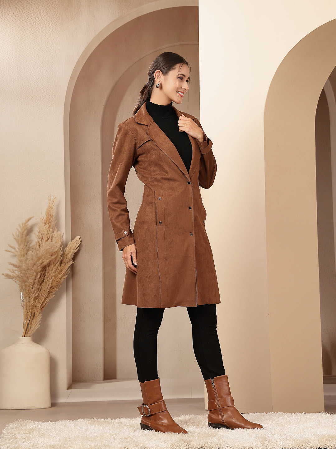 Suede Long Coat with Button Placket & Tab-Sleeve Detailing