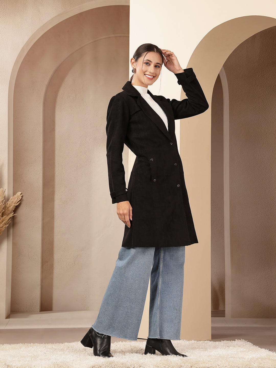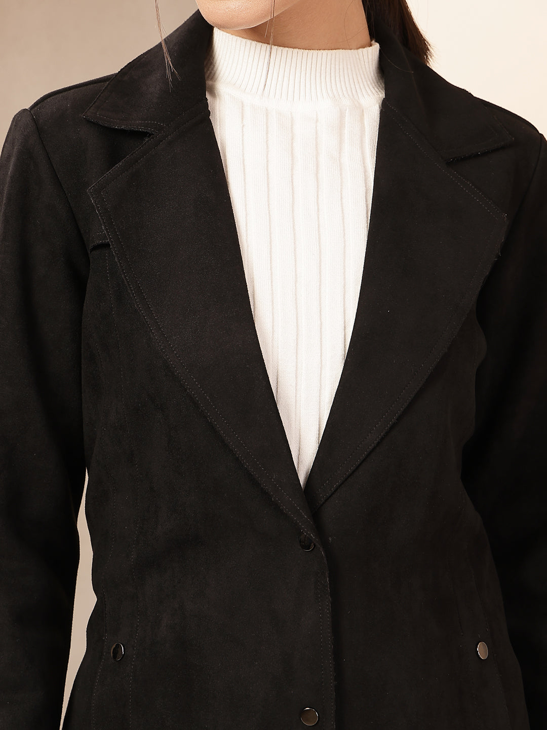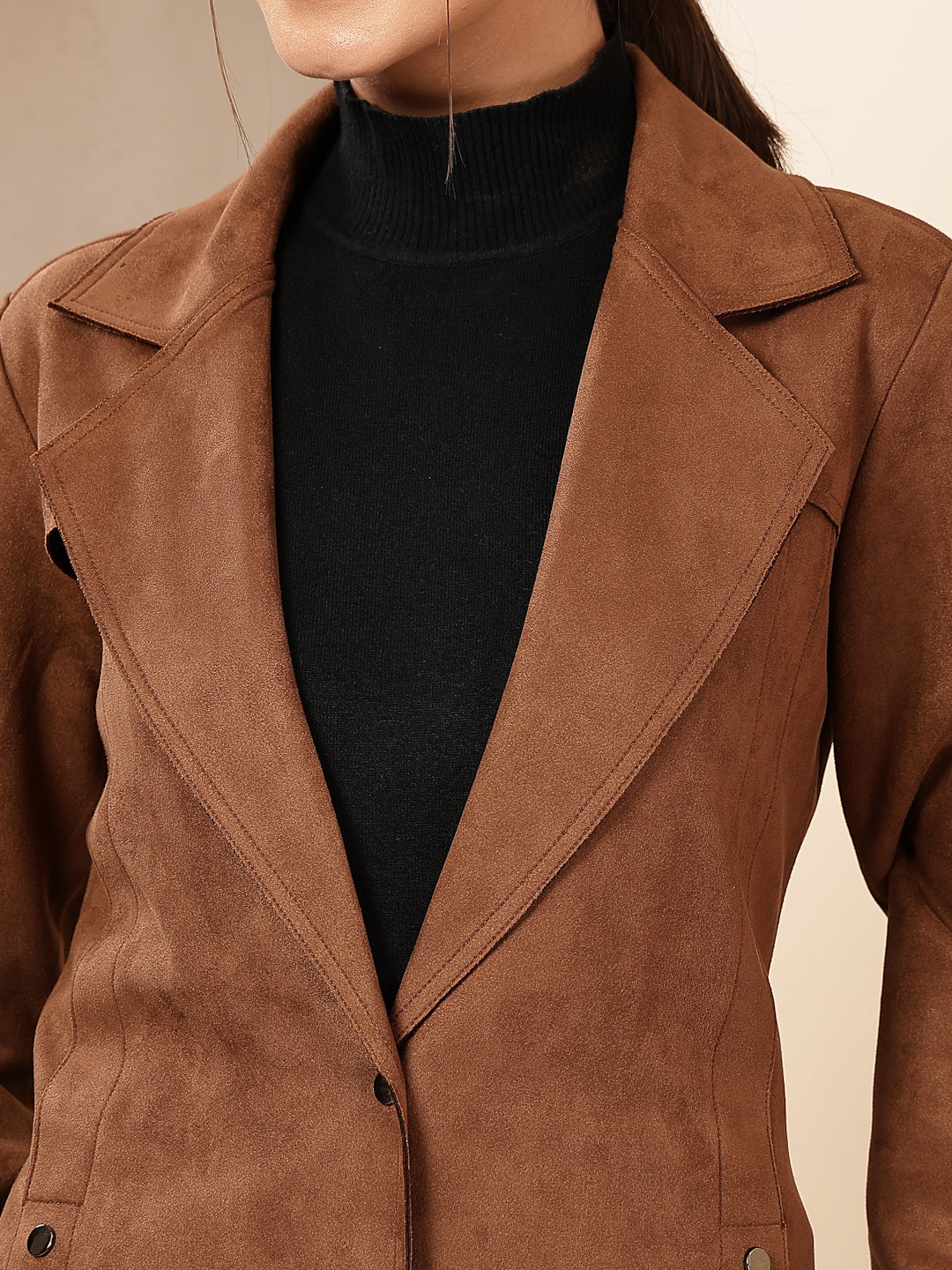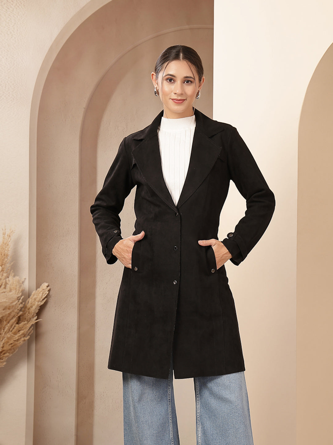 Suede Long Coat with Button Placket & Tab-Sleeve Detailing