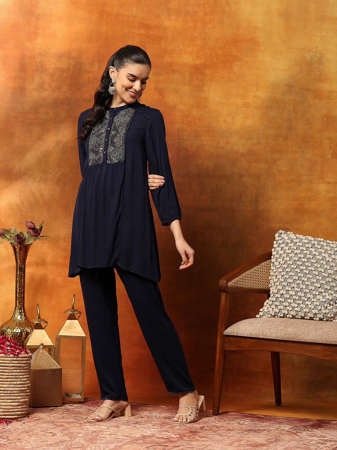 Solid Straight Poly Slub Tunic with Embroidery & Palazzo Co-ord Set