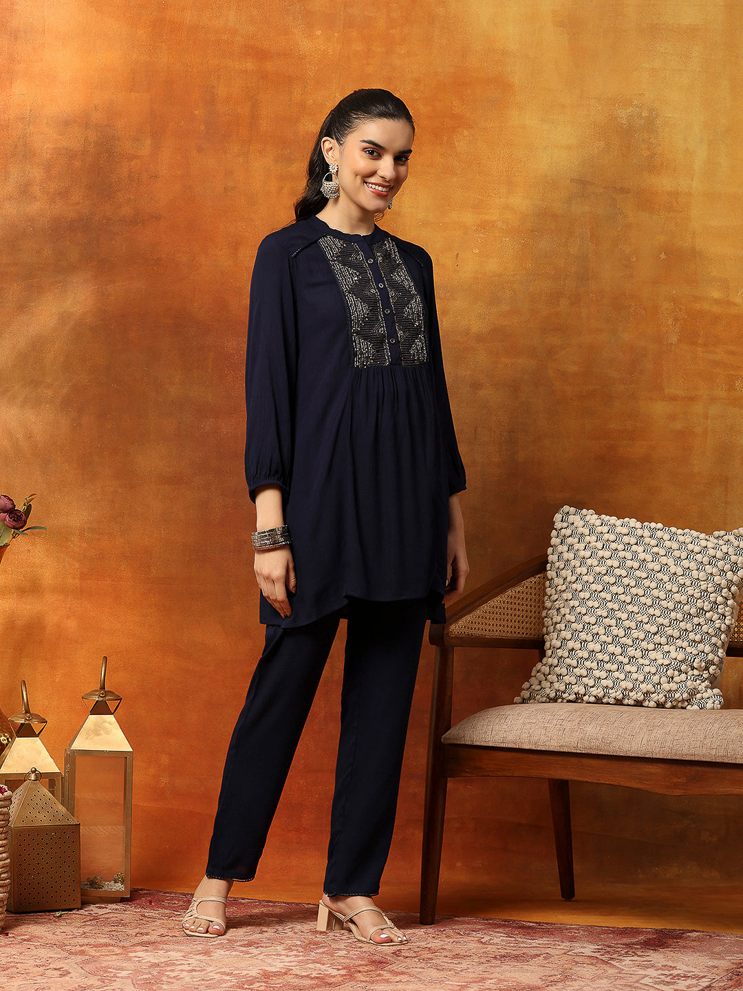 Solid Straight Rayon Slub Co-ord Set with Mirror Embroidery