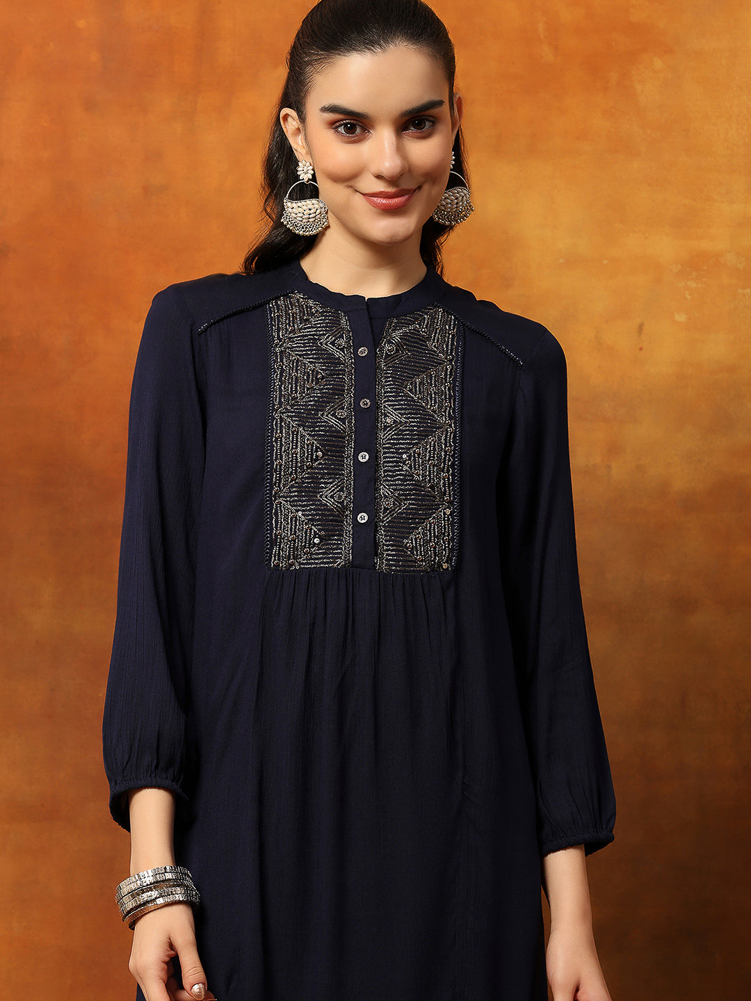 Solid Straight Viscose Rayon Kurti with Floral Embroidery