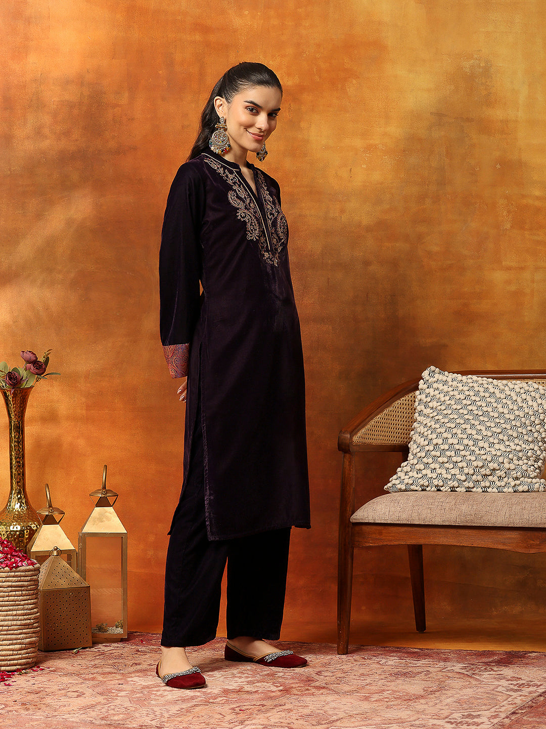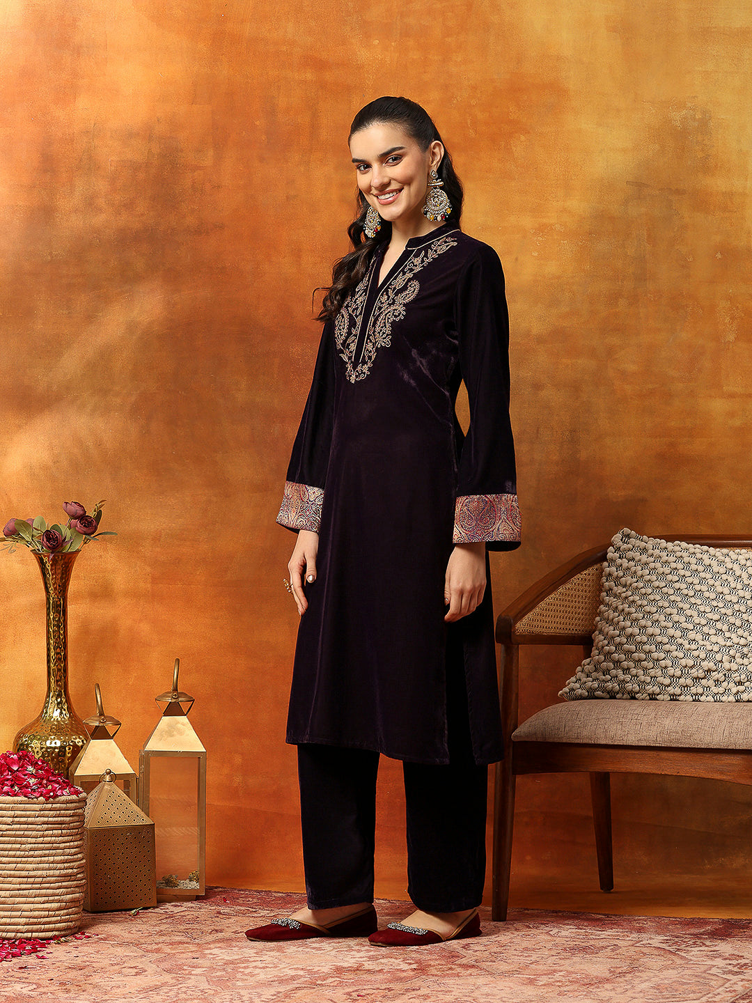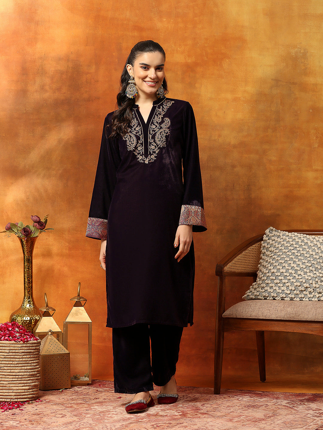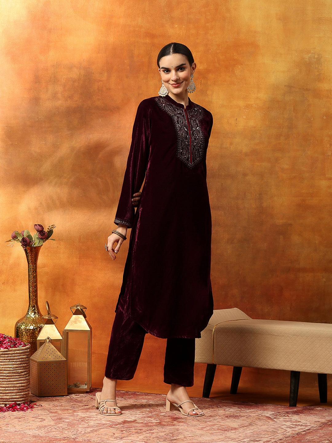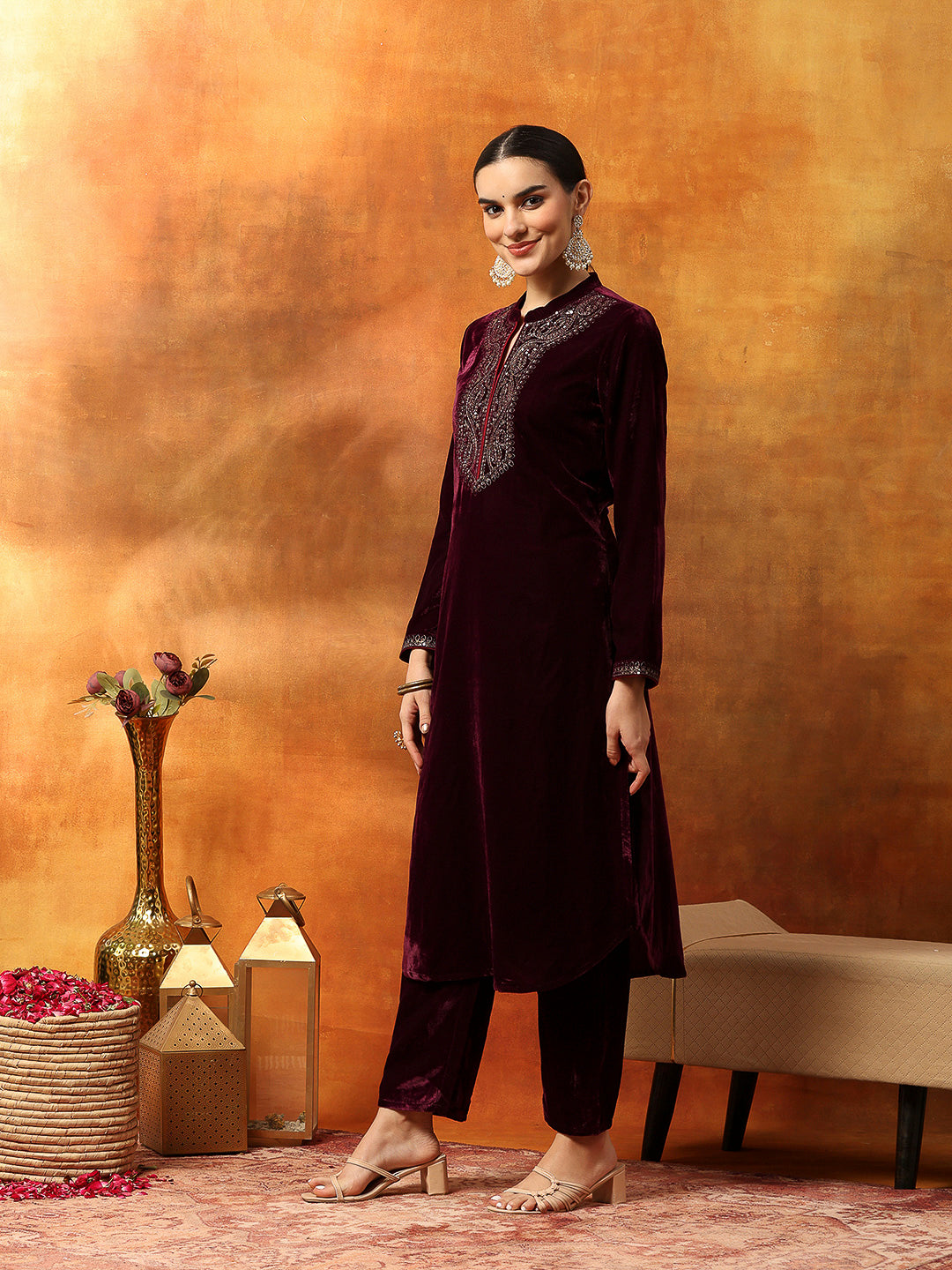 Velvet Kurta Set with Mandarin Collar & Zari Embroidered Yoke