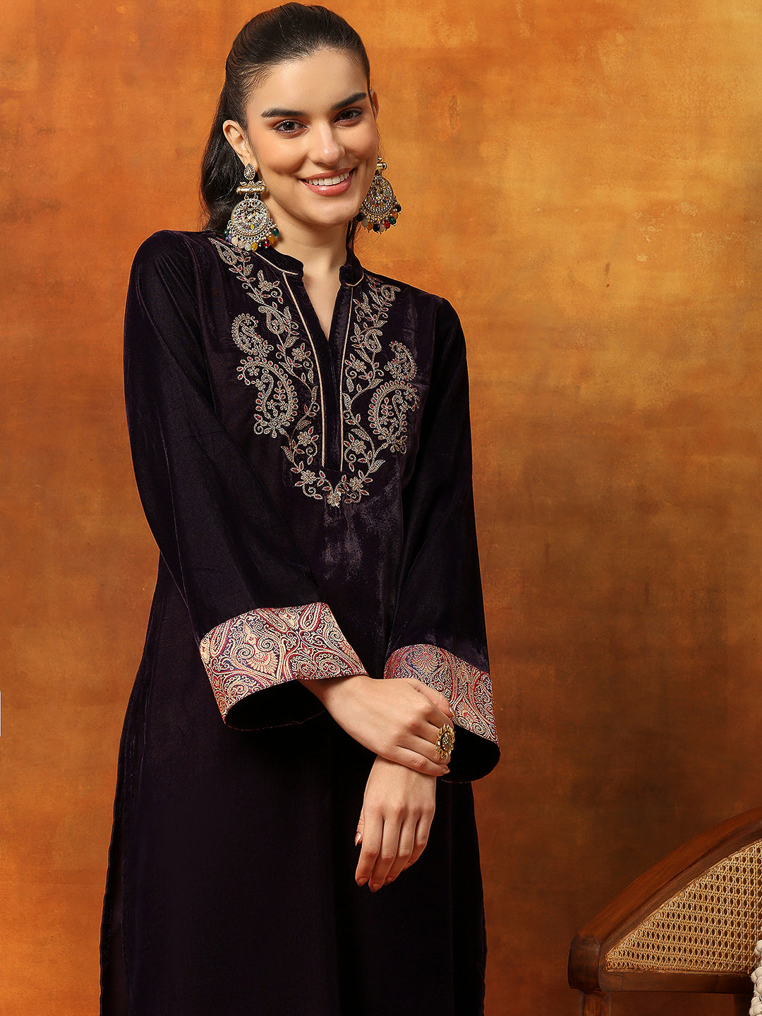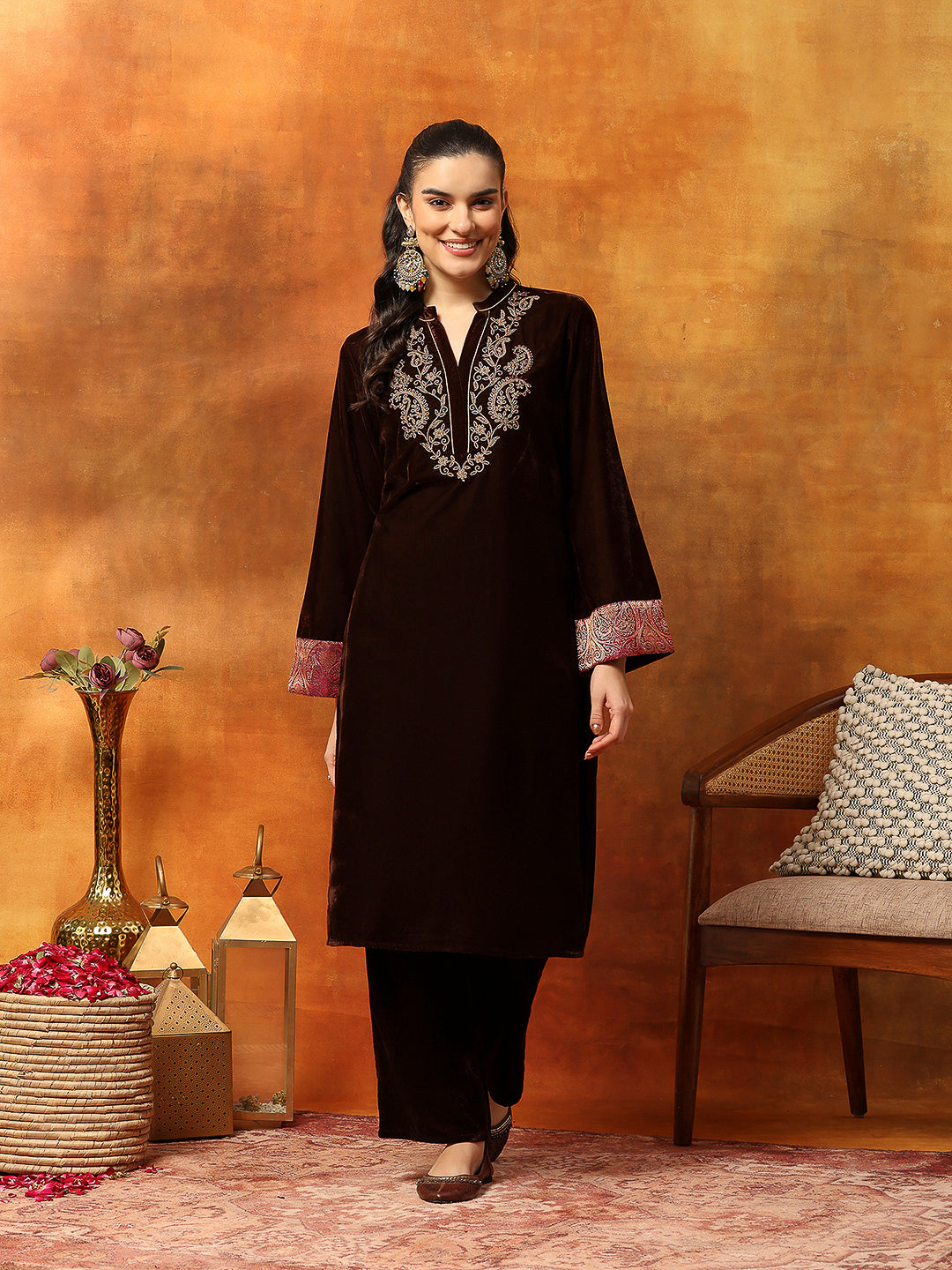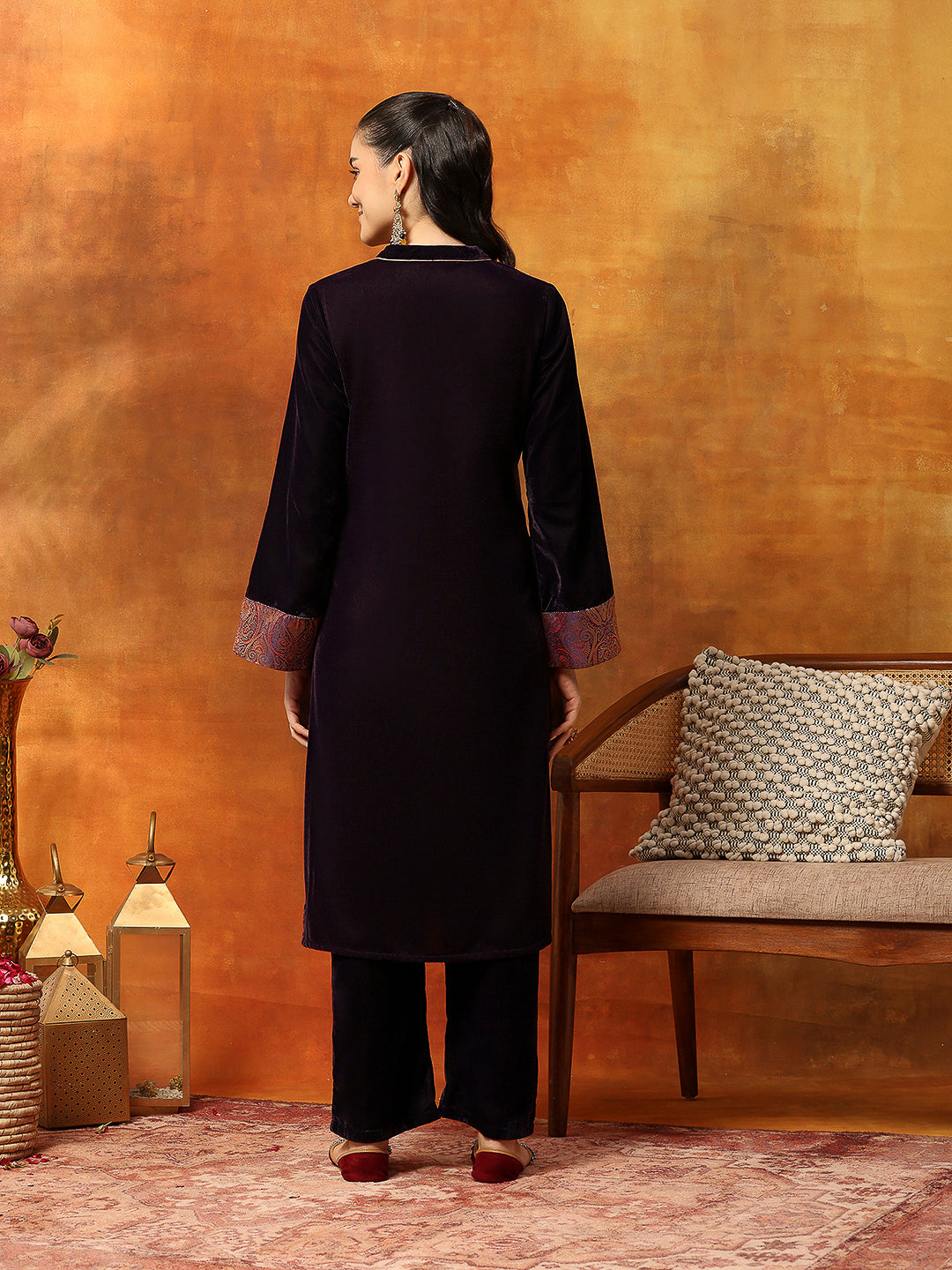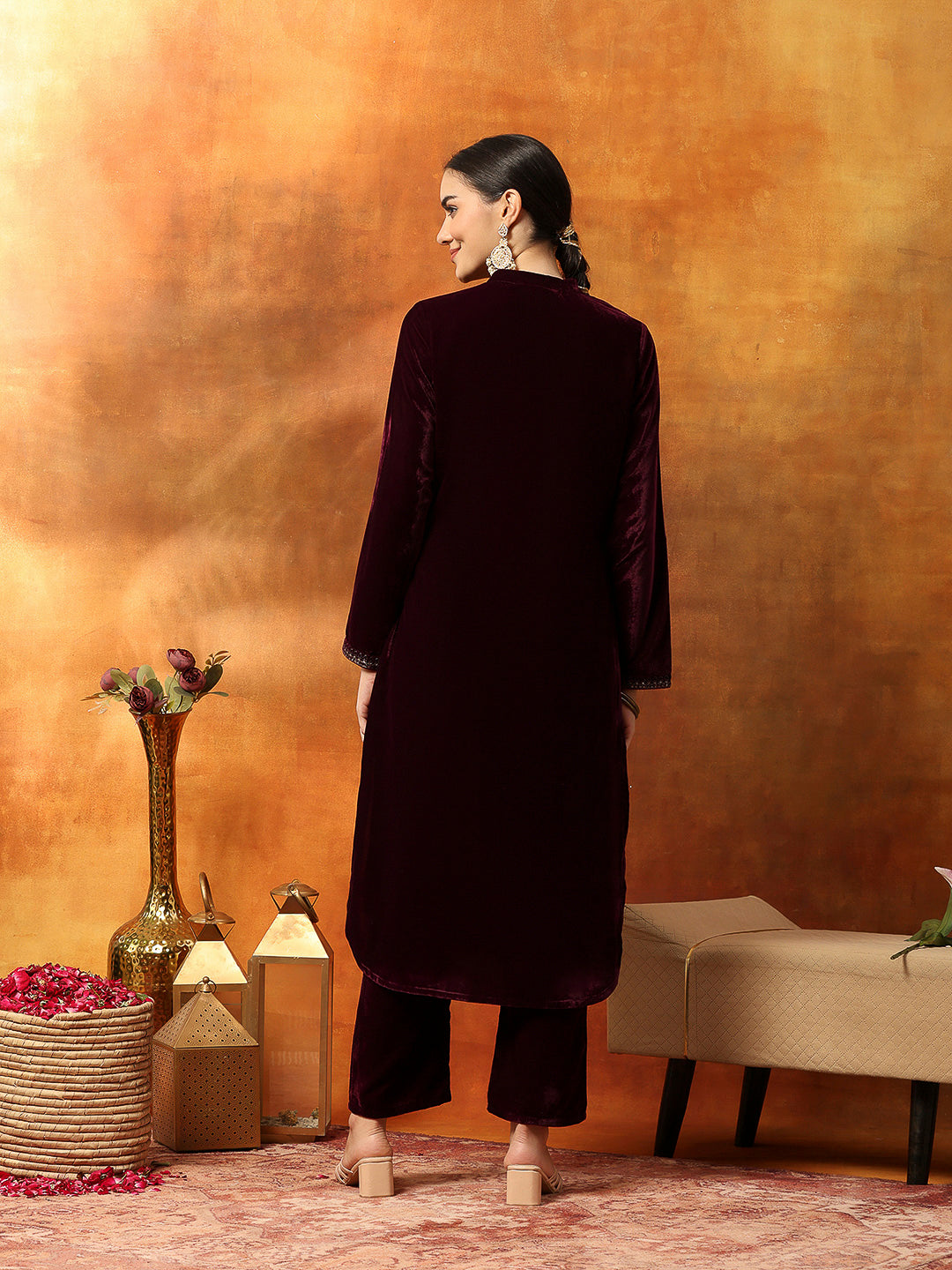 Velvet Kurta Set with Mandarin Collar & Zari Embroidered Yoke