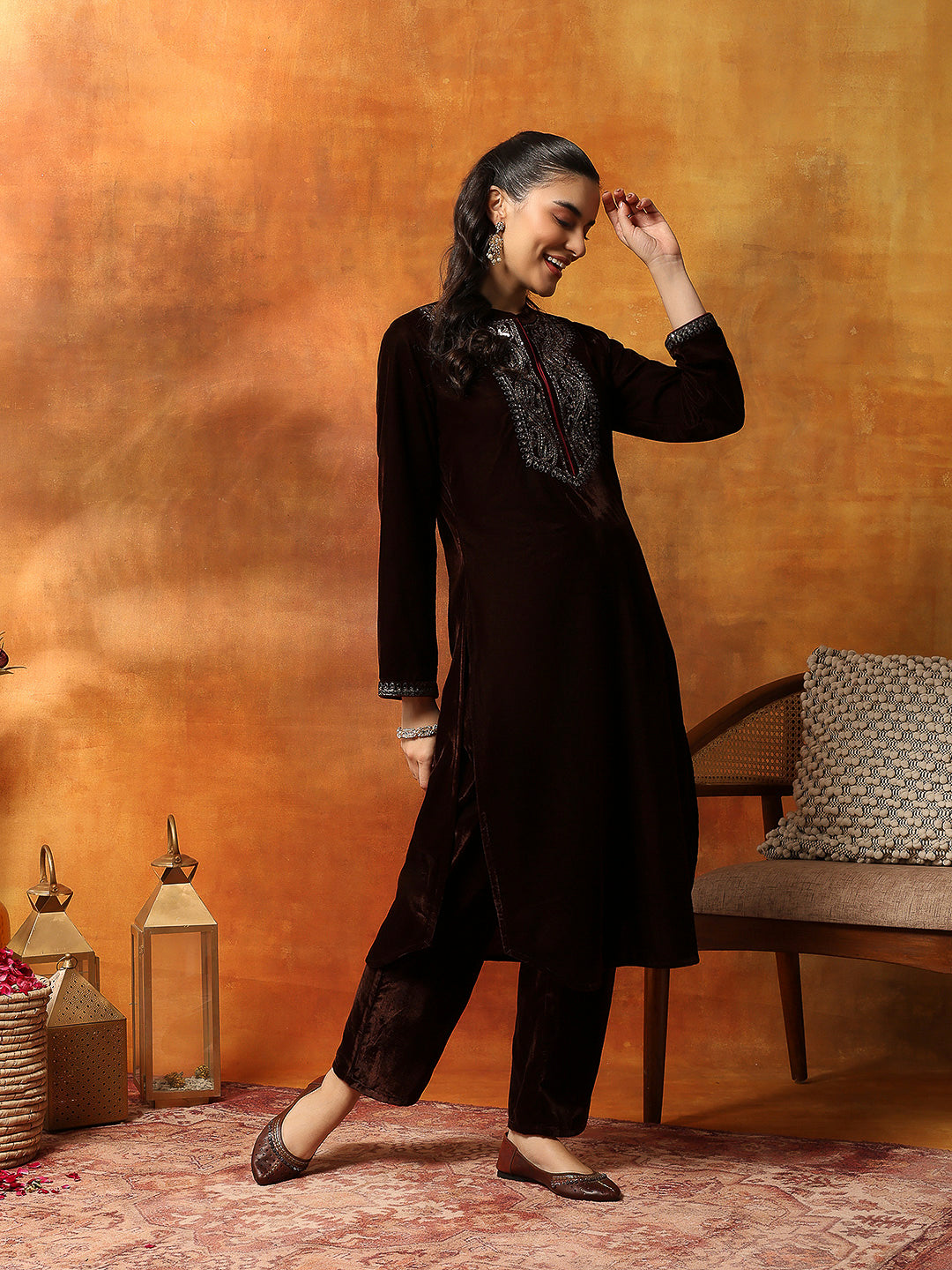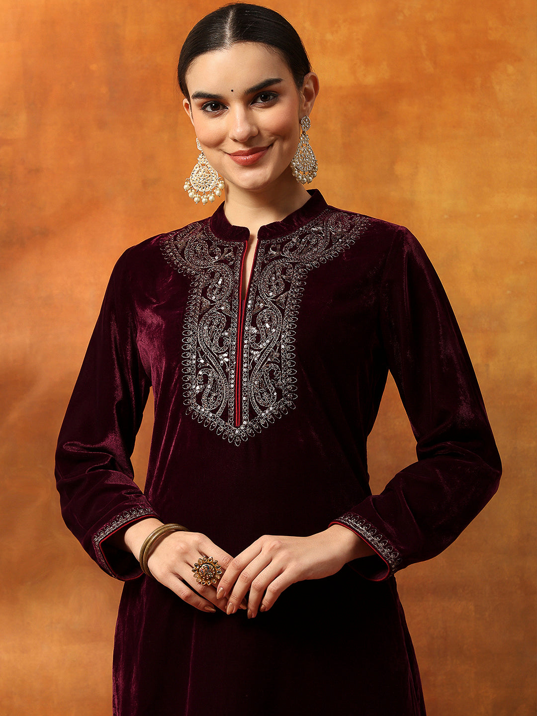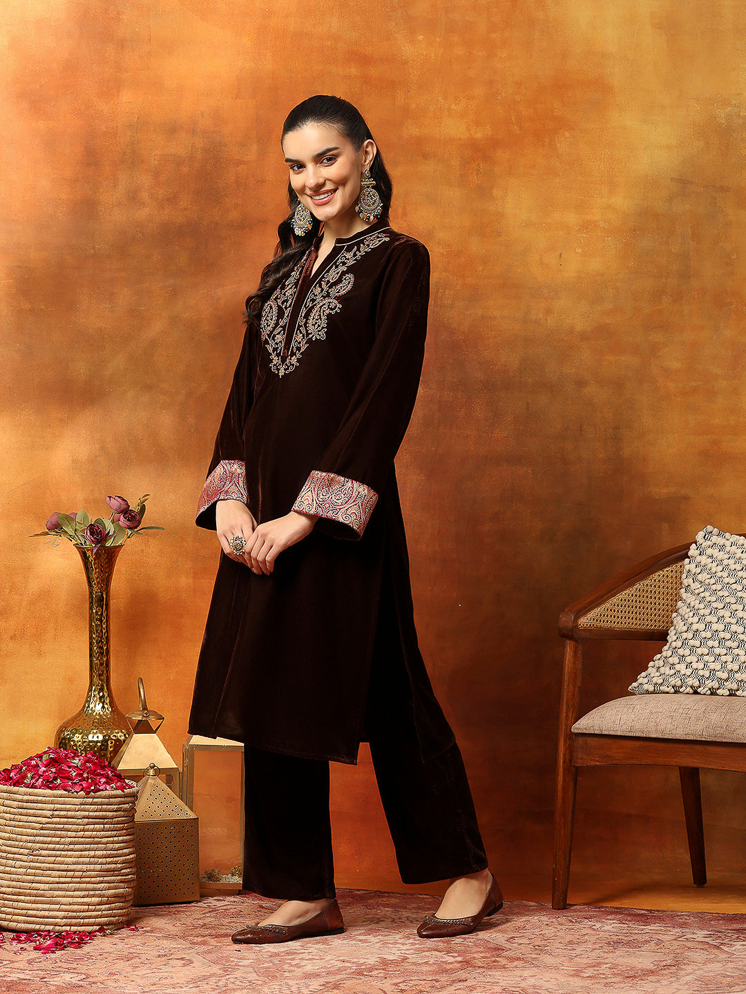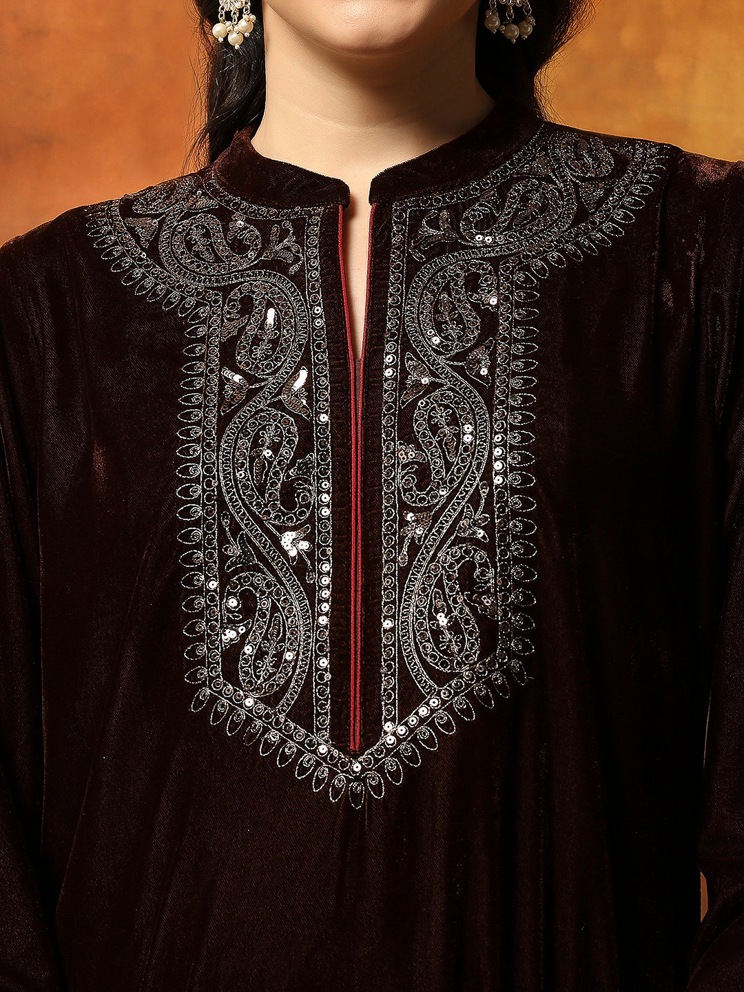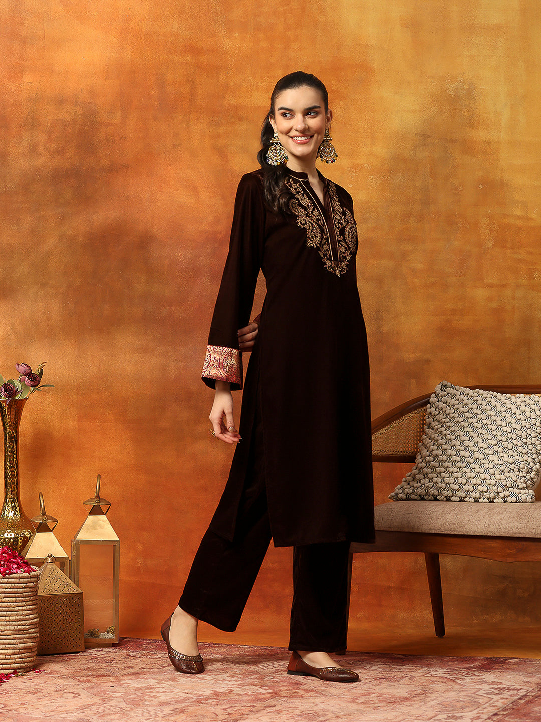 Velvet Kurta Set with Mandarin Collar & Zari Embroidered Yoke