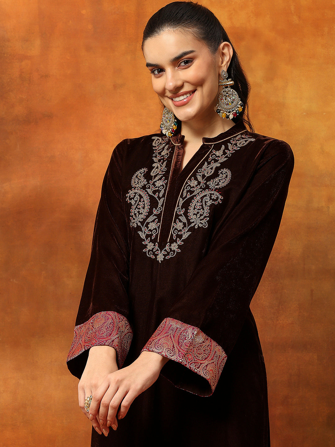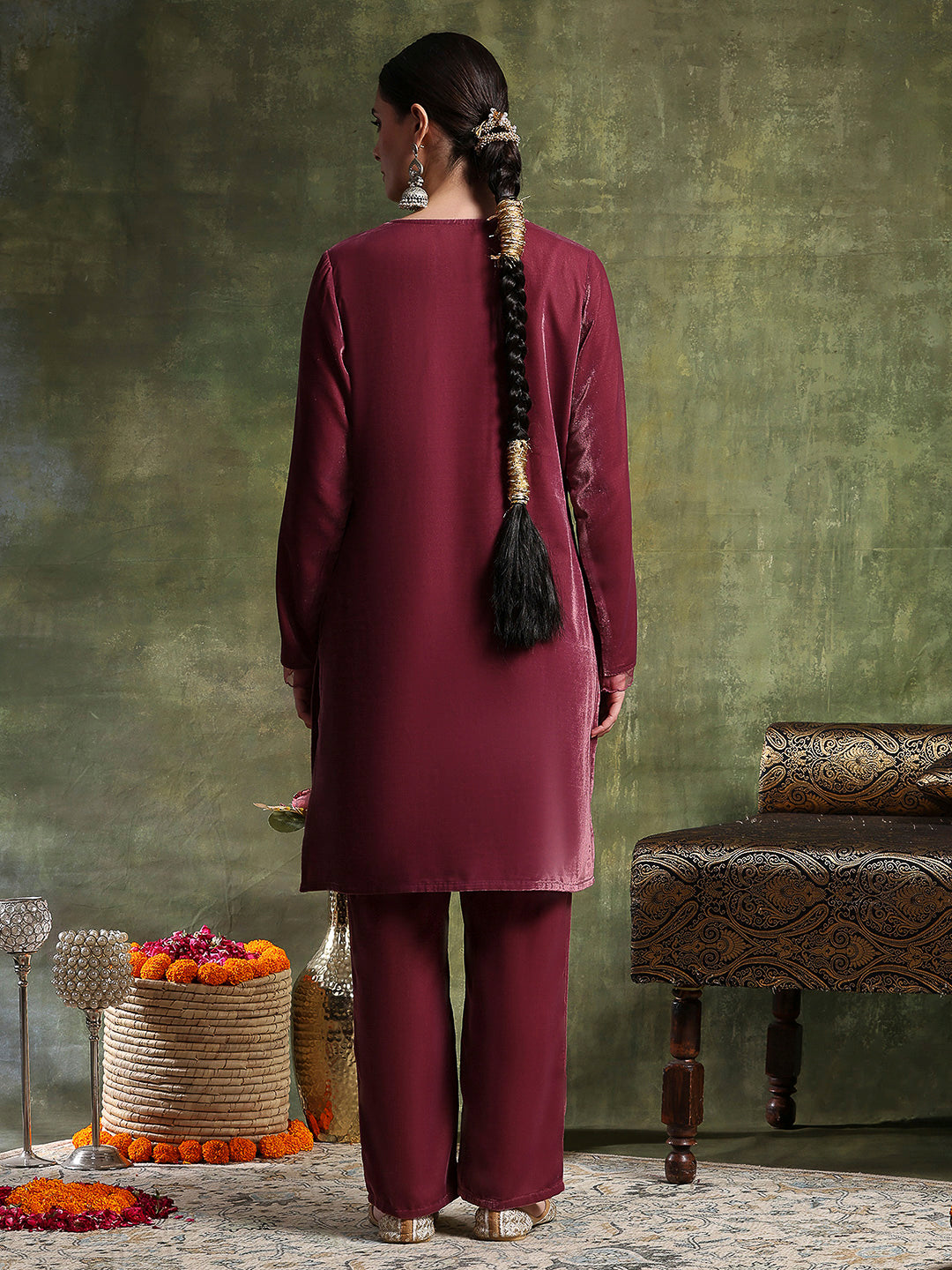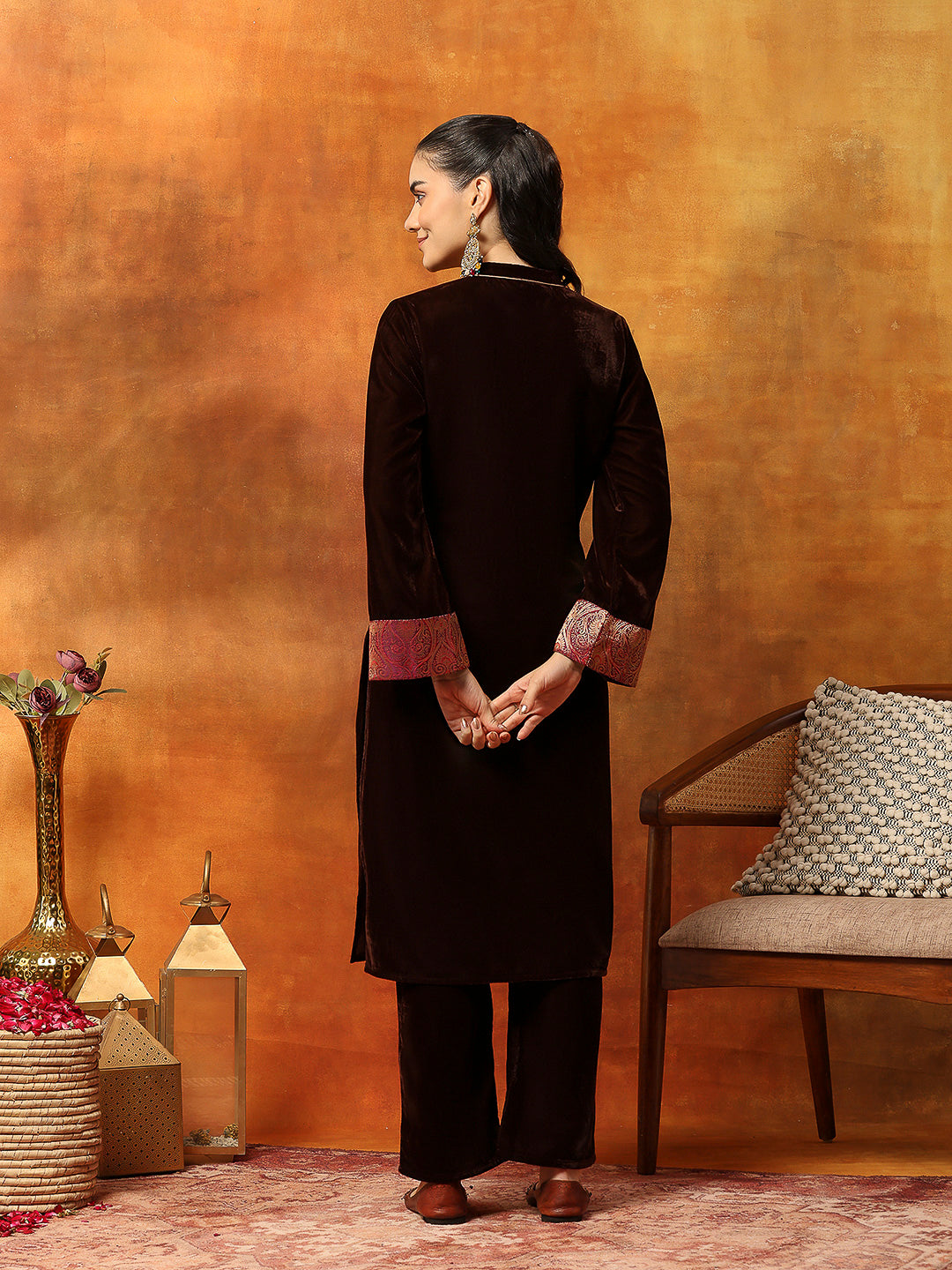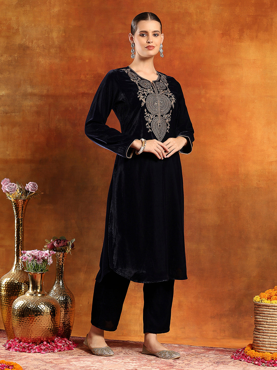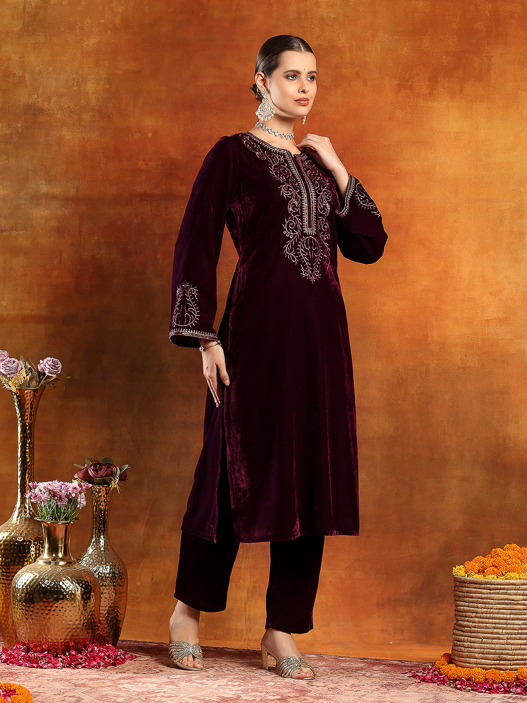 Velvet Kurta Set with Mandarin Collar & Zari Embroidered Yoke
