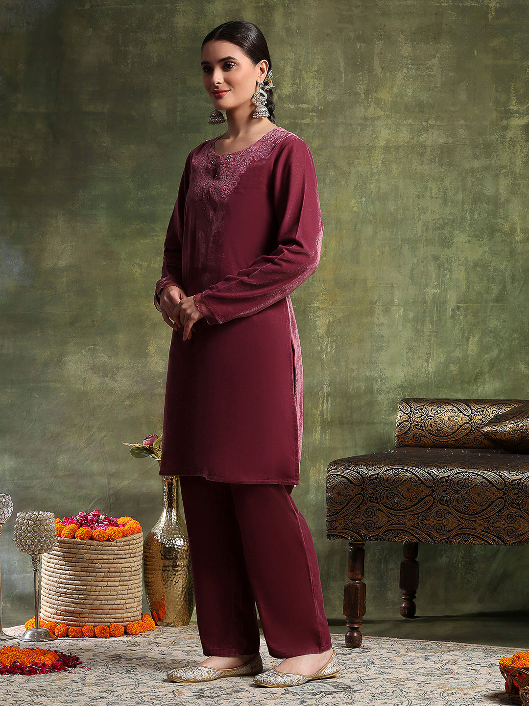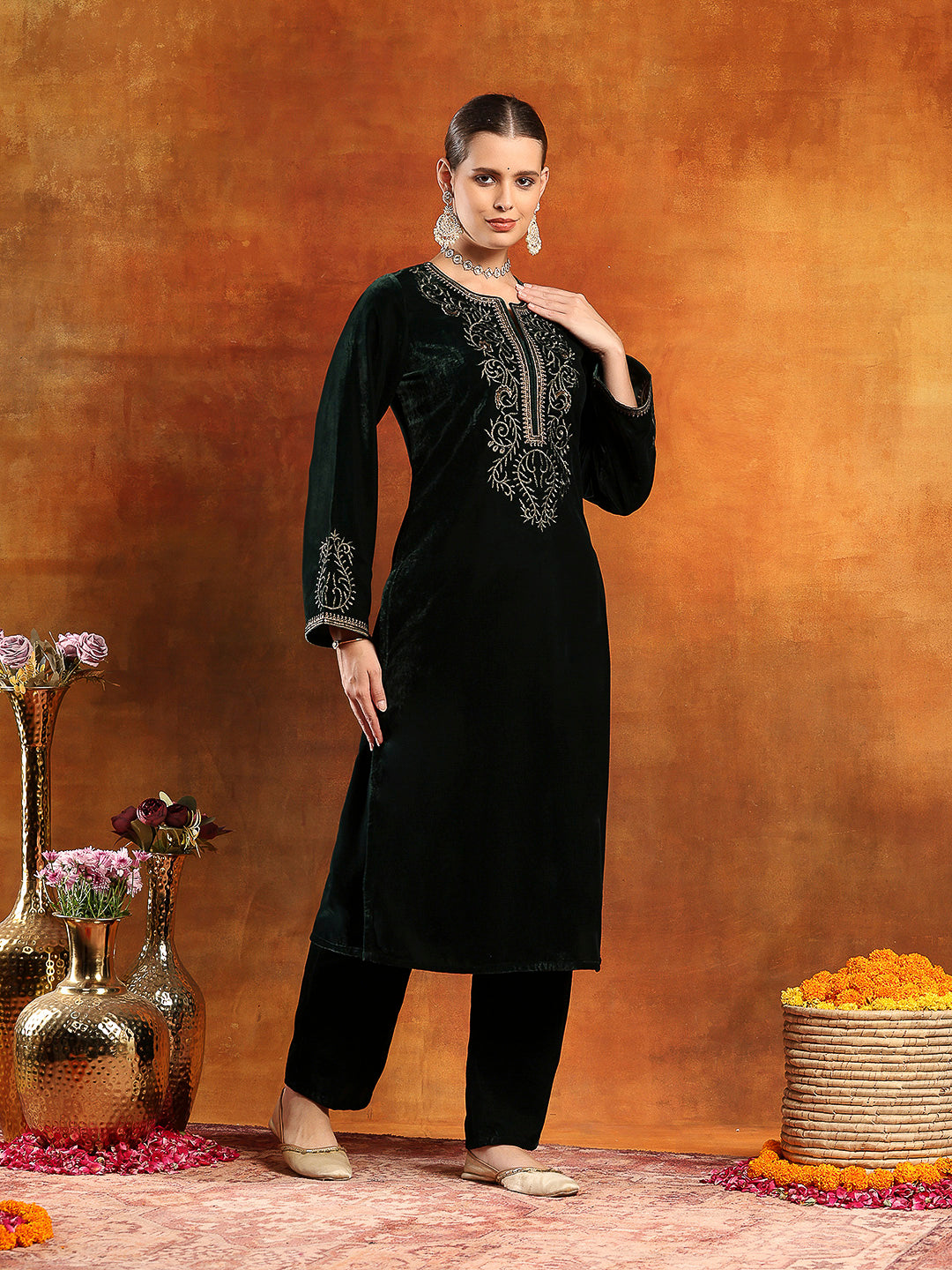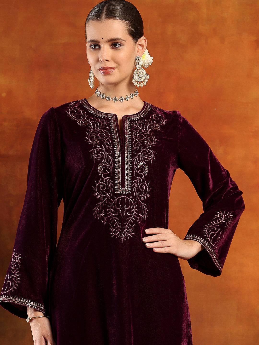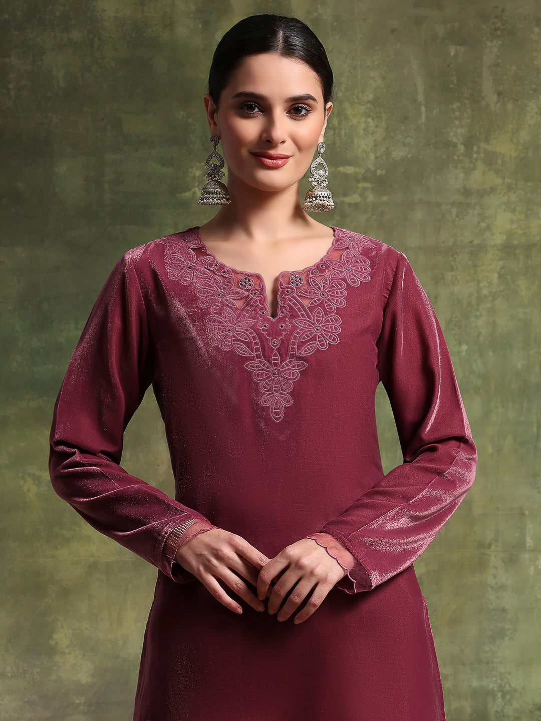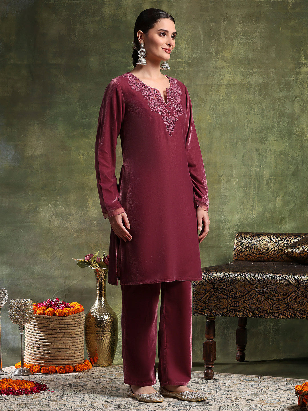 Velvet Kurta Set with Mandarin Collar & Zari Embroidered Yoke