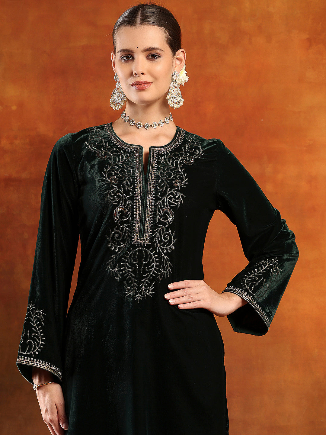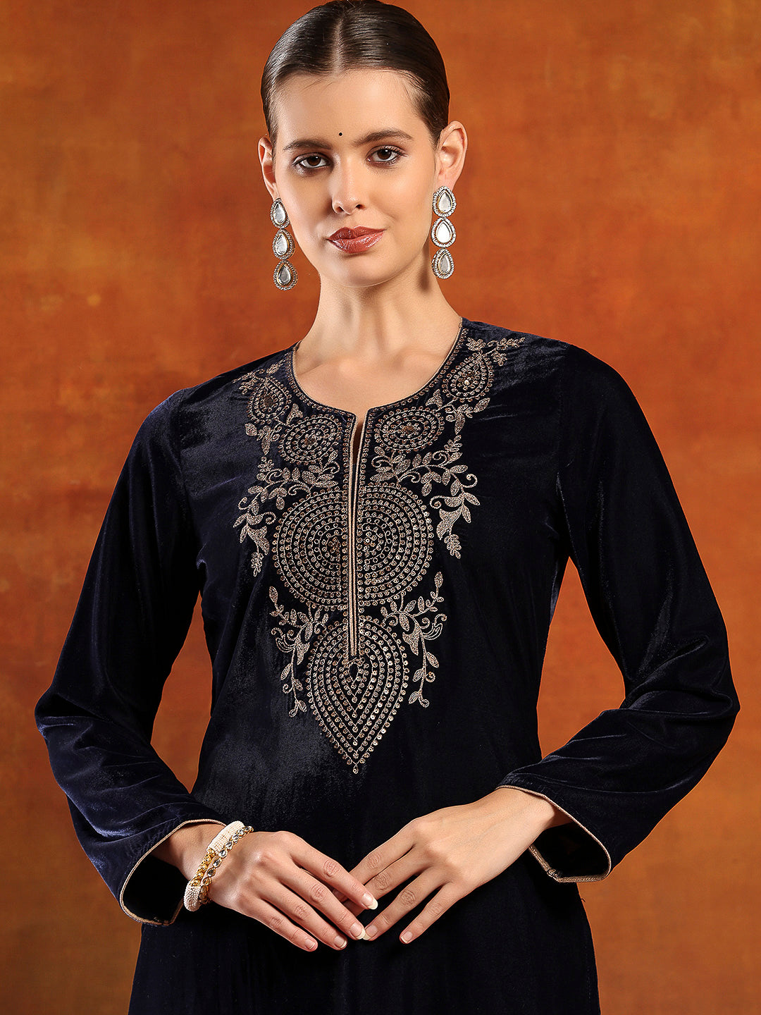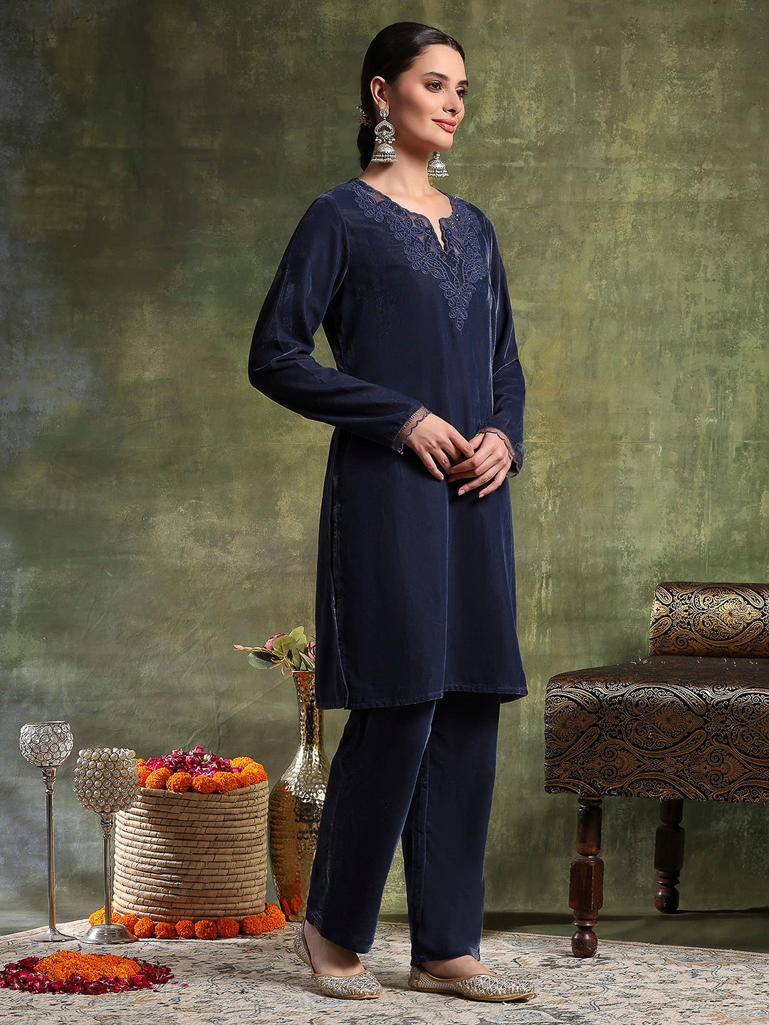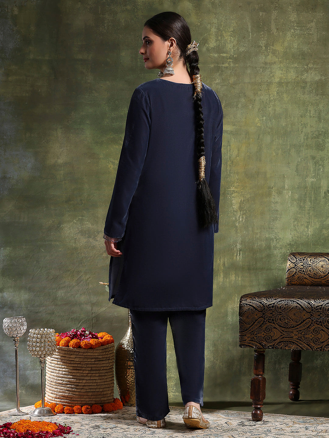 Velvet Kurta Set with Mandarin Collar & Zari Embroidered Yoke