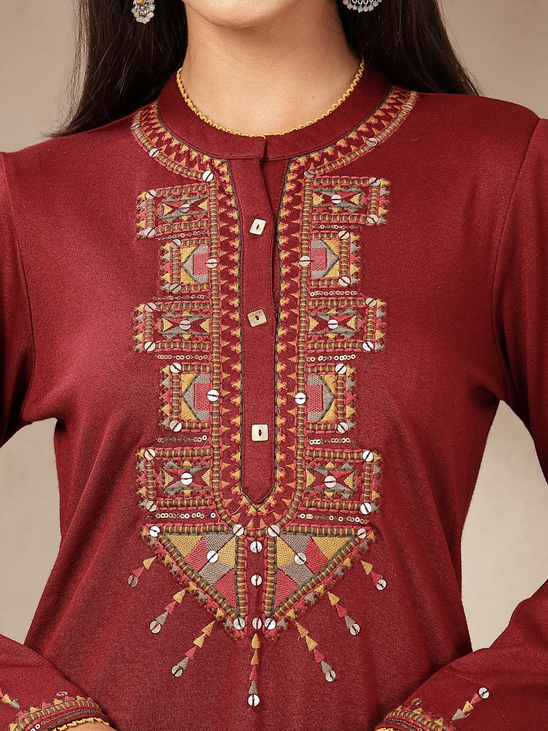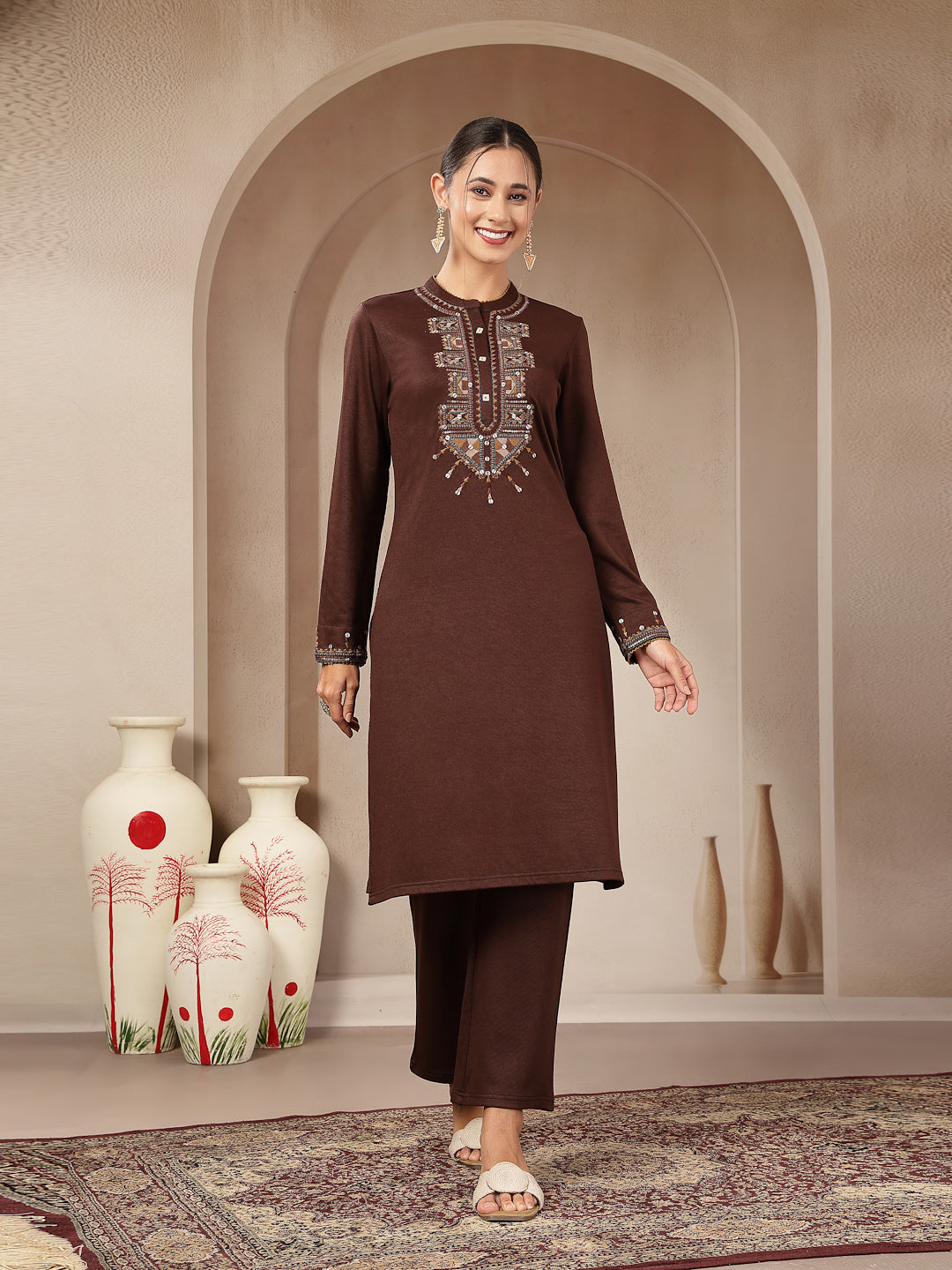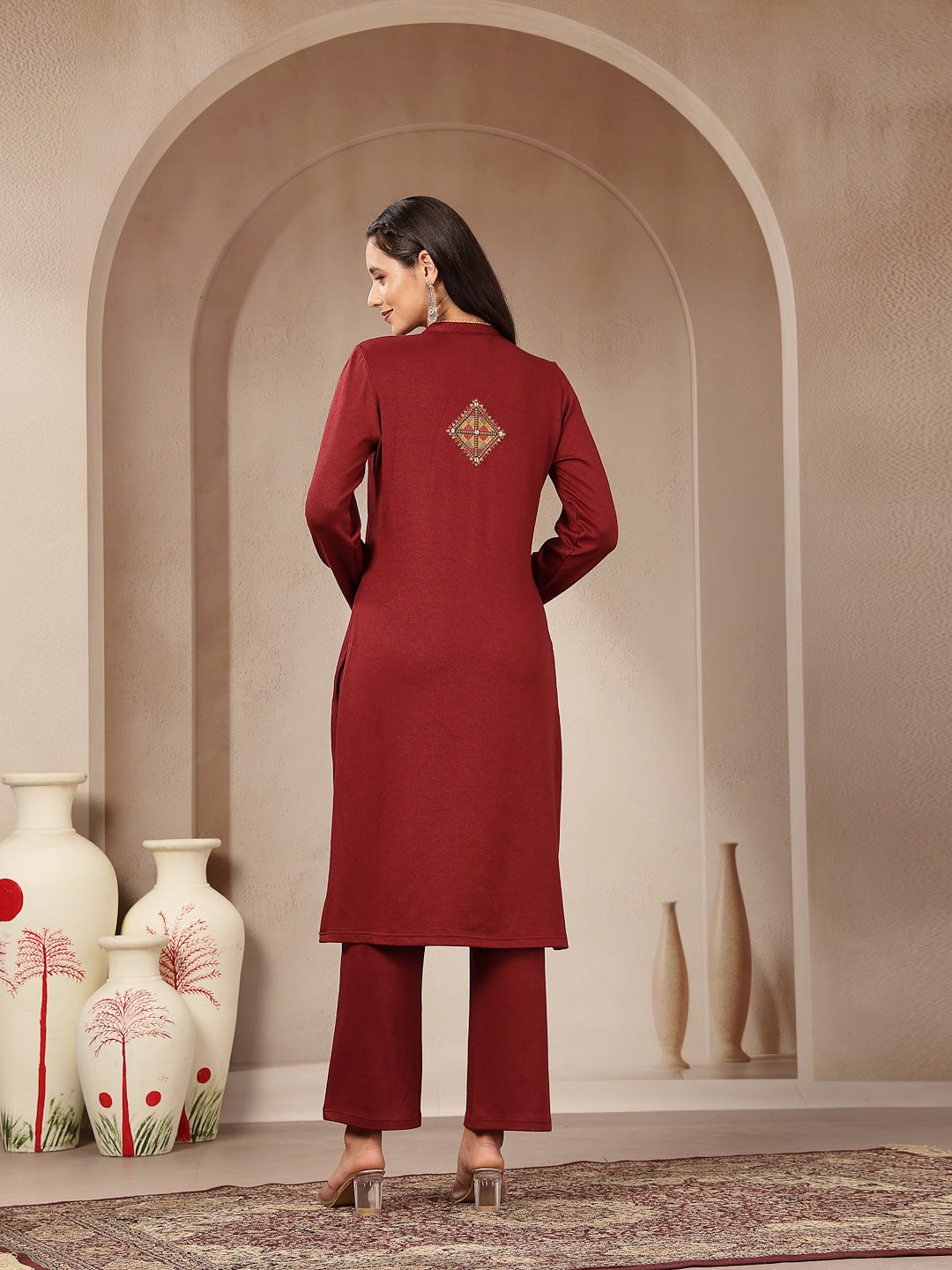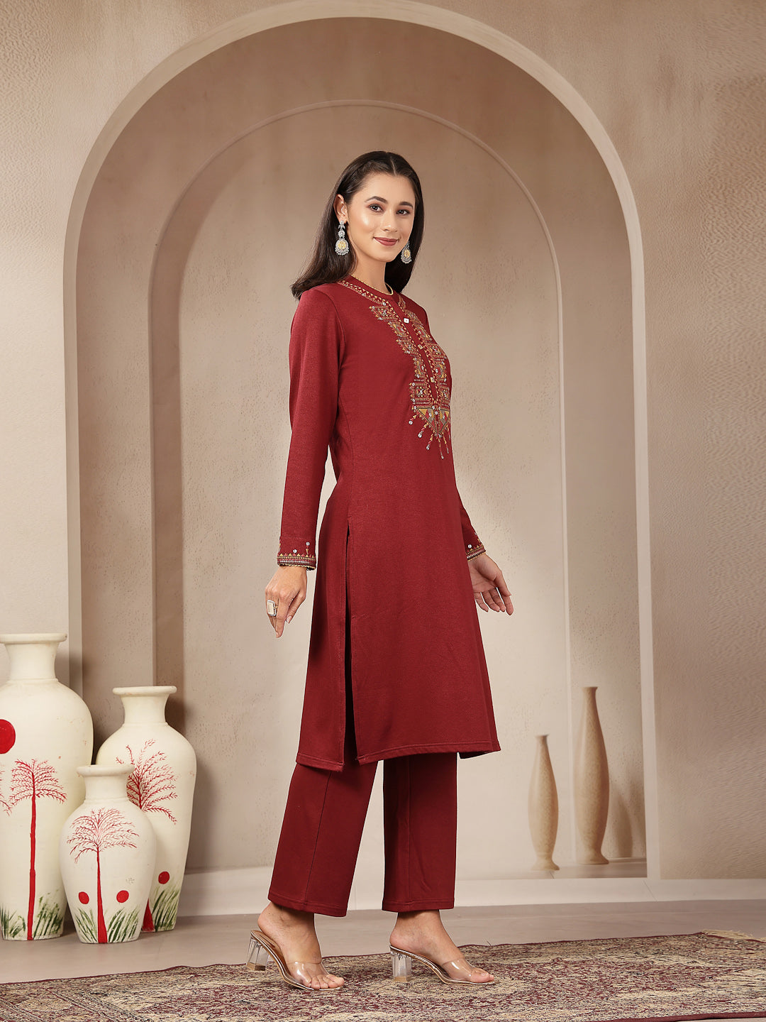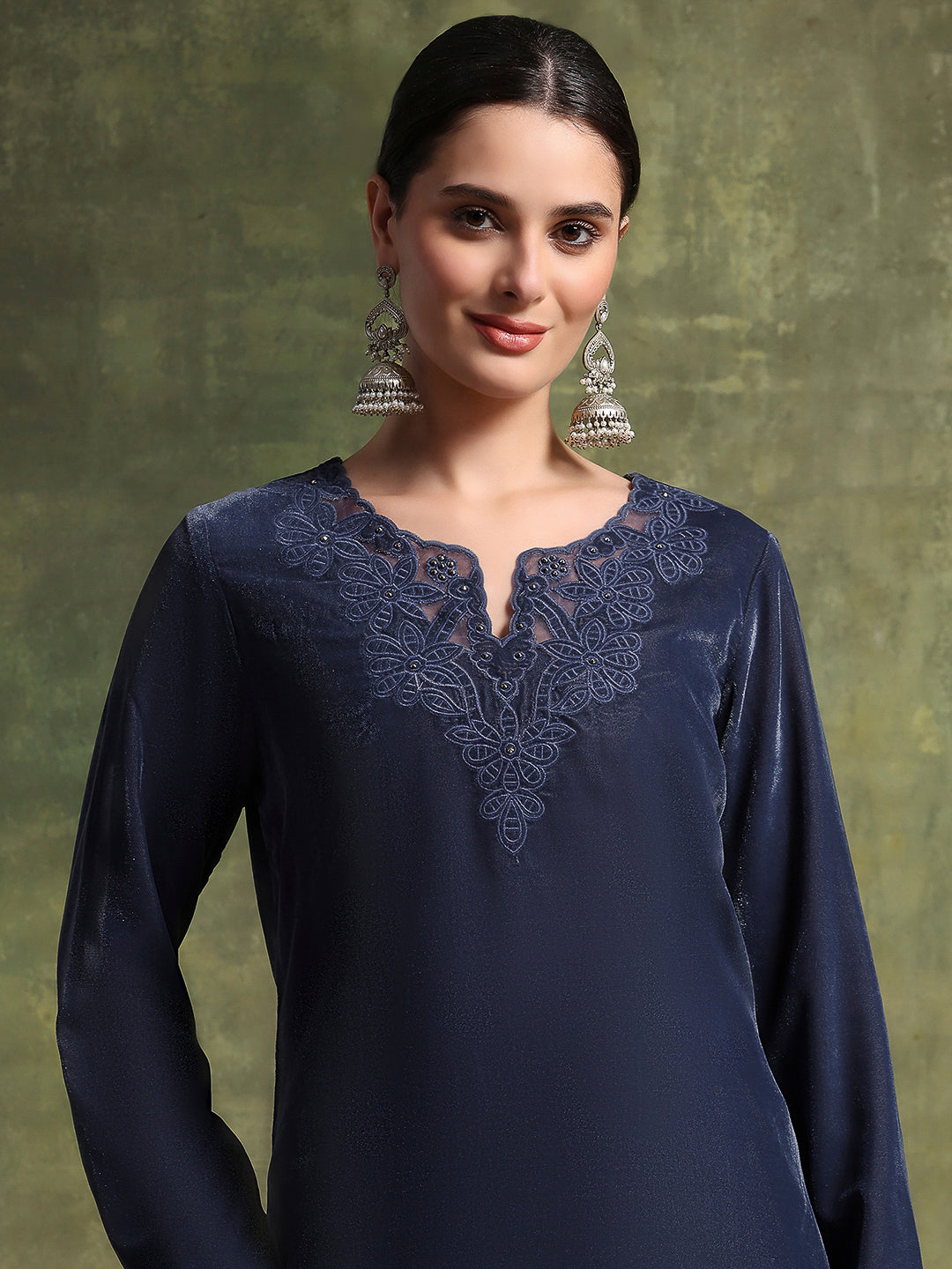 Velvet Kurta Set with Mandarin Collar & Zari Embroidered Yoke