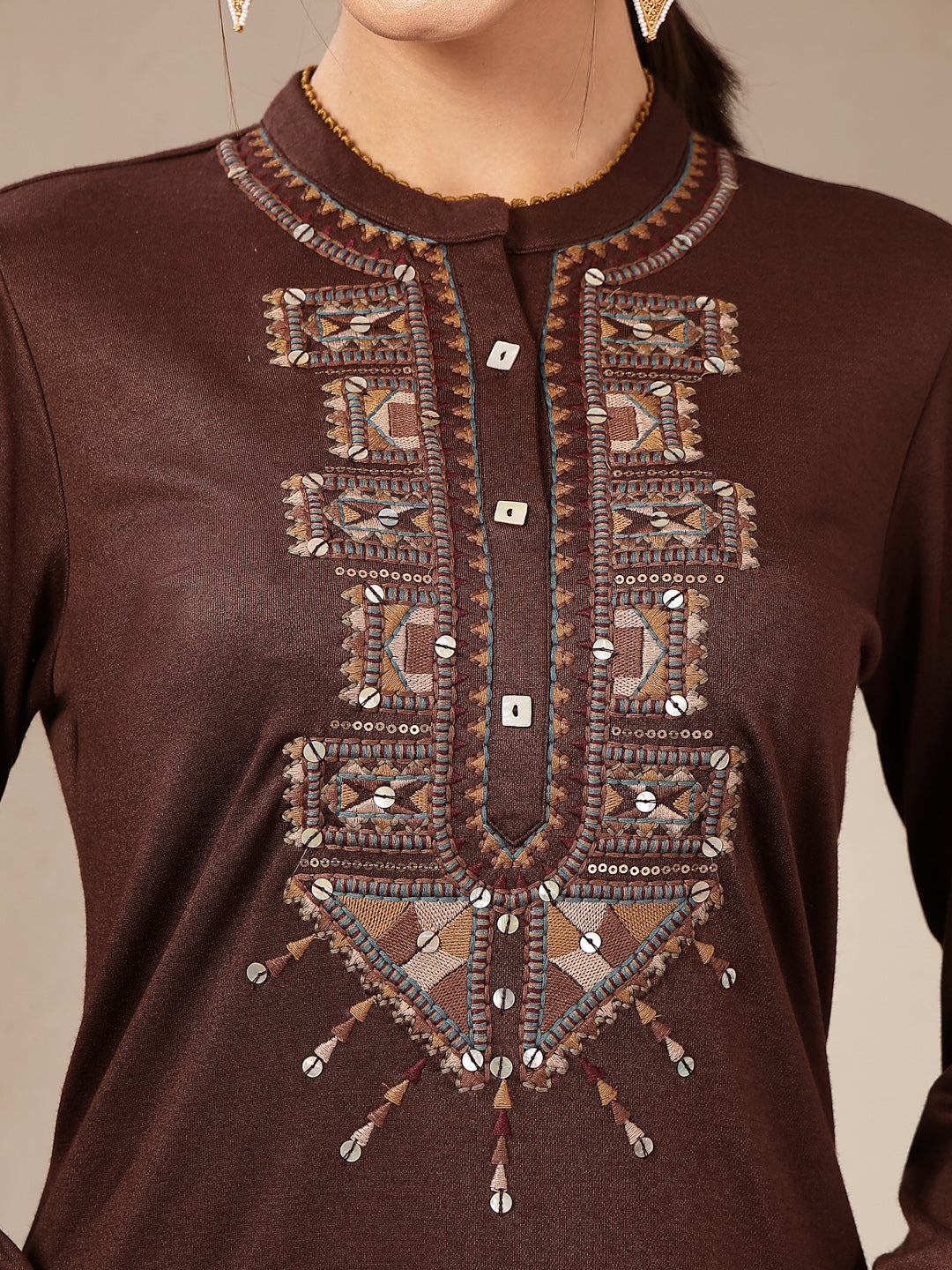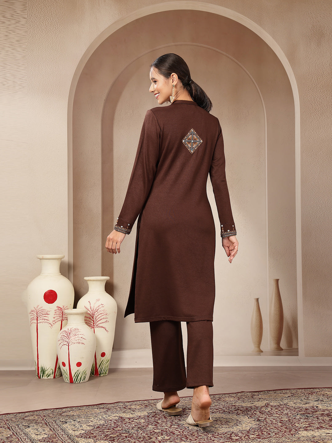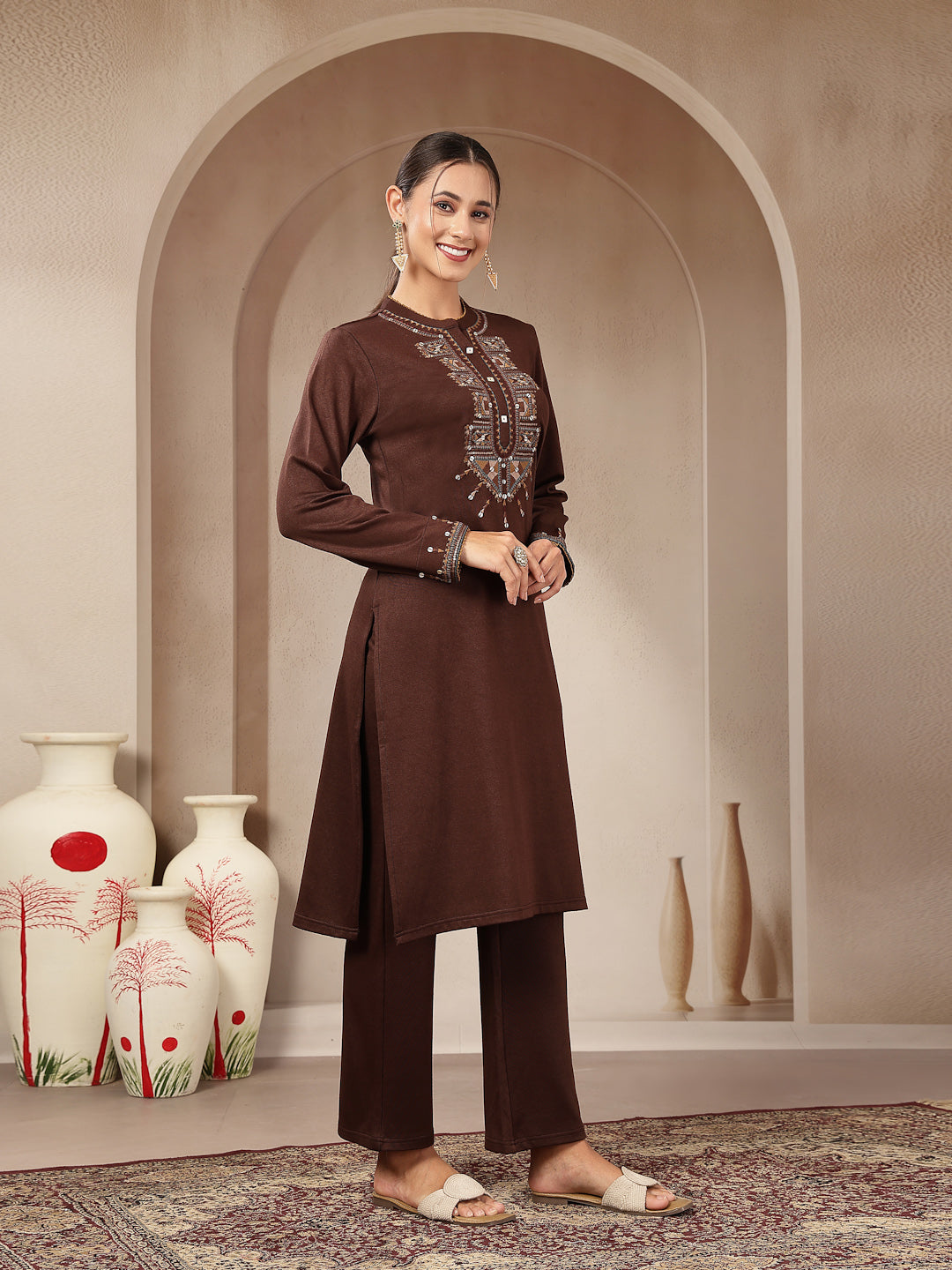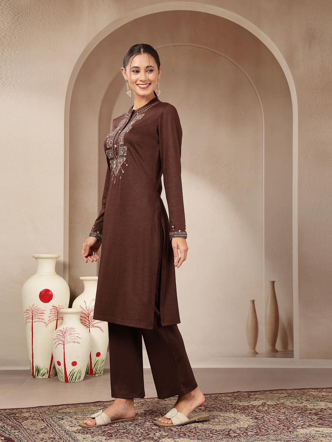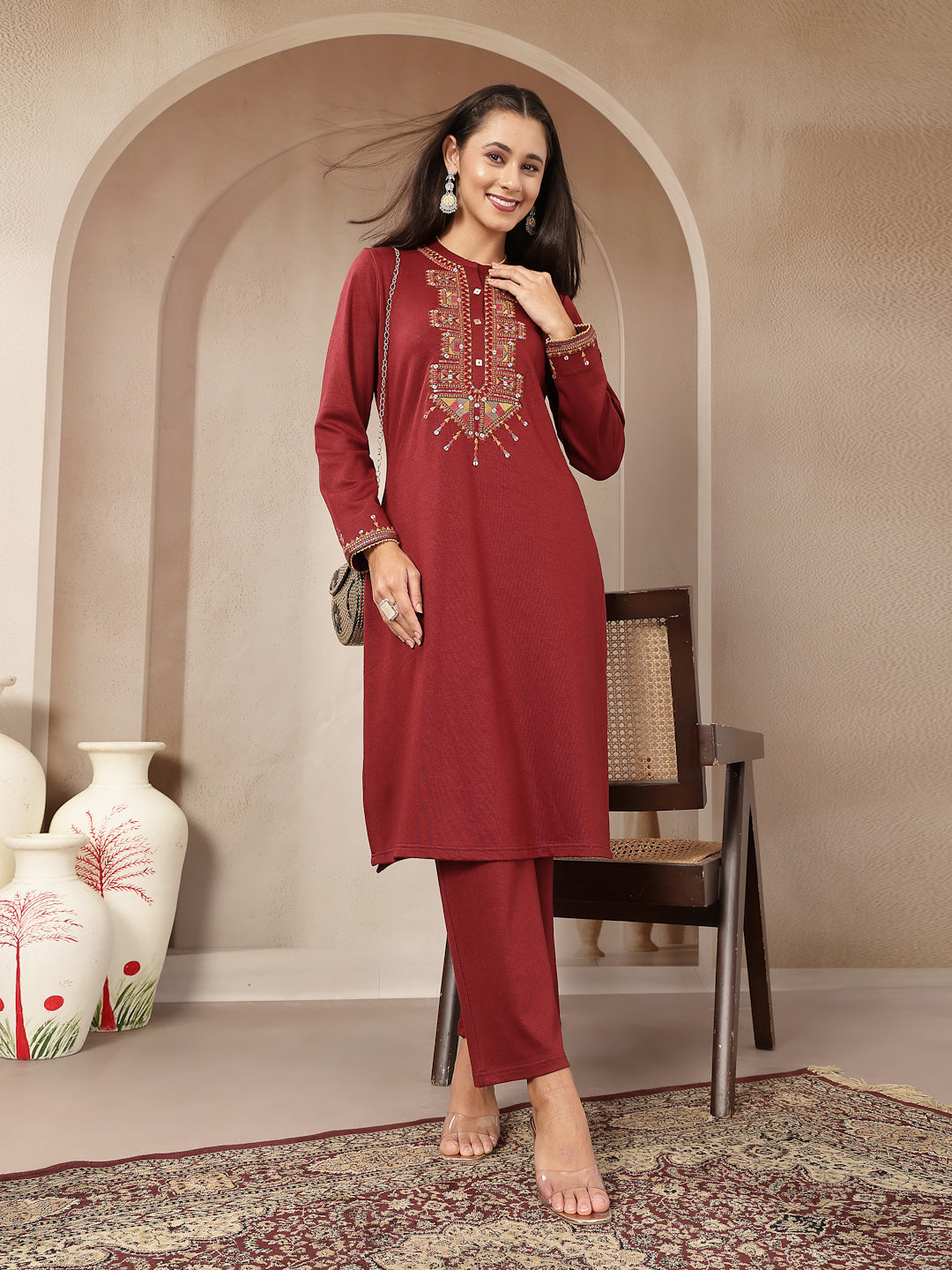 Velvet Kurta Set with Mandarin Collar & Zari Embroidered Yoke