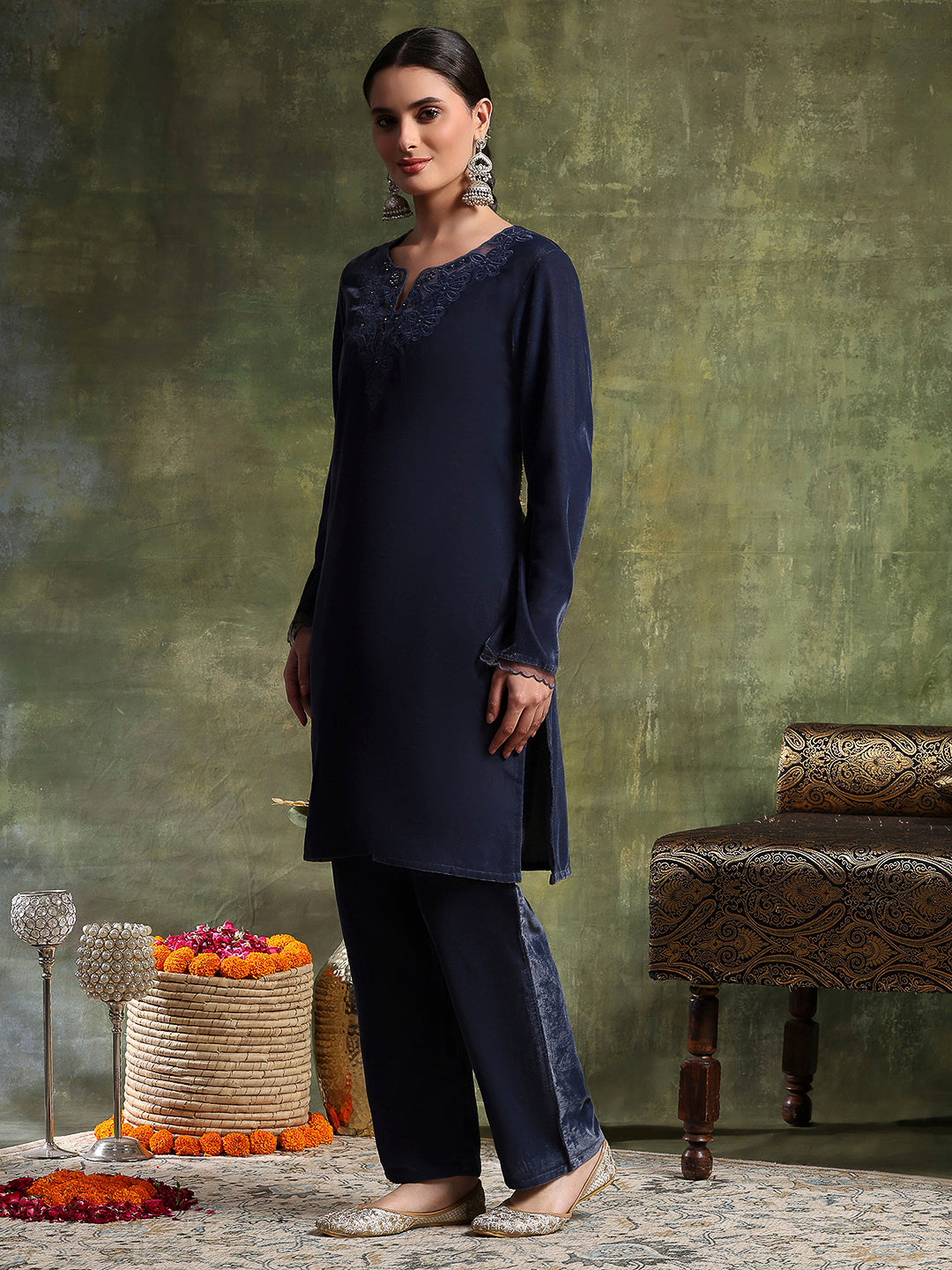 Velvet Embroidered Kurta Set with Organza Patti Sleeves & Palazzo