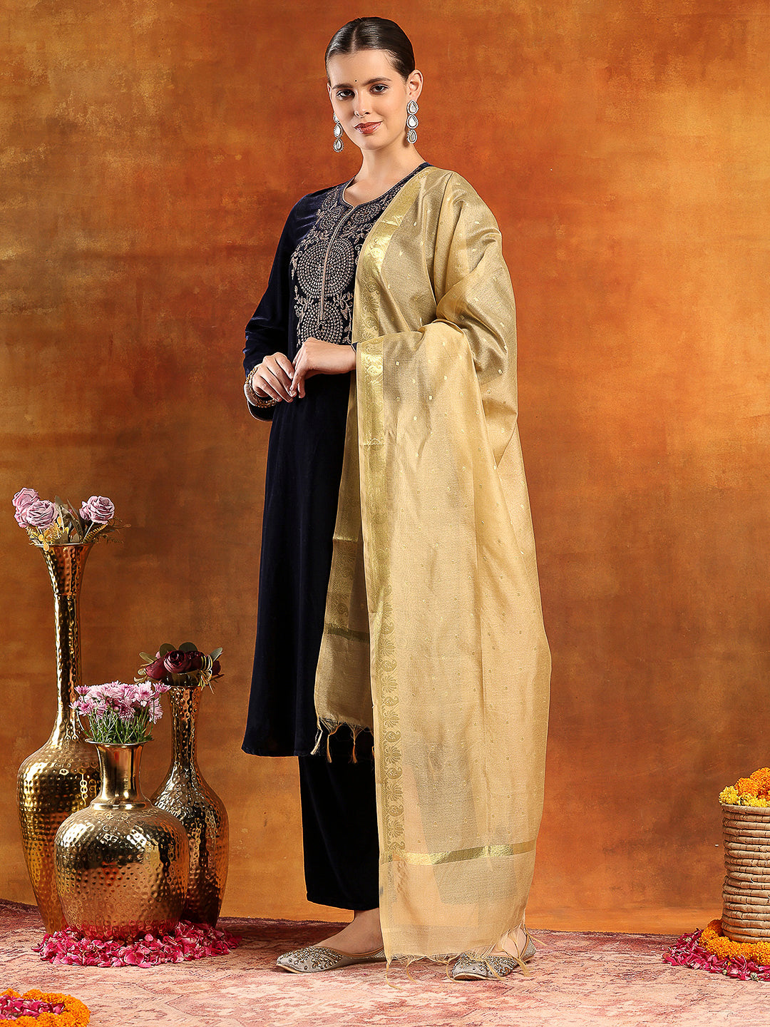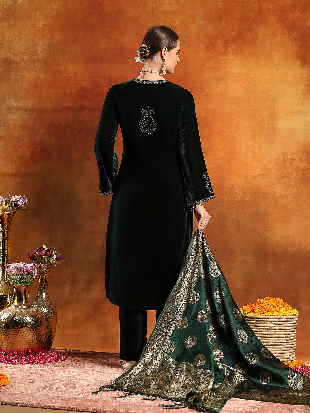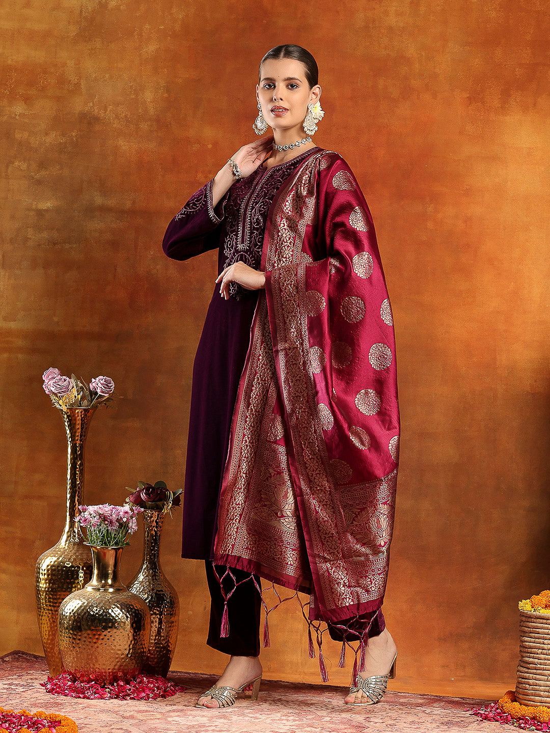 Velvet Straight Kurta Set with Zari Embroidery & Banarasi Dupatta