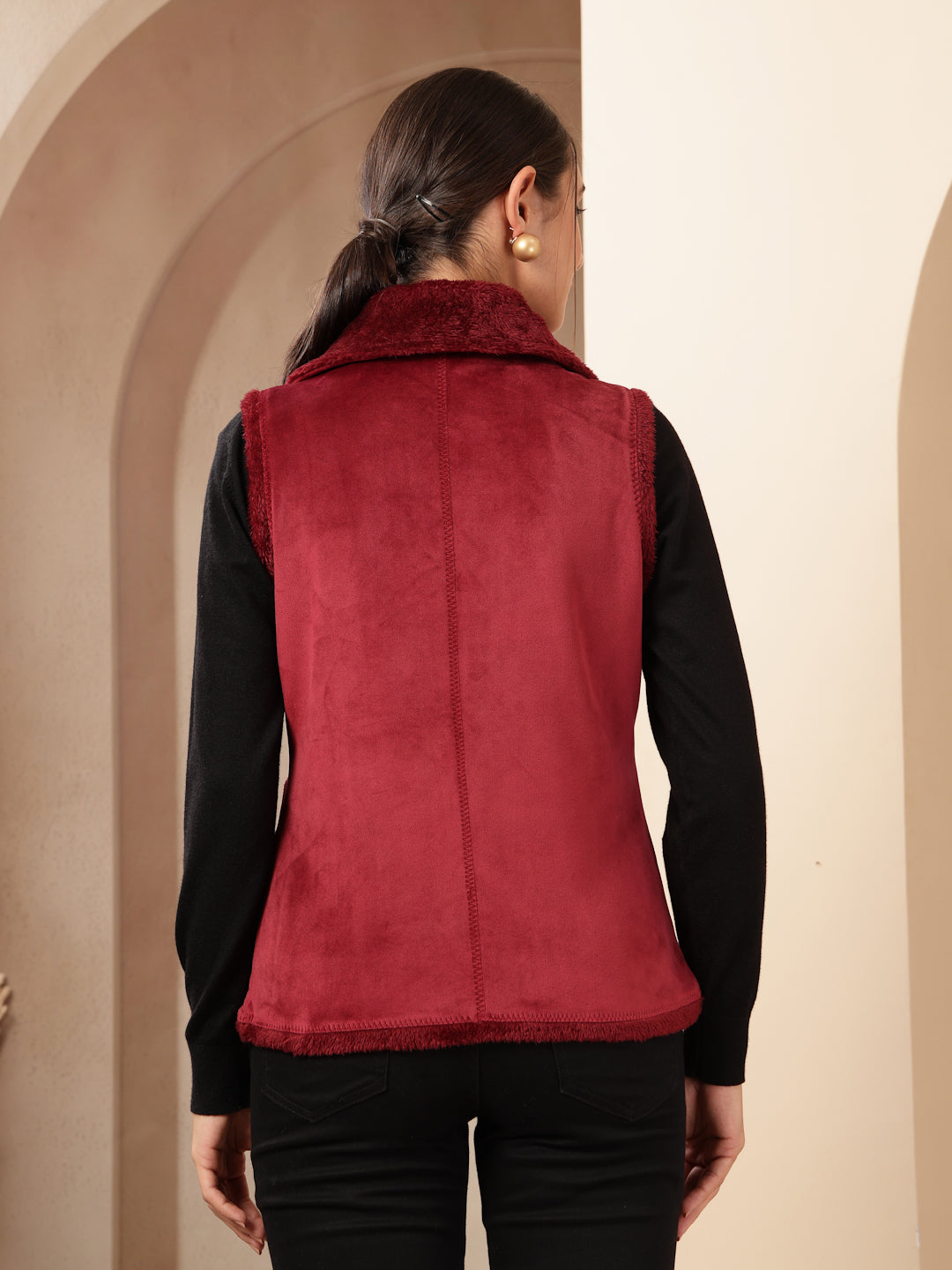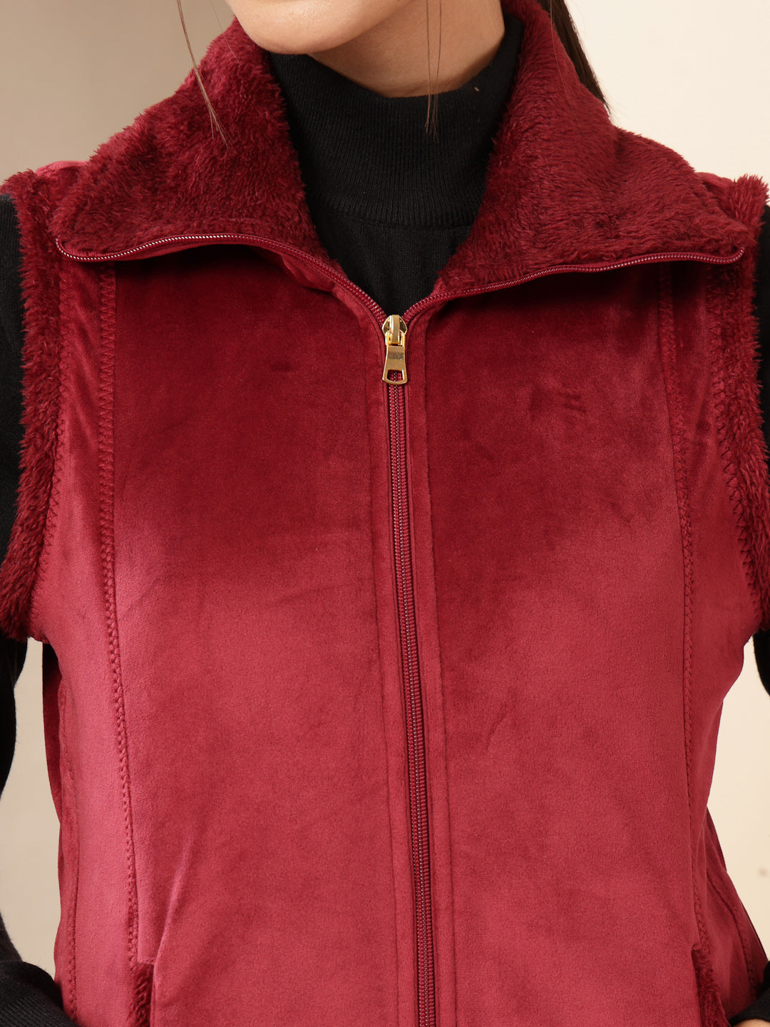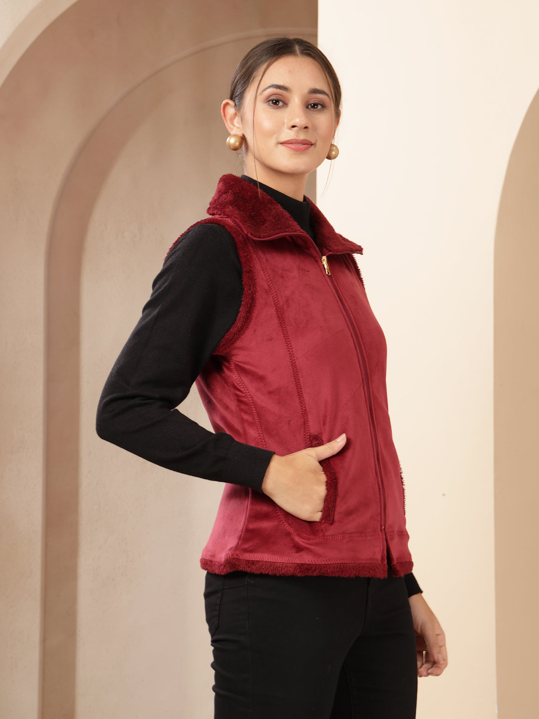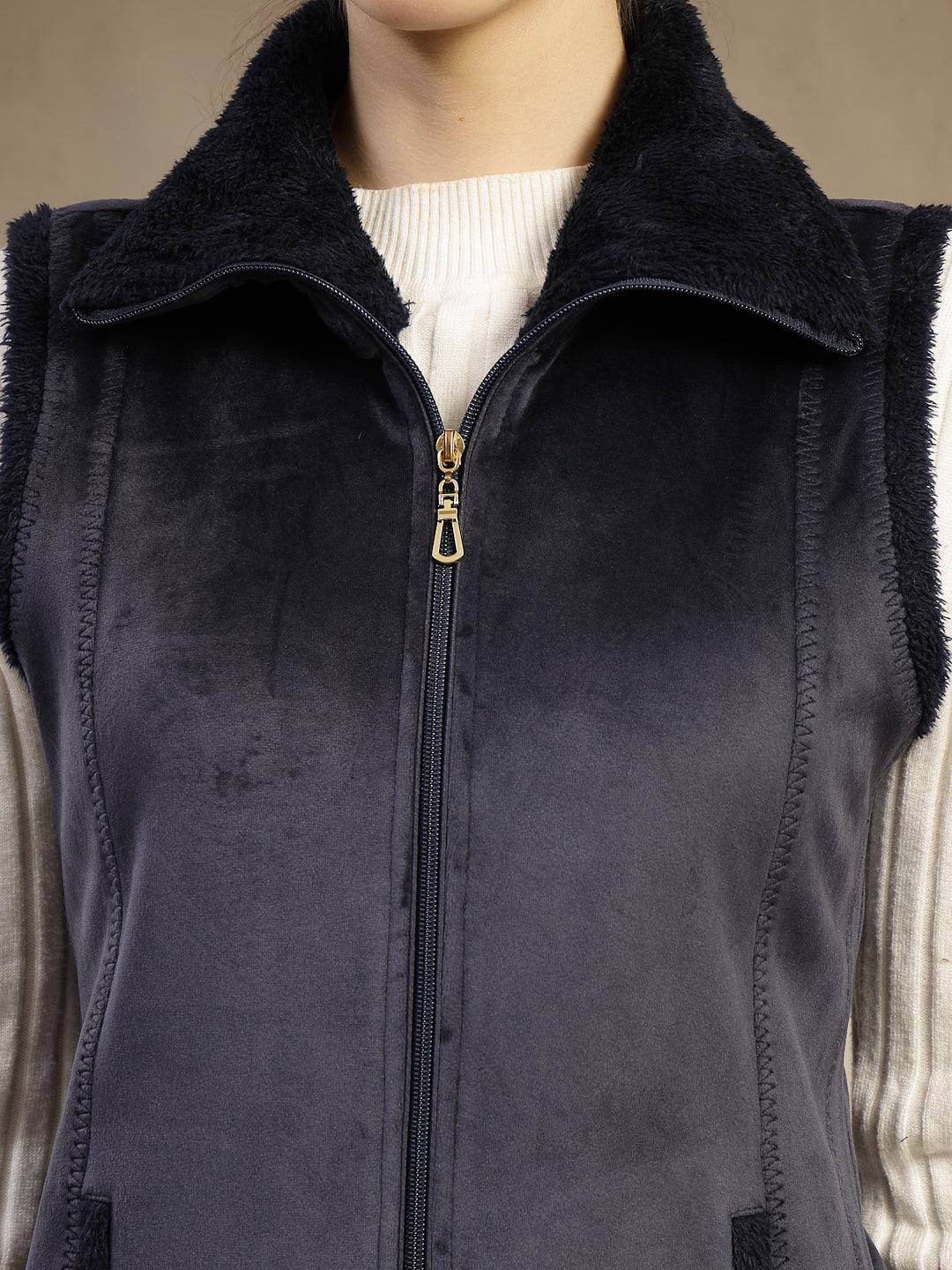 Velour Fur Sleeveless Jacket with Structured Collar & Zipper Closure