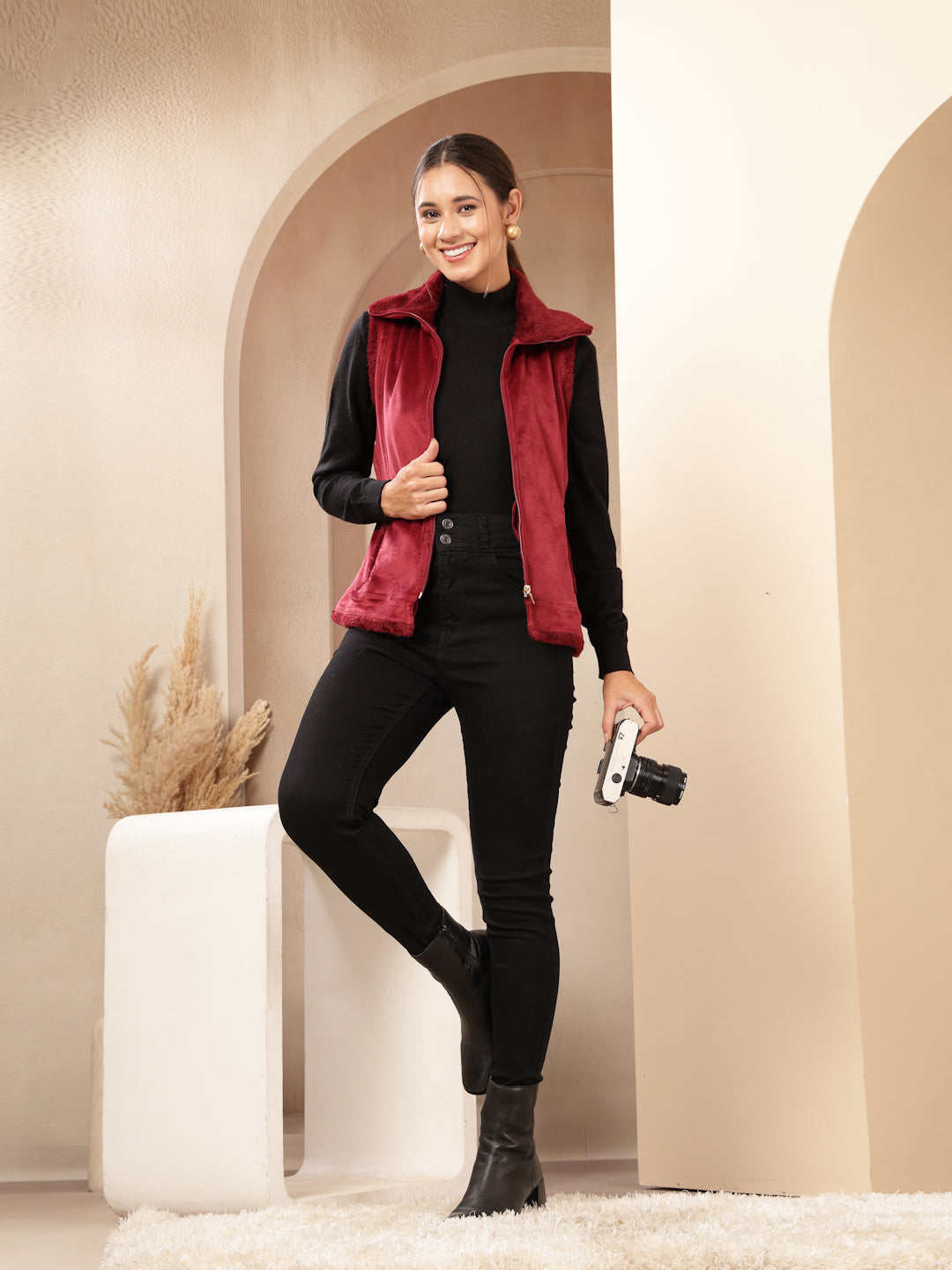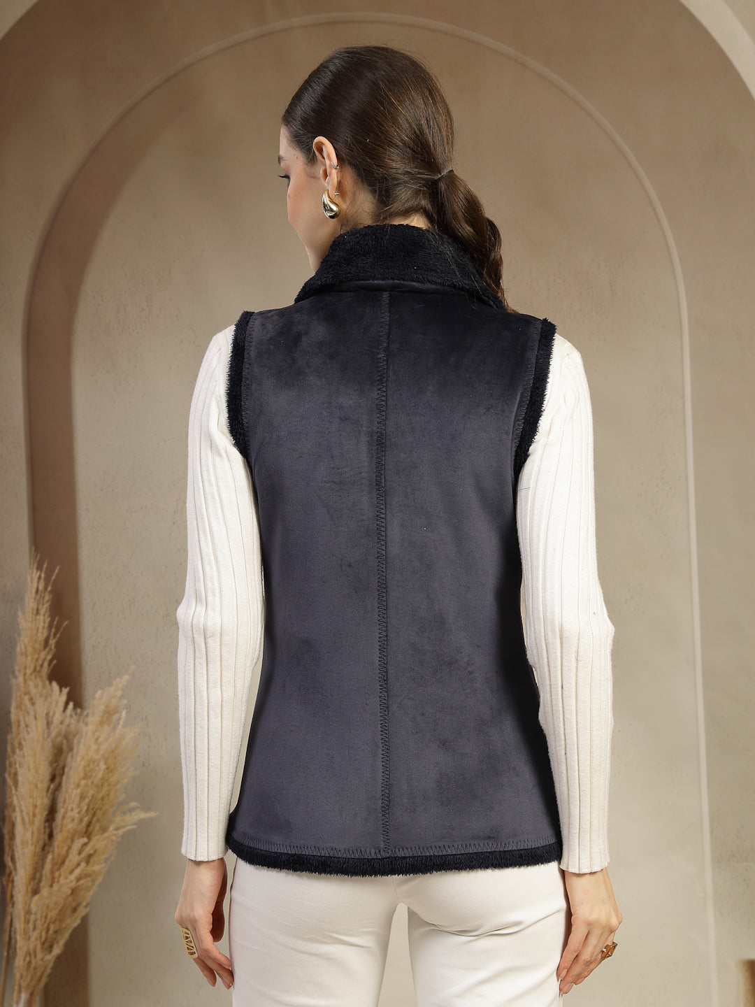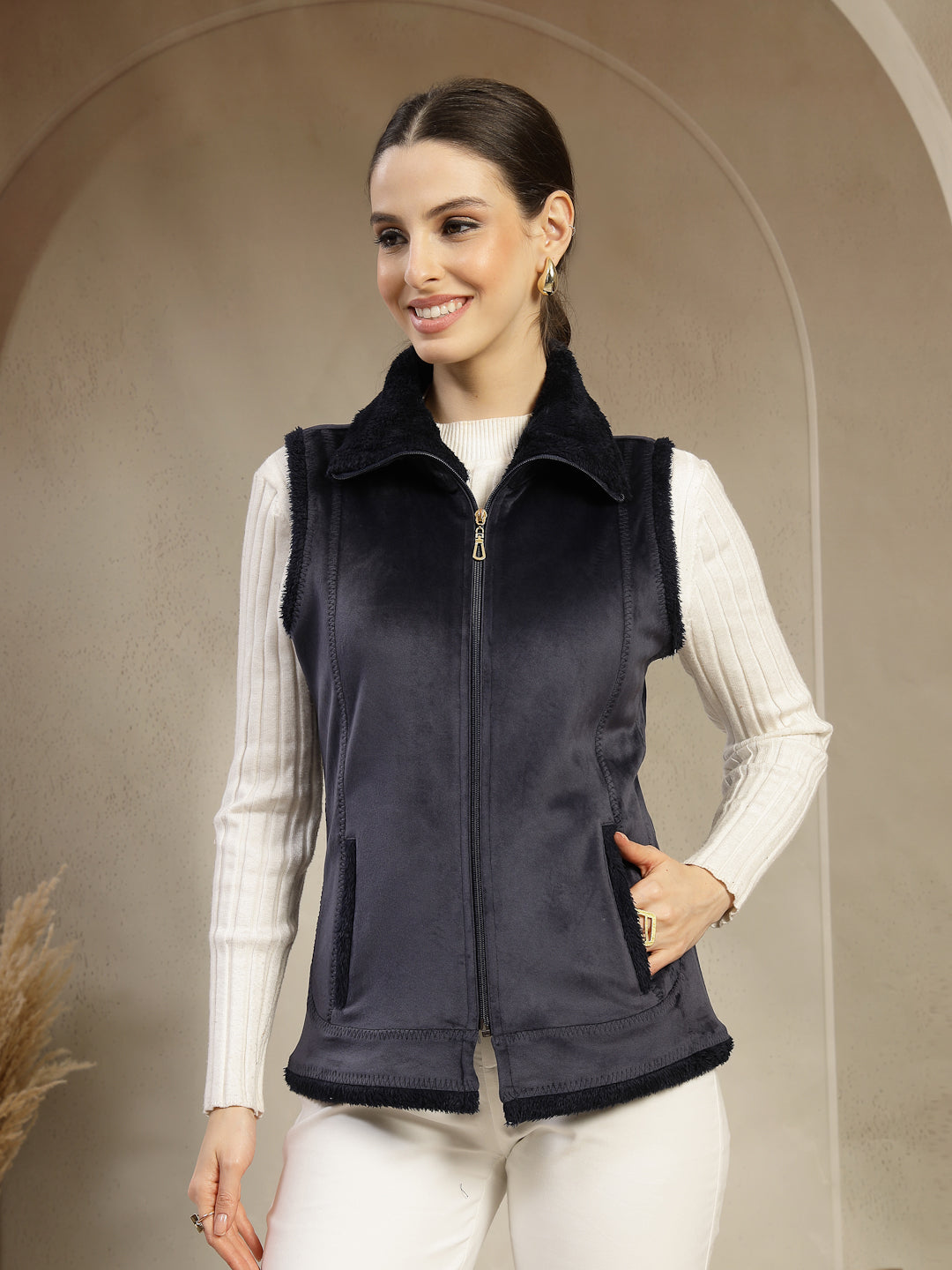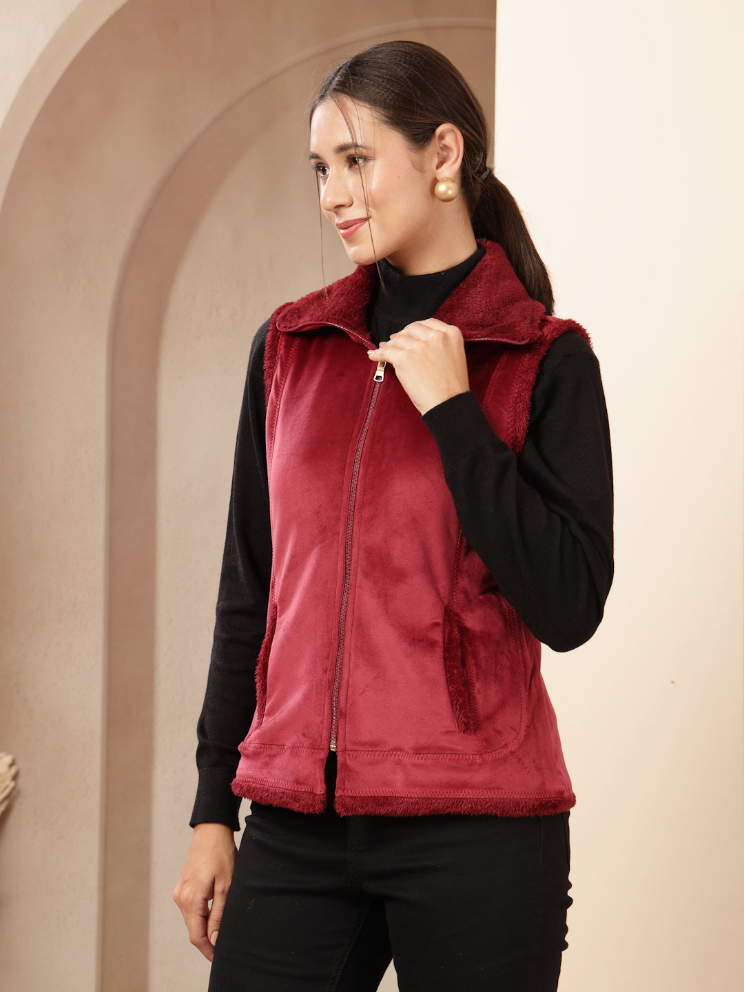 Velour Fur Sleeveless Jacket with Structured Collar & Zipper Closure