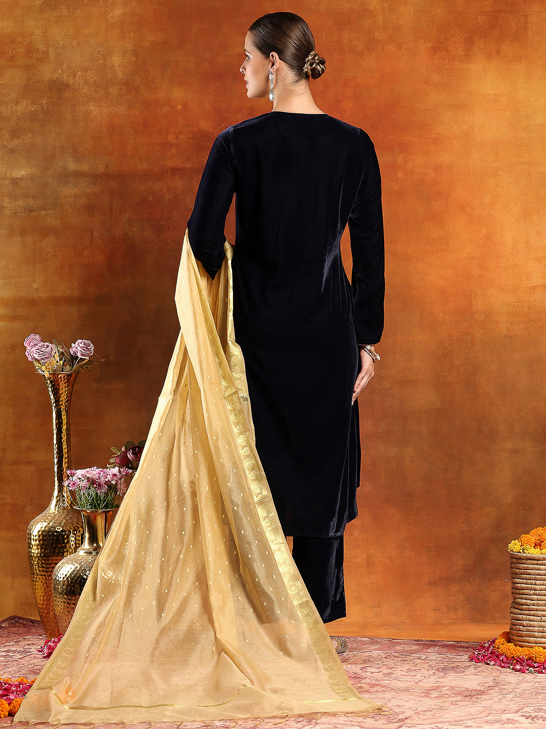 Velvet Kurta Set with Zari Embroidered Yoke with Palazzo & Art Silk Dupatta