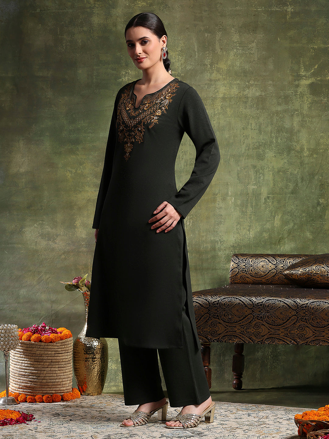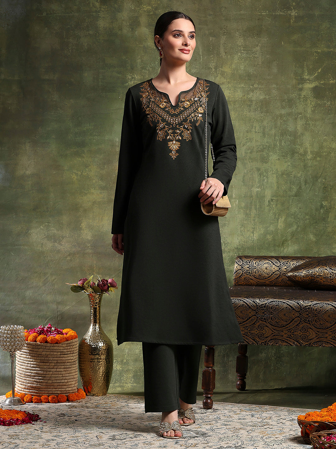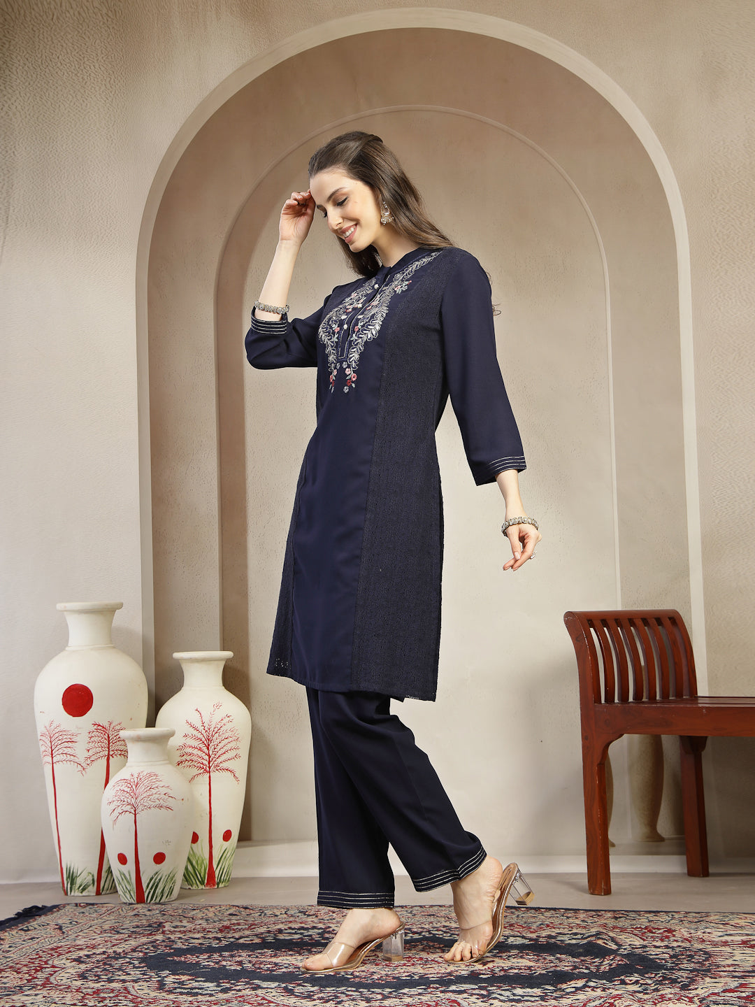 Denim Wool Kurta Set with Thread Embroidery & Palazzo