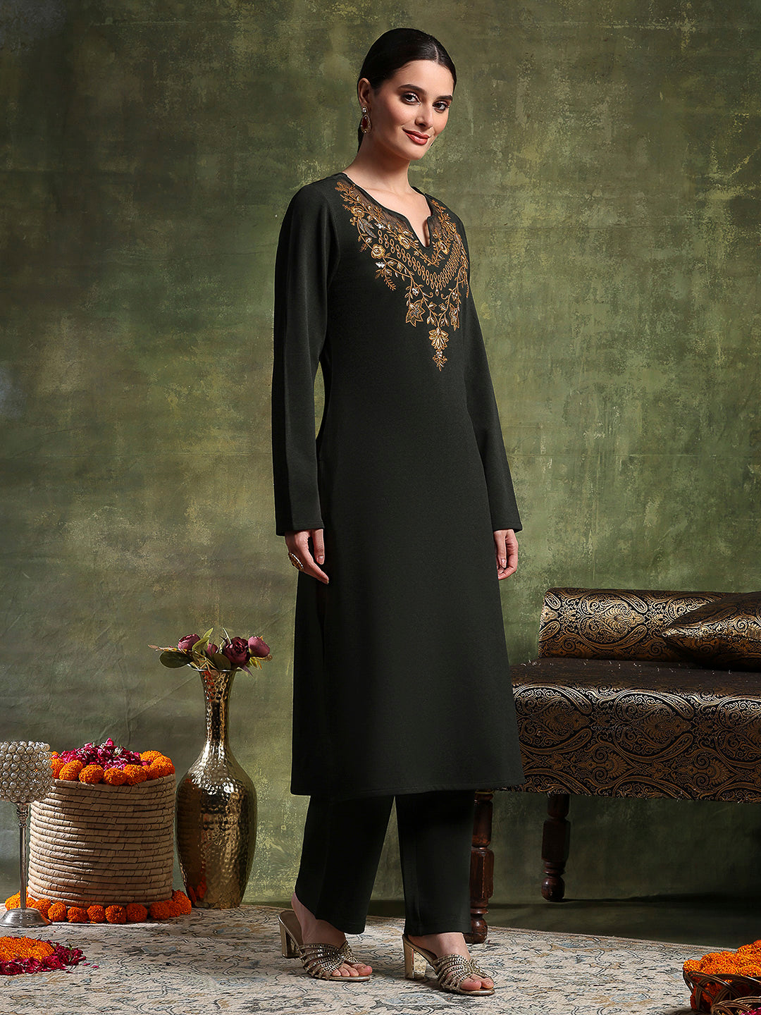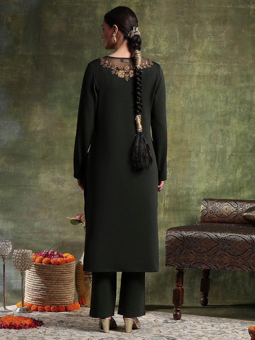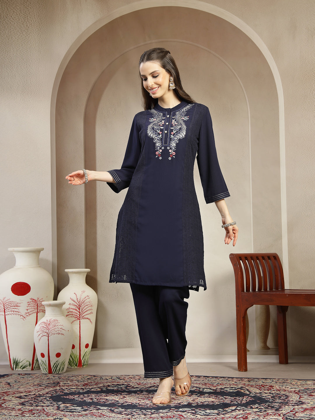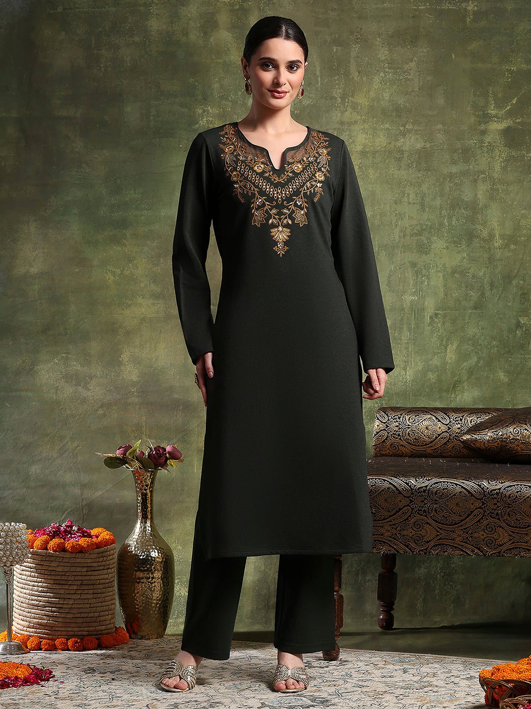 Denim Wool Kurta Set with Thread Embroidery & Palazzo